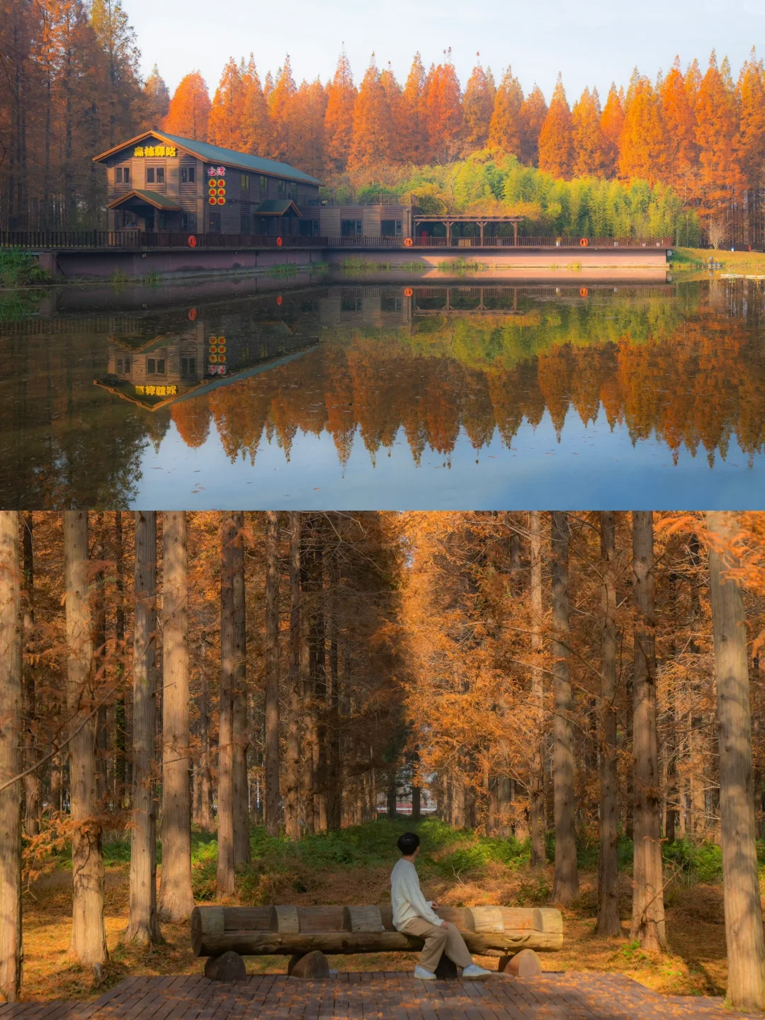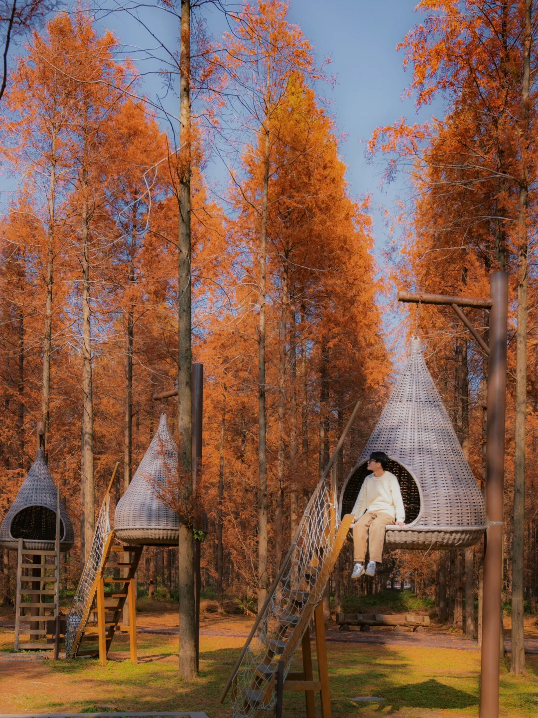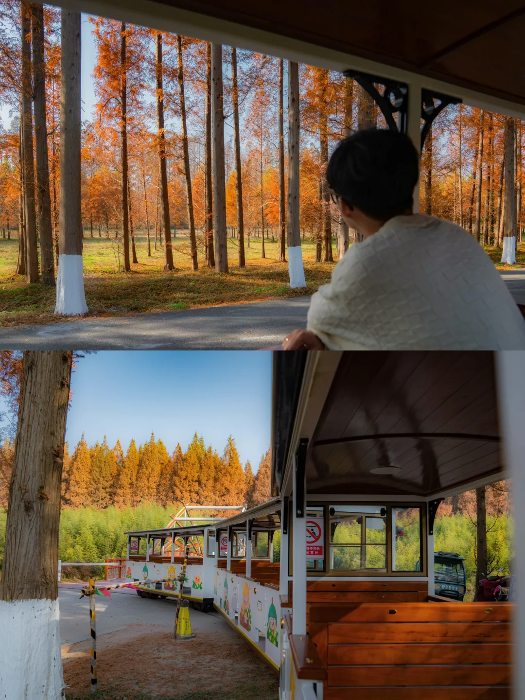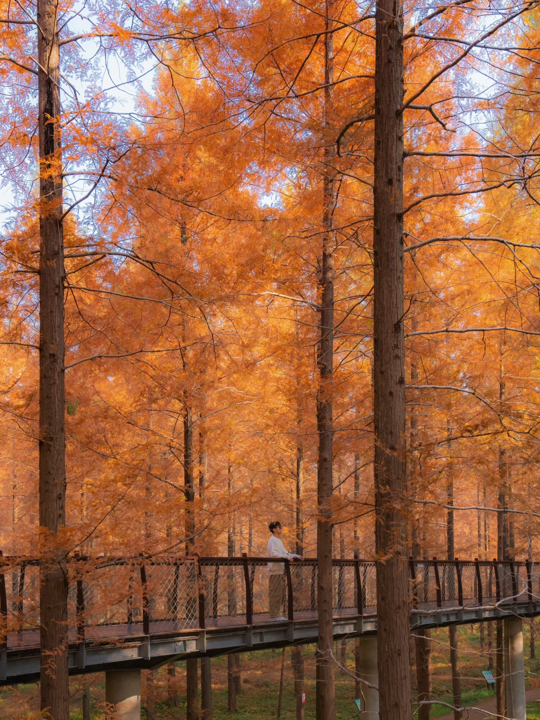 不是北欧,不是大理,不是喀纳斯 这里是江苏小众旅行地-盐城 水杉已经90%开始红了 秋天层林浸染,万亩林海向四周无尽蔓延 真的美的似一幅油画 仿佛童话世界一般 - 📍地点:江苏盐城东台黄海森林公园 🕐营业时间:8:30-17:00 🚌交通: ①自驾导航【东台黄海森林公园】 ②高铁至东台站后步行到东台汽车客运站坐大巴 🍂最佳赏秋时间:12月初-12月中下旬 - 🚶景区游玩:景区很大,全程大概8公里,徒步用时大约2-3h。 ⚠️可以在租电动车💰80r/h。 - 🌟游玩路线推荐 科普馆-水杉长廊-森林小火车-空中栈道-迷雾森林-森林之眼-木育森林-木屋群落 - 📷拍照打卡点 ▪️水杉长廊 入口处不远,大片的金黄的水杉倒映在水中宛如油画一般 ▪️森林小火车 乘坐森林小火车穿梭在林间,每个站点都可以上下车,懒人福音 ▪️空中栈道 悬空在半空林间步道,沉浸式走进大自然,视野开阔,万亩林海即在眼前。 ▪️迷雾森林 会不定时喷水,瞬间大雾四起。还有小松鼠互动、迷雾幻境、迷雾花镜等玩乐。 ▪️森林之眼 登上最高点俯瞰整片森林,累了就顺着顶部滑梯“一滑到底”,来一场林间速度与激情。 ▪️木屋群落 藏在森林里的小木屋,像极了童话故事世界里的木屋。 -