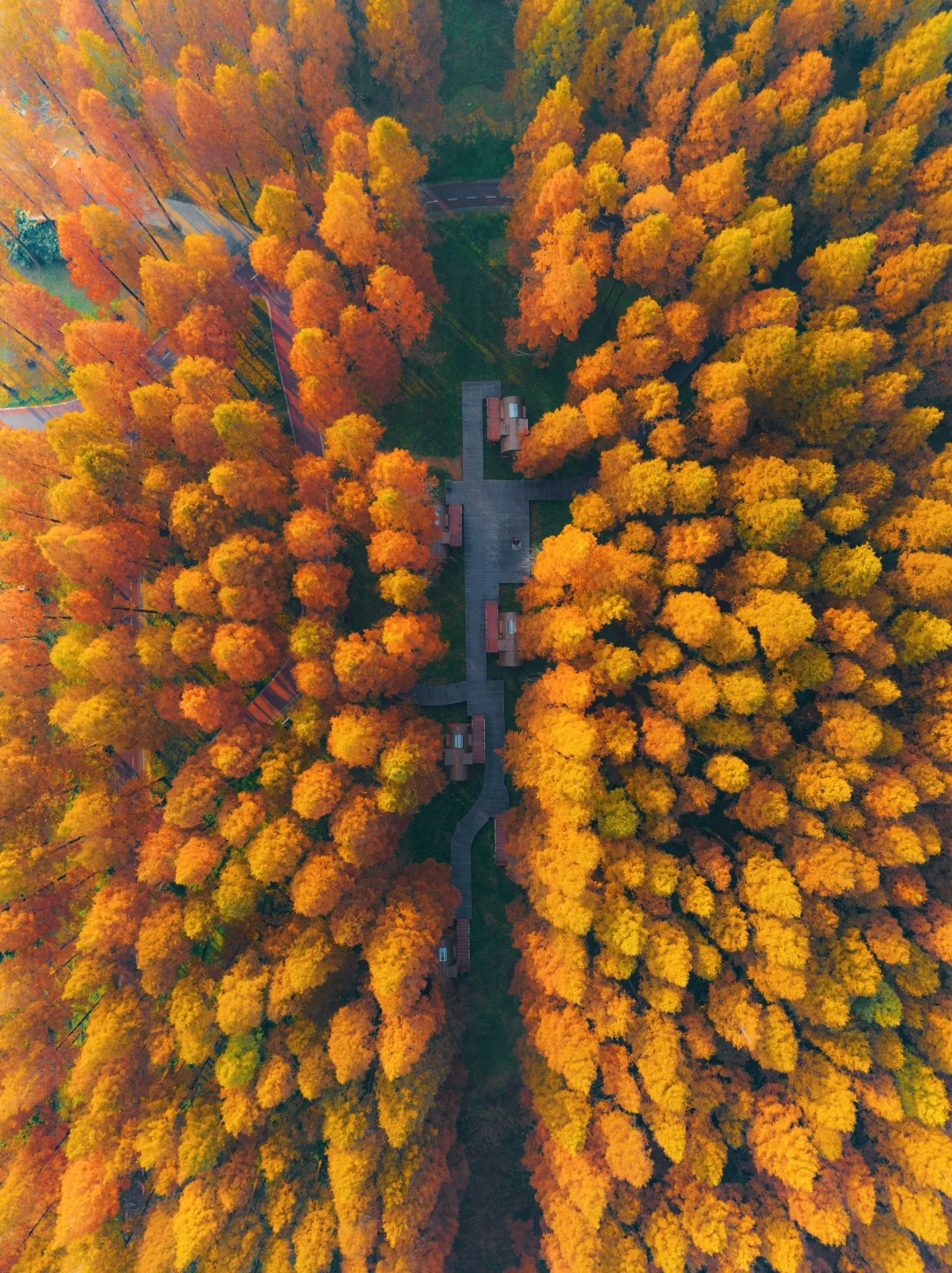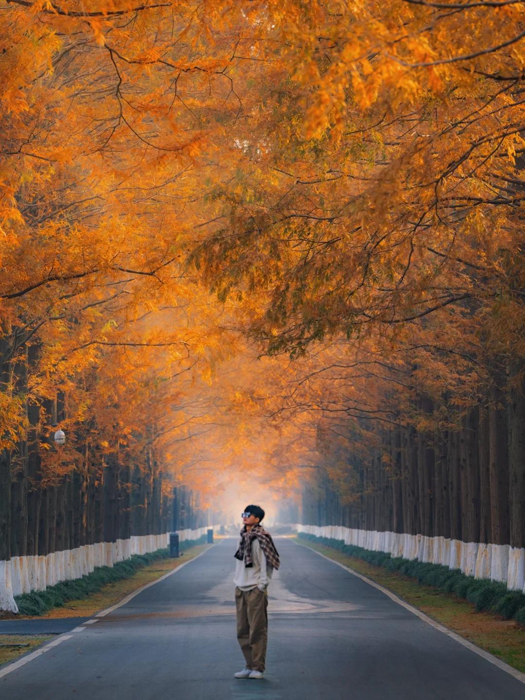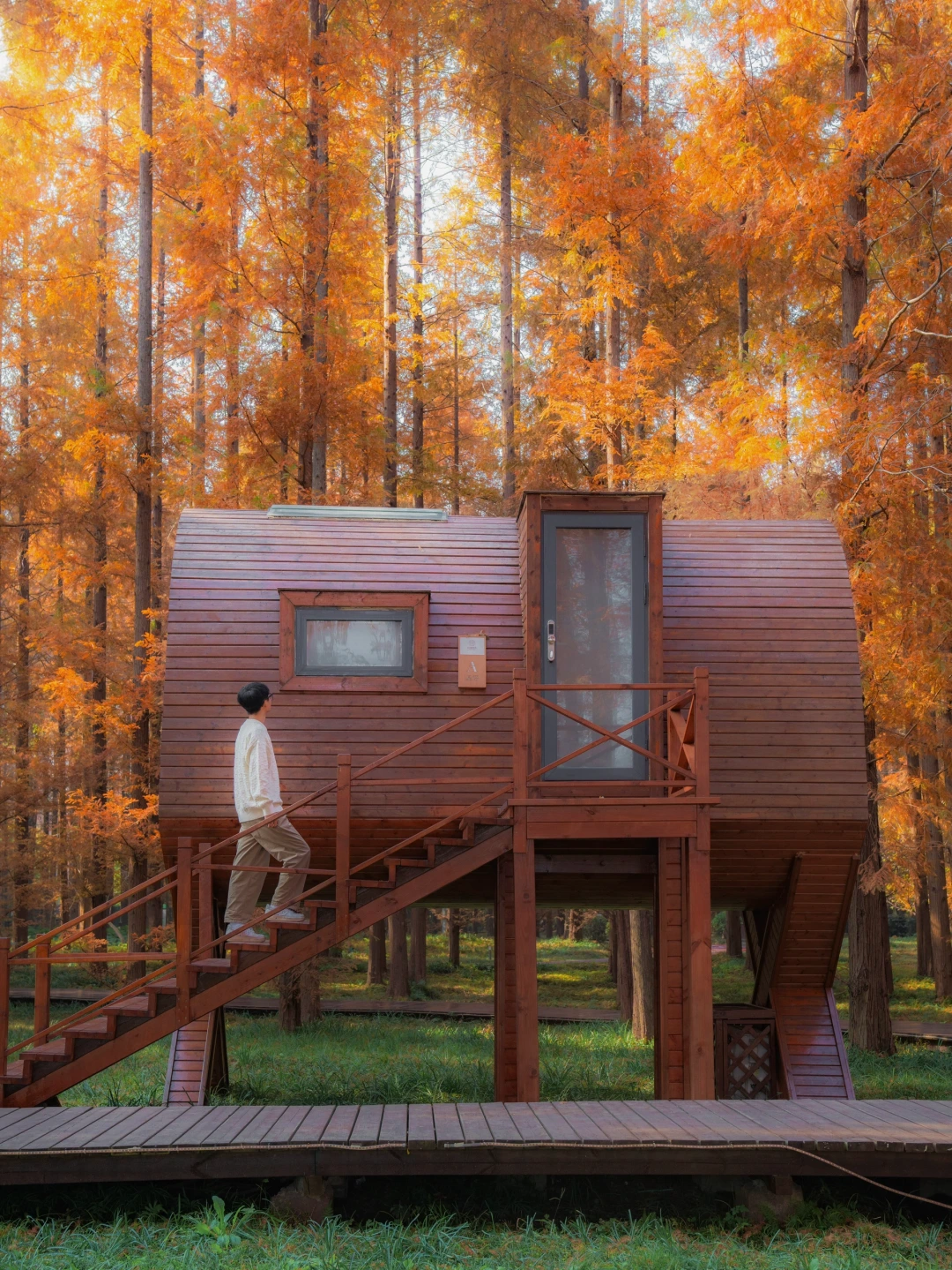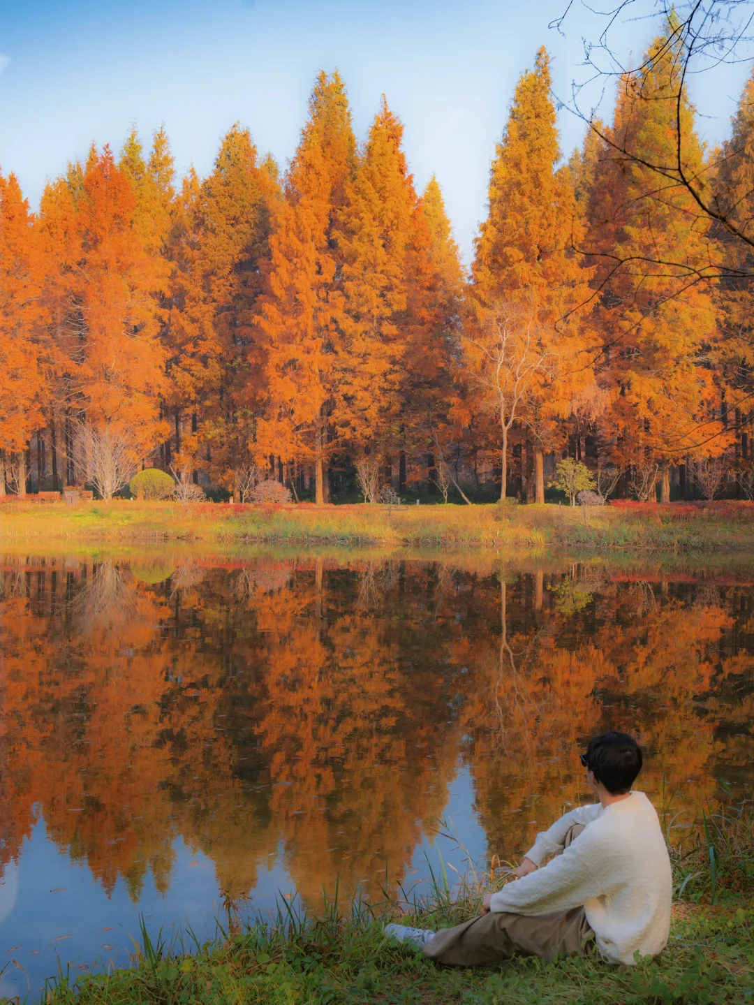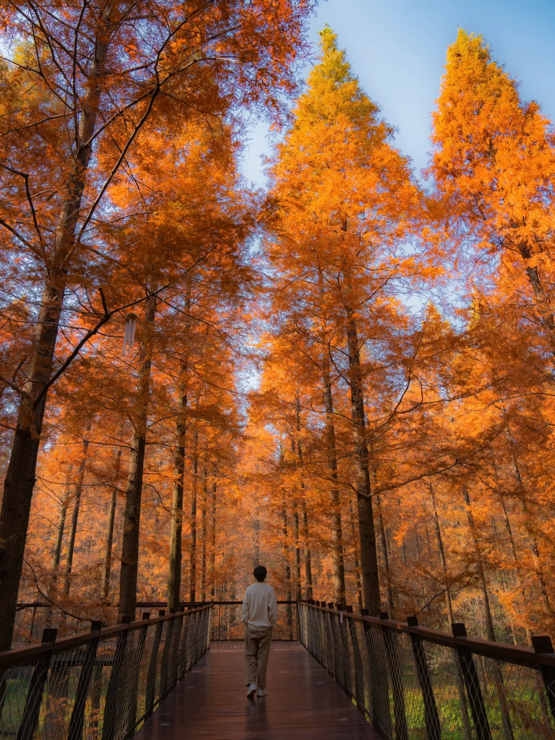 不是北欧,不是大理,不是喀纳斯 这里是江苏小众旅行地-盐城 水杉已经90%开始红了 秋天层林浸染,万亩林海向四周无尽蔓延 真的美的似一幅油画 仿佛童话世界一般 - 📍地点:江苏盐城东台黄海森林公园 🕐营业时间:8:30-17:00 🚌交通: ①自驾导航【东台黄海森林公园】 ②高铁至东台站后步行到东台汽车客运站坐大巴 🍂最佳赏秋时间:12月初-12月中下旬 - 🚶景区游玩:景区很大,全程大概8公里,徒步用时大约2-3h。 ⚠️可以在租电动车💰80r/h。 - 🌟游玩路线推荐 科普馆-水杉长廊-森林小火车-空中栈道-迷雾森林-森林之眼-木育森林-木屋群落 - 📷拍照打卡点 ▪️水杉长廊 入口处不远,大片的金黄的水杉倒映在水中宛如油画一般 ▪️森林小火车 乘坐森林小火车穿梭在林间,每个站点都可以上下车,懒人福音 ▪️空中栈道 悬空在半空林间步道,沉浸式走进大自然,视野开阔,万亩林海即在眼前。 ▪️迷雾森林 会不定时喷水,瞬间大雾四起。还有小松鼠互动、迷雾幻境、迷雾花镜等玩乐。 ▪️森林之眼 登上最高点俯瞰整片森林,累了就顺着顶部滑梯“一滑到底”,来一场林间速度与激情。 ▪️木屋群落 藏在森林里的小木屋,像极了童话故事世界里的木屋。 -