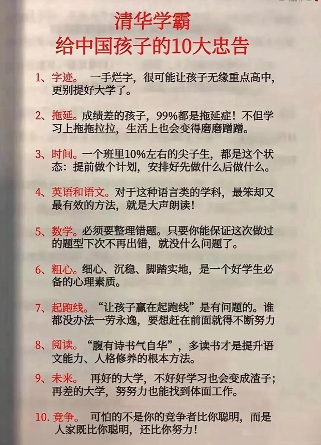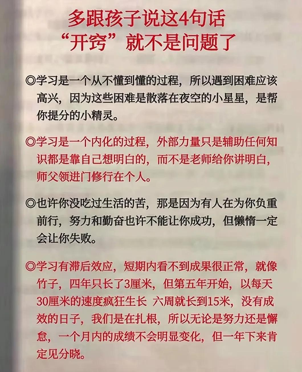 班主任的肺腑之言,不要怪孩子成绩差,是没人告诉他“方法”、考试后一定要问孩子这五句话,孩子会越来越爱学习! 清华学霸给中国孩子的10大忠告; 孩子这四点不改,大概率与大学是无缘了; 13岁前不给孩子讲这8个道理就晚了; “三个不管”陪娃写作业轻松养出学霸娃; 多跟孩子说这4句话,“开窍”就不是问题了; 孩子伸手要钱时,你的态度影响孩子的一生 “985”和“211”的区别,父母一定要告诉孩子…… 懂得和孩子一起成长,家庭才越来越幸福。父母跟孩子的沟通话术,能影响孩子的一生! 小学霸妈妈的49项修炼,是站在孩子的角度解答了49个常见的问题,49个解决方案,从孩子的规划、目标、学习、兴趣、习惯、生活六个方面分享学霸妈妈的育儿秘籍。赶紧来修炼自己! 学霸妈妈修炼亲子共读