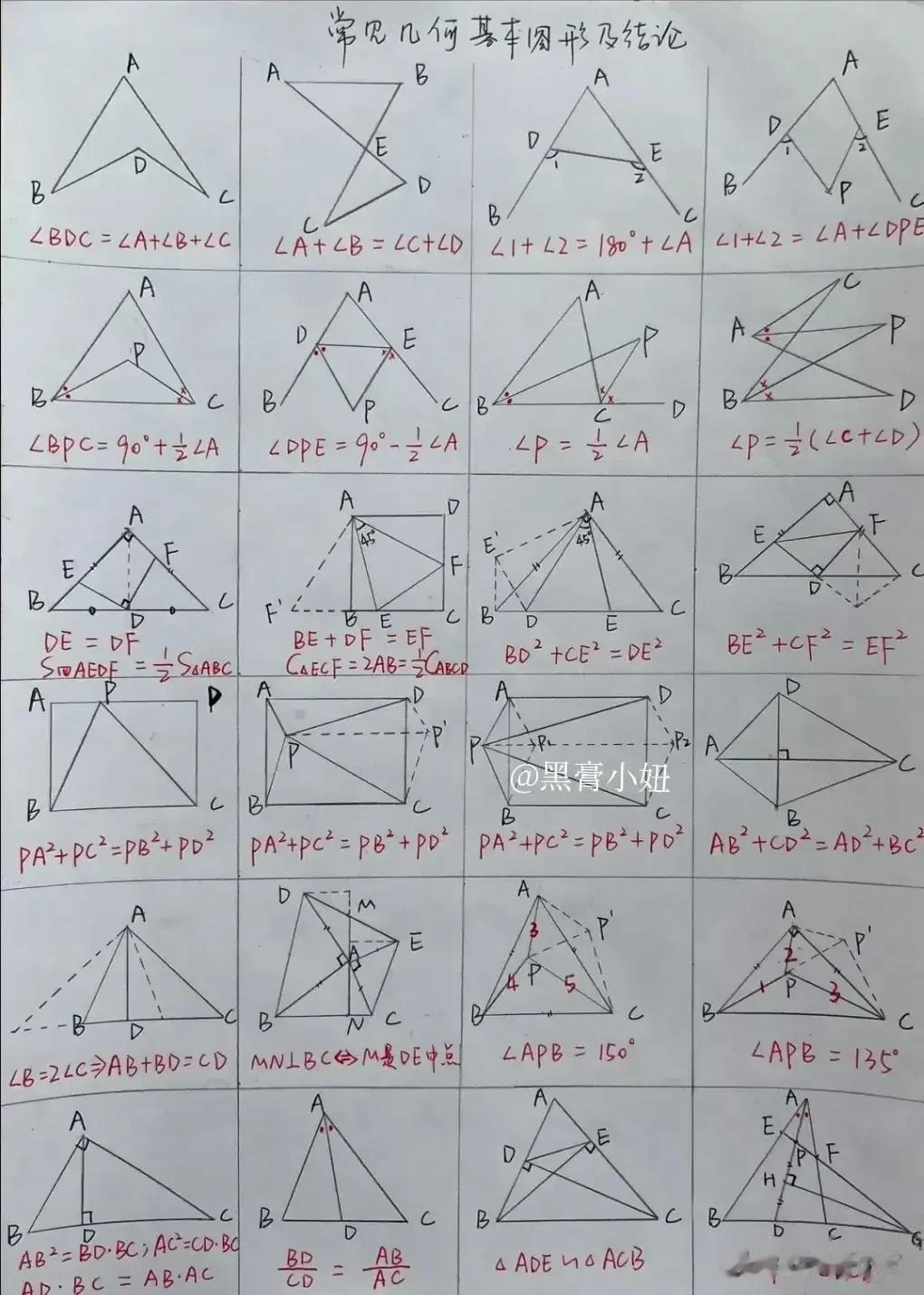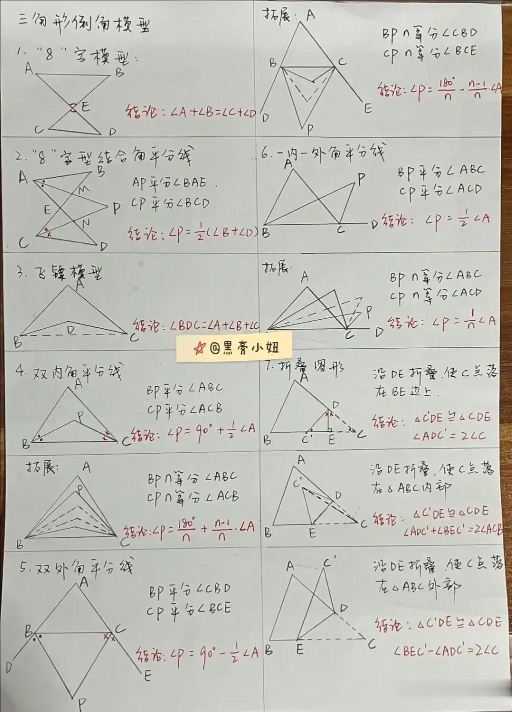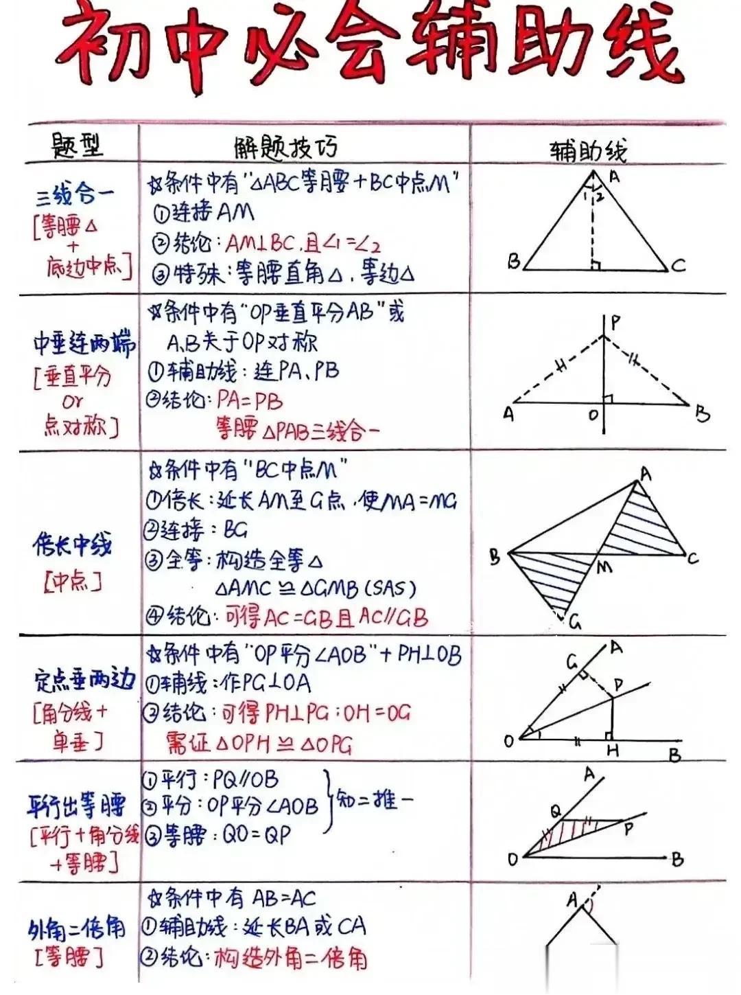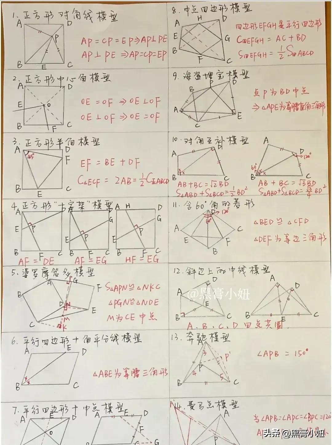 不愧是北大学霸爸爸,为了让上初中的女儿学好数学,手写整理出来几何模型,看完之后,简直太专业了!没有比这份资料更贴心的了,什么辅助线口诀技巧、模型及结论、模型动态图,孩子学完后,考试果然次次不下120分,数学老师都赞叹不已。家有孩子的赶紧收藏!让孩子抓紧时间学一学,练一练,熟练掌握并灵活运用这些知识点,数学轻松拿高分! 初中四大金刚几何模型