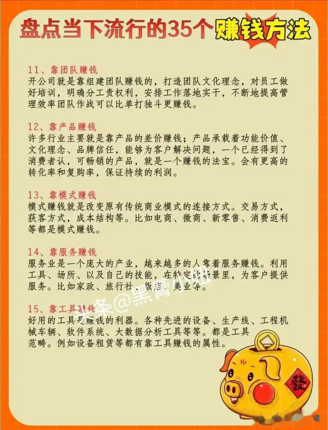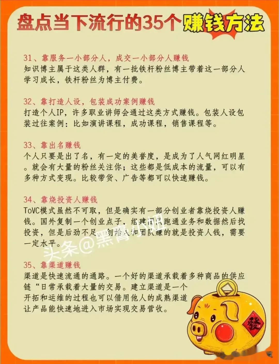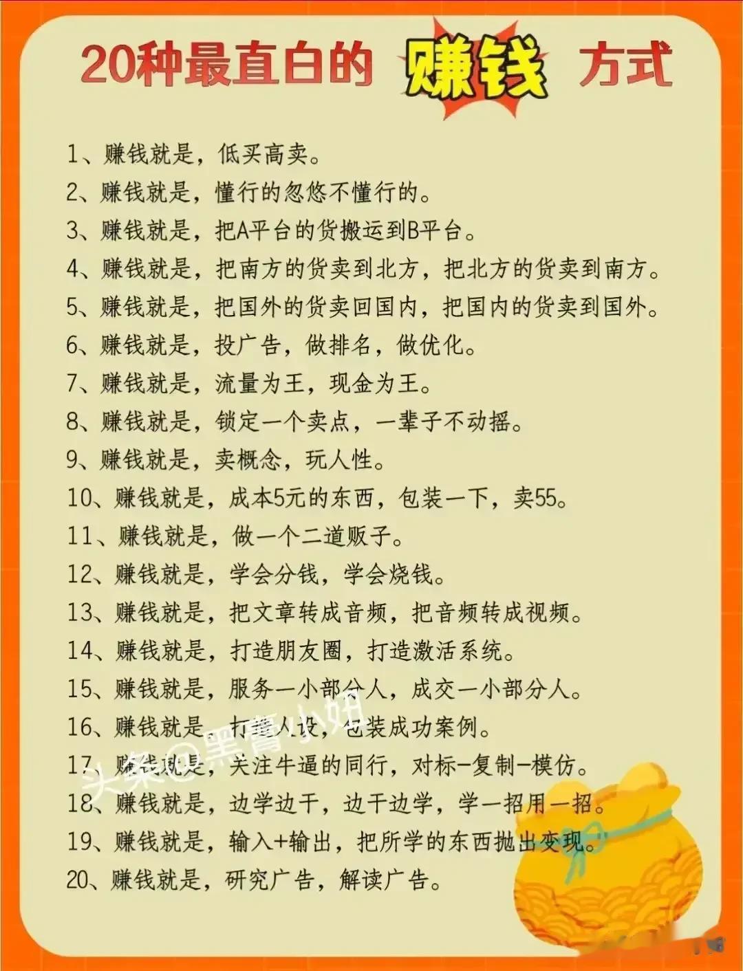 天啦!真的万万没想到,搞钱还有万能公式!赚钱的方式有一万种,却只知道打工;套用这些方式和公式,你就知道赚钱的底层逻辑,在搞钱路上助你如鱼得水!赶紧学起来!让你的财富稳步增值! 当你一天能赚好几万的时候,你就会发现, 通过勤劳只能解决温饱,赚大钱的底层逻辑,绝不是出卖时间和劳力,发大财靠的是,脑子和眼光,还有机遇!看完之后,真的后悔的知道太迟了! 如果你还不确定怎么提高认知,赚钱的逻辑,下方这套一定会带给你一个全新的认知。