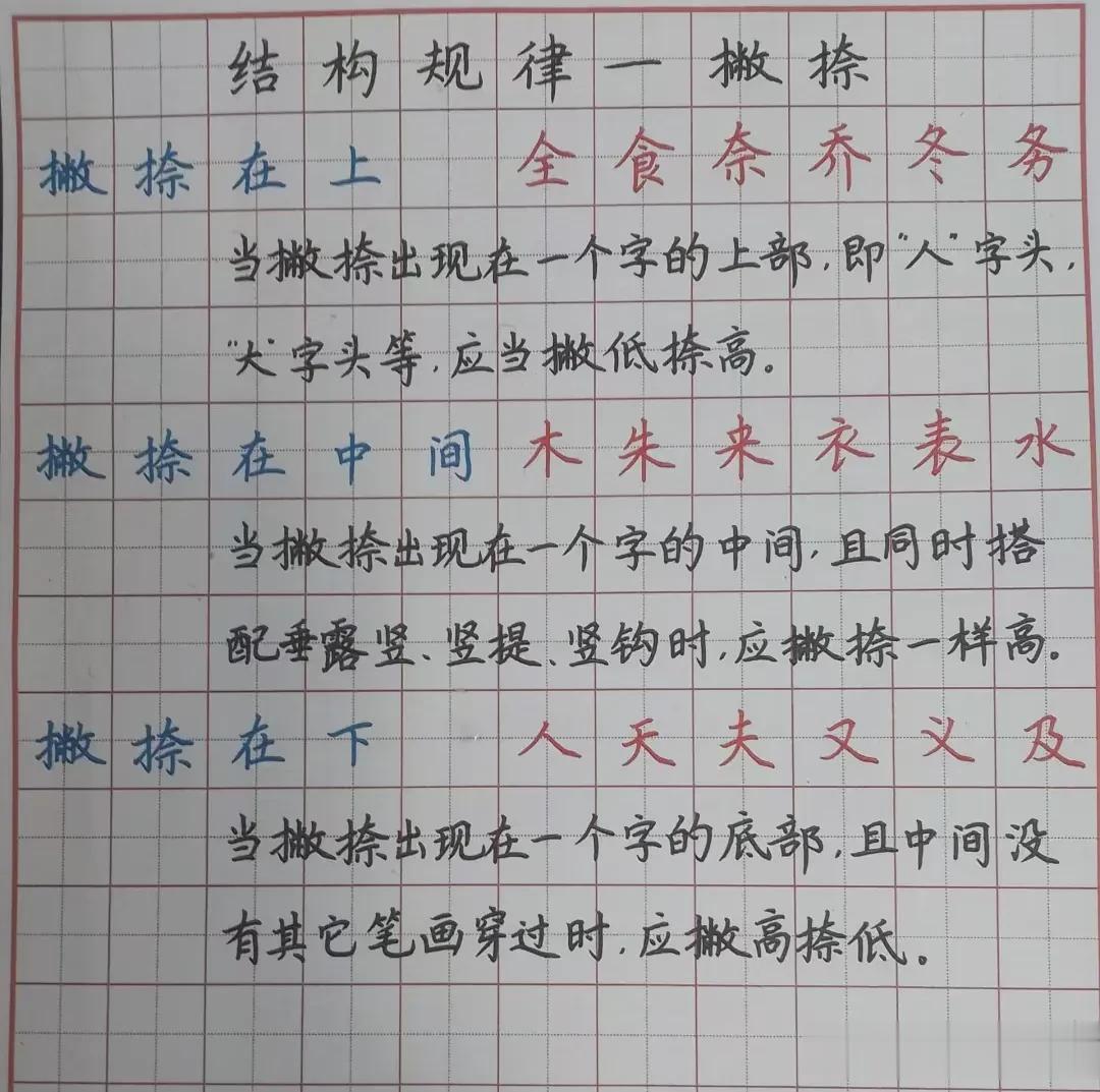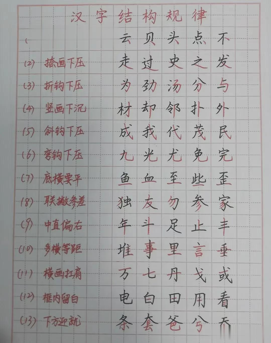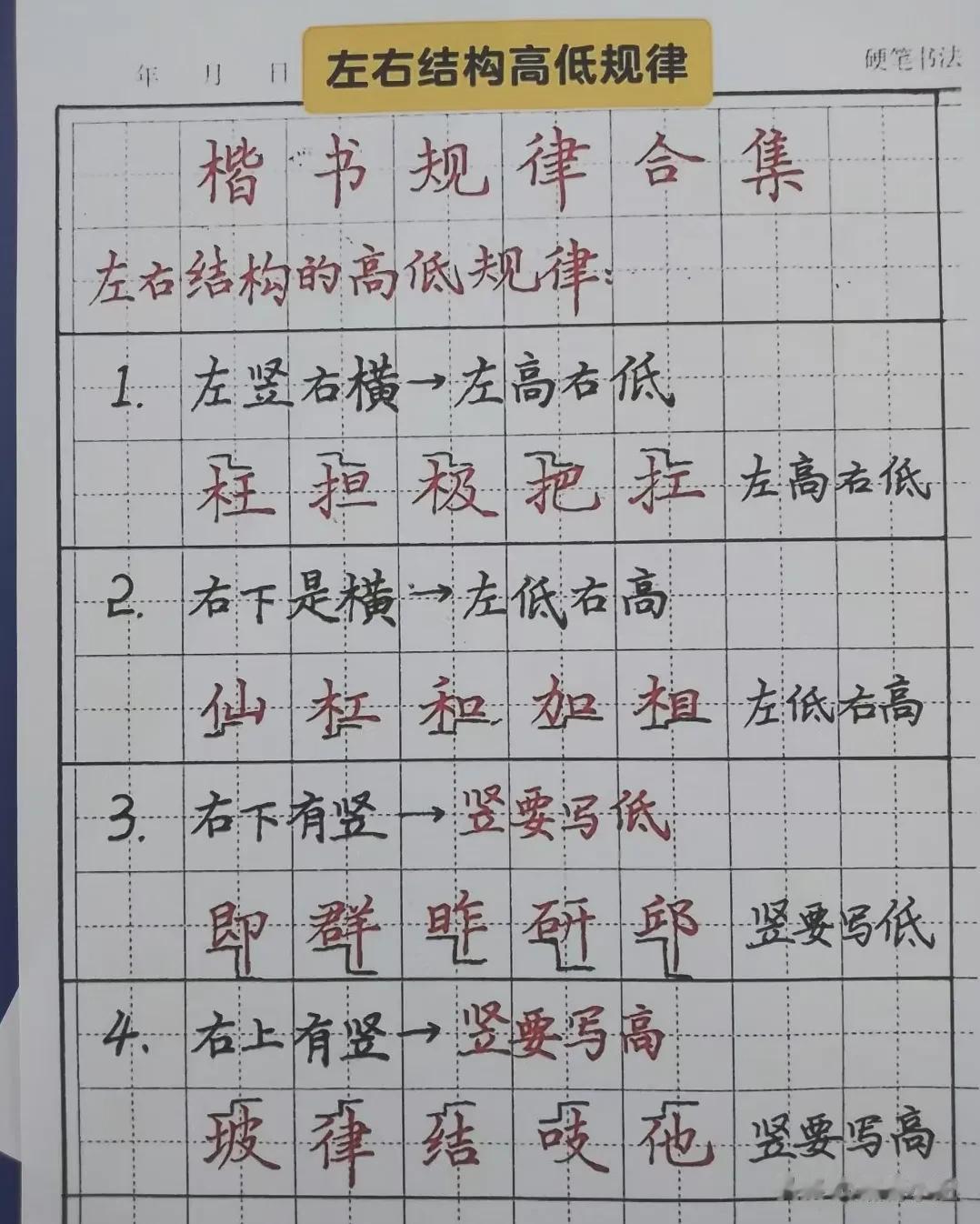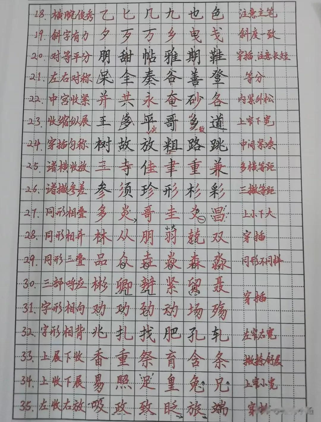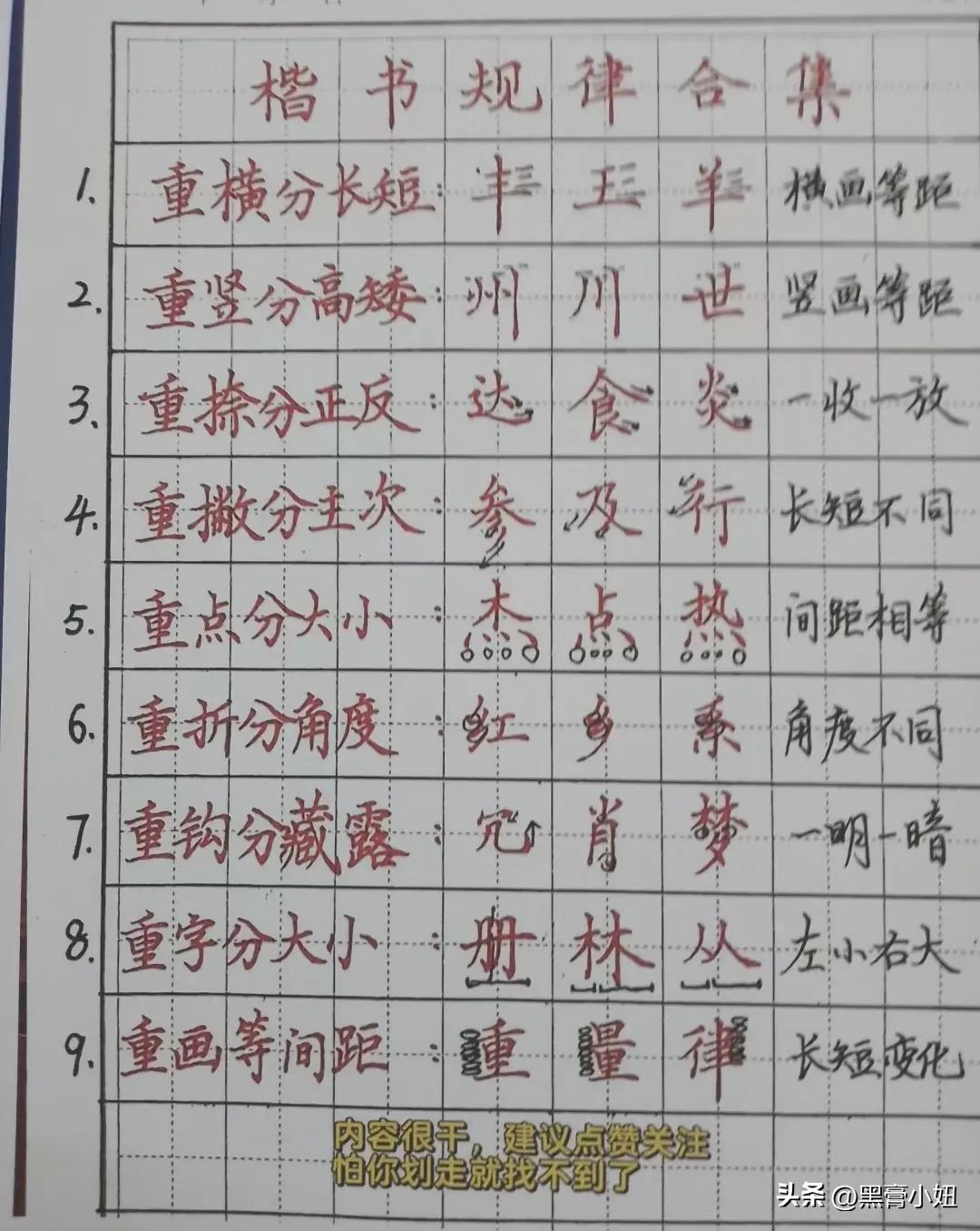 女儿书法班练字收效甚微,直到我看到这个,像突然开窍了一样。 光模仿字帖是不行的,一定要注意笔画与各种结构的字的书写规律。汉字书写规律(全部总结),什么间架结构、控笔练习、基本笔画、楷书结构规律、左右结构规律等,没事多看一看讲解并反复练习,持之以恒坚持下来,宝贝们的字一定会越写越好的。 硬笔书法练字帖教程