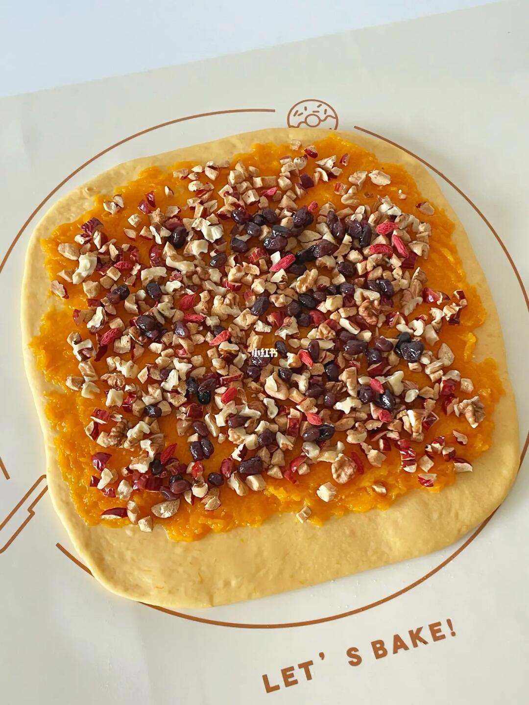 3️⃣均匀涂抹南瓜泥,再撒上红枣核桃蜜豆枸杞,卷起捏拢后切割。