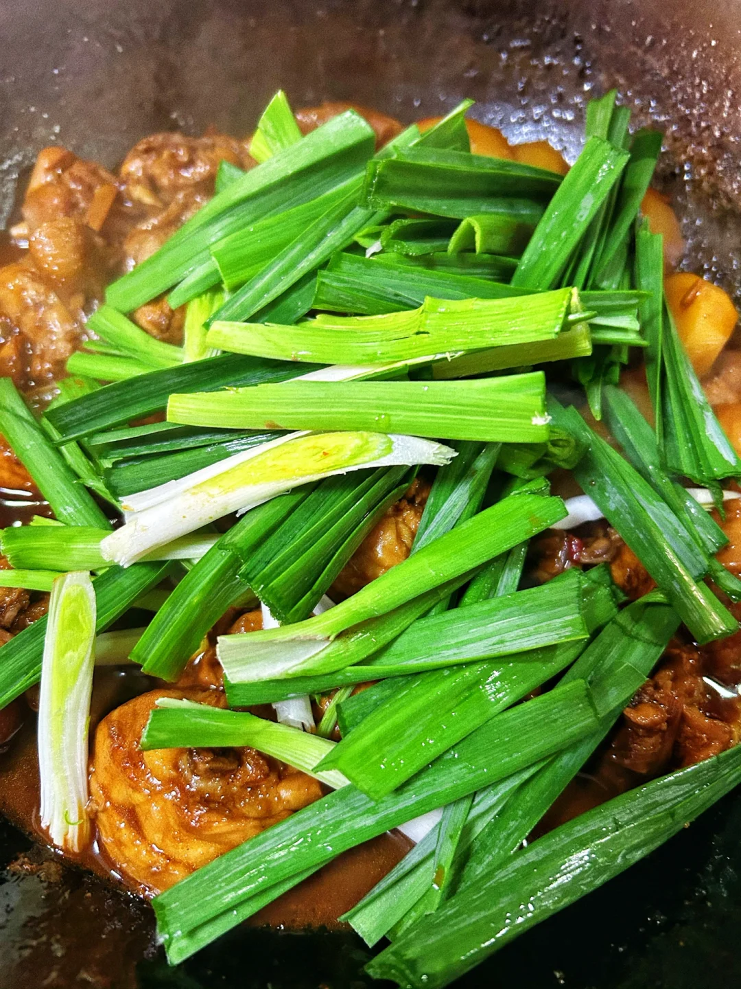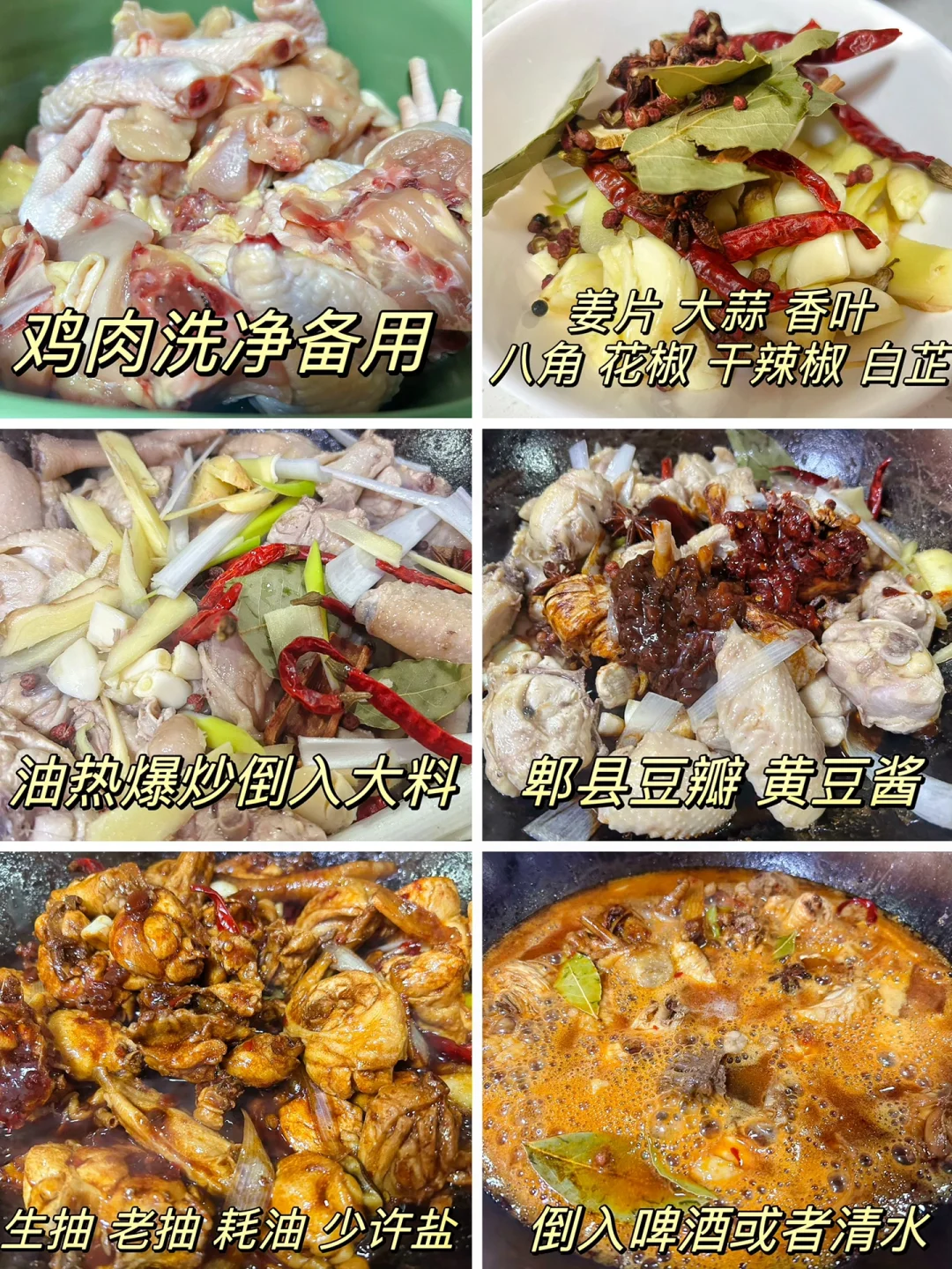2⃣️油热倒入鸡肉爆香,表面微黄后倒入料酒烧干,倒入配料,豆瓣酱,黄豆酱翻炒,倒入生抽,老抽,蚝油,少许盐,一瓶啤酒(也可以倒入清水)大火烧开,喜欢吃软烂的,中途再添一次水,收汁后加大蒜叶,白胡椒,鸡精翻炒出锅