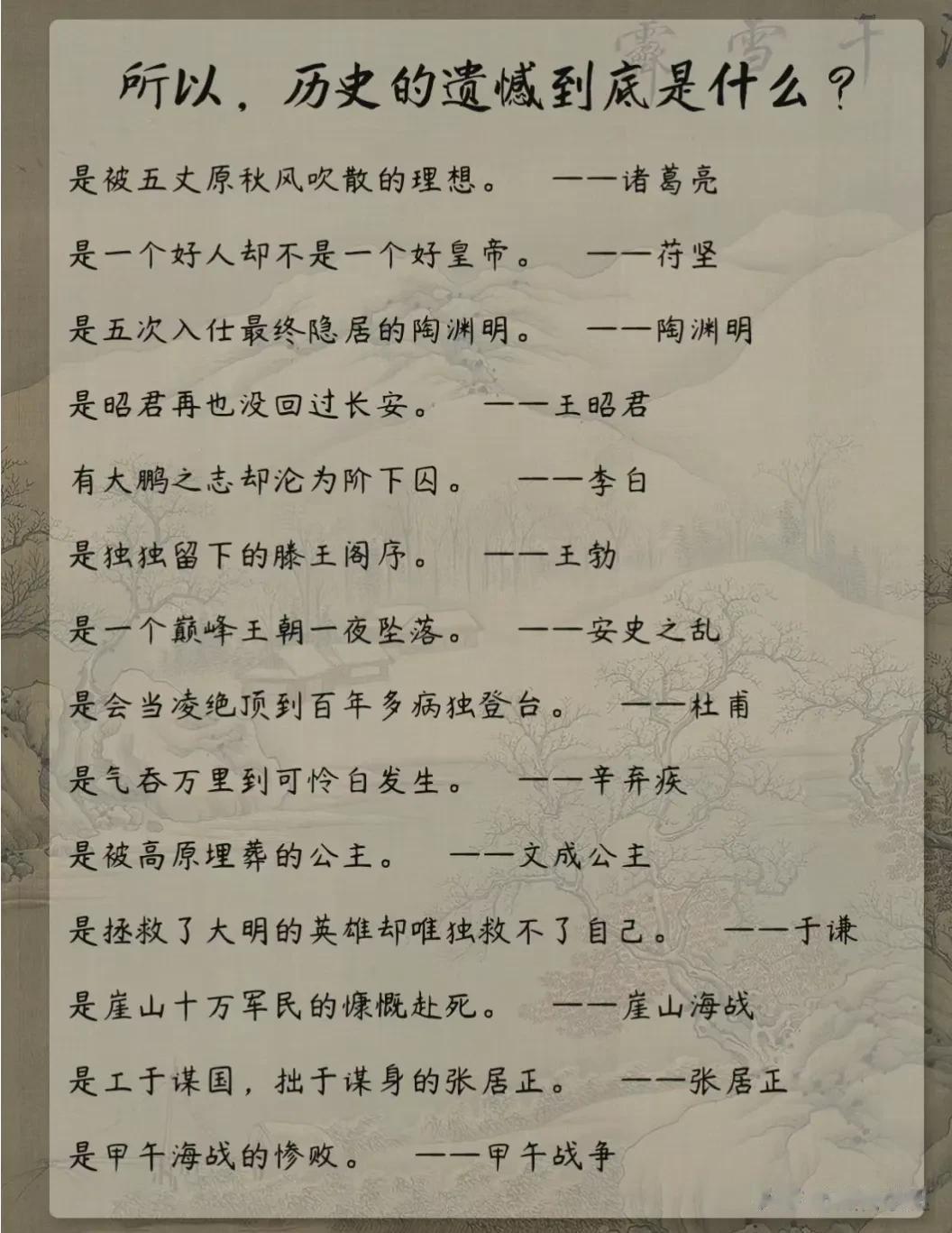 厉害!有人竟然将历史的遗憾到底是什么总结出来了?是颠沛流离一生都未能实现的理想。是一匡天下却被活活饿死的春秋霸主。是死在变法下的变法者。是短暂的帝国留下的统一梦……以前上学时一直都不喜欢历史,谁能想到工作后却对历史越发感兴趣。[捂脸]#妙笔生花创作挑战# #记录我的2023#
