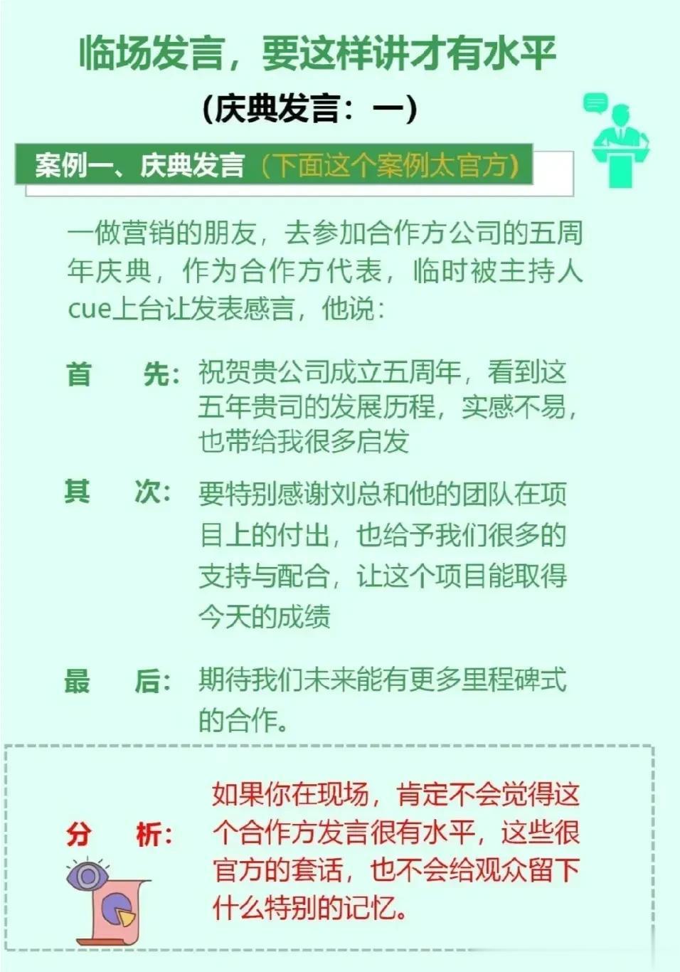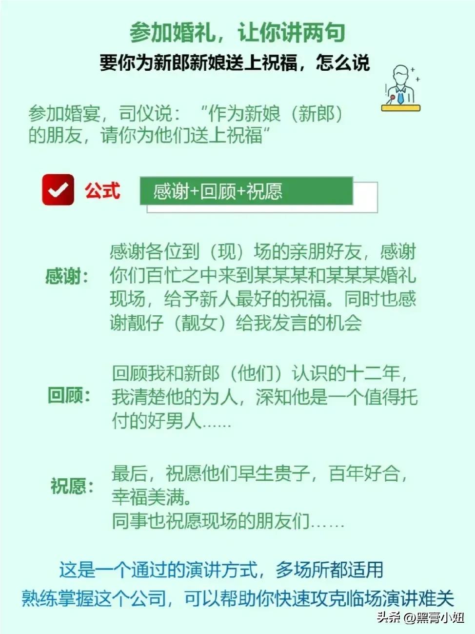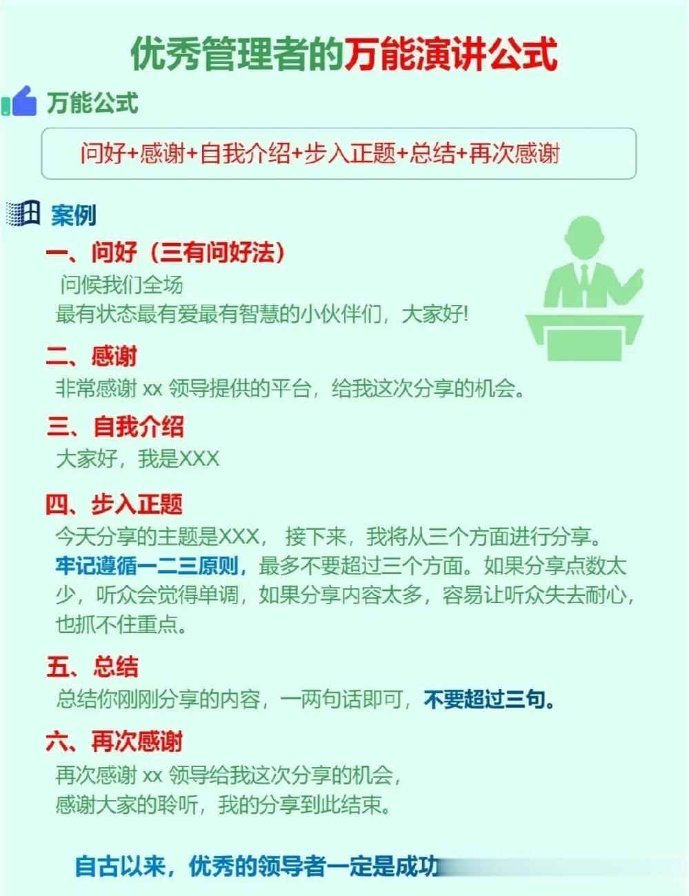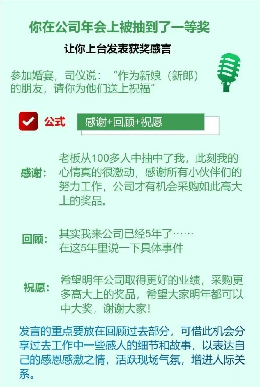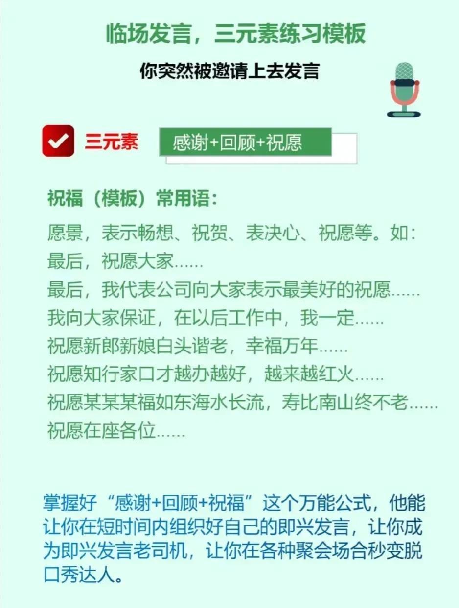 天呐!万万没想到,原来工作中还有万能演讲公式!看完之后,简直太惊艳了,太实用了,表达能力差的人,强烈建议你背下来,狠狠提升自我,成为优秀管理者,这样才能让同事、领导、客户都对你刮目相看。 年底了,工作汇报,年底总结,同事盆友聚餐,学一学,让你成为即兴发言老司机,秒变脱口秀达人,惊艳所有人。 没事多练一练,当你学会即兴演讲以后,你会发现自己混得更加如鱼得水,左右逢源!
