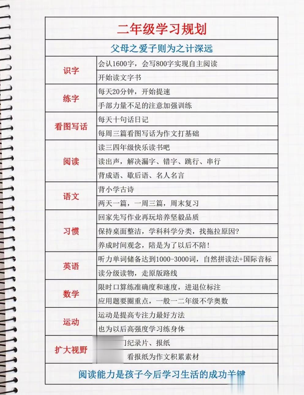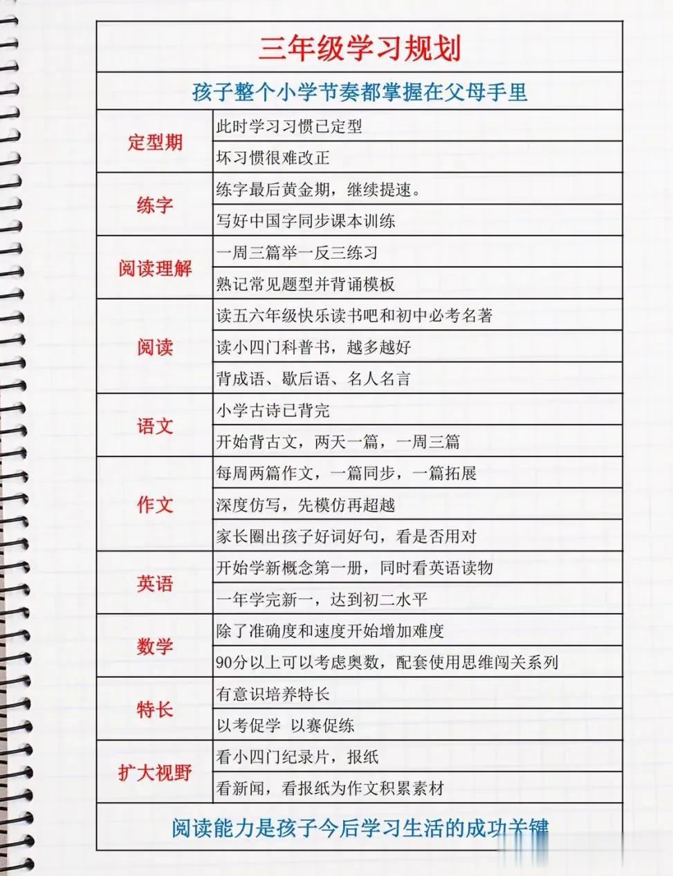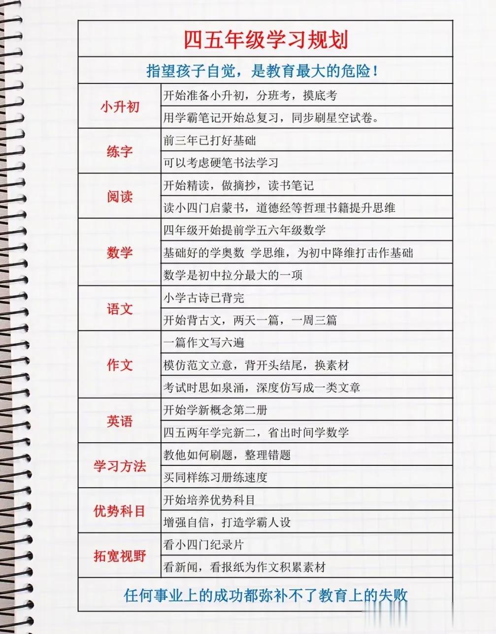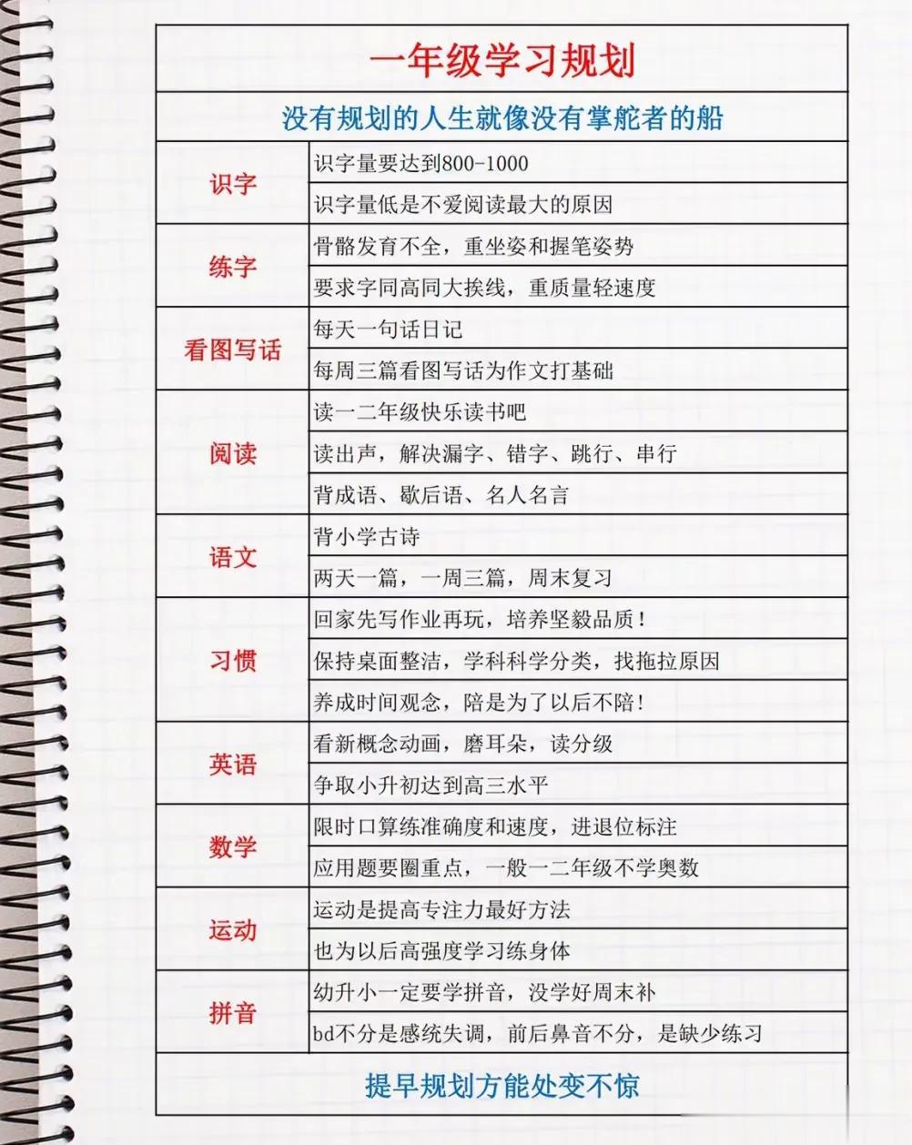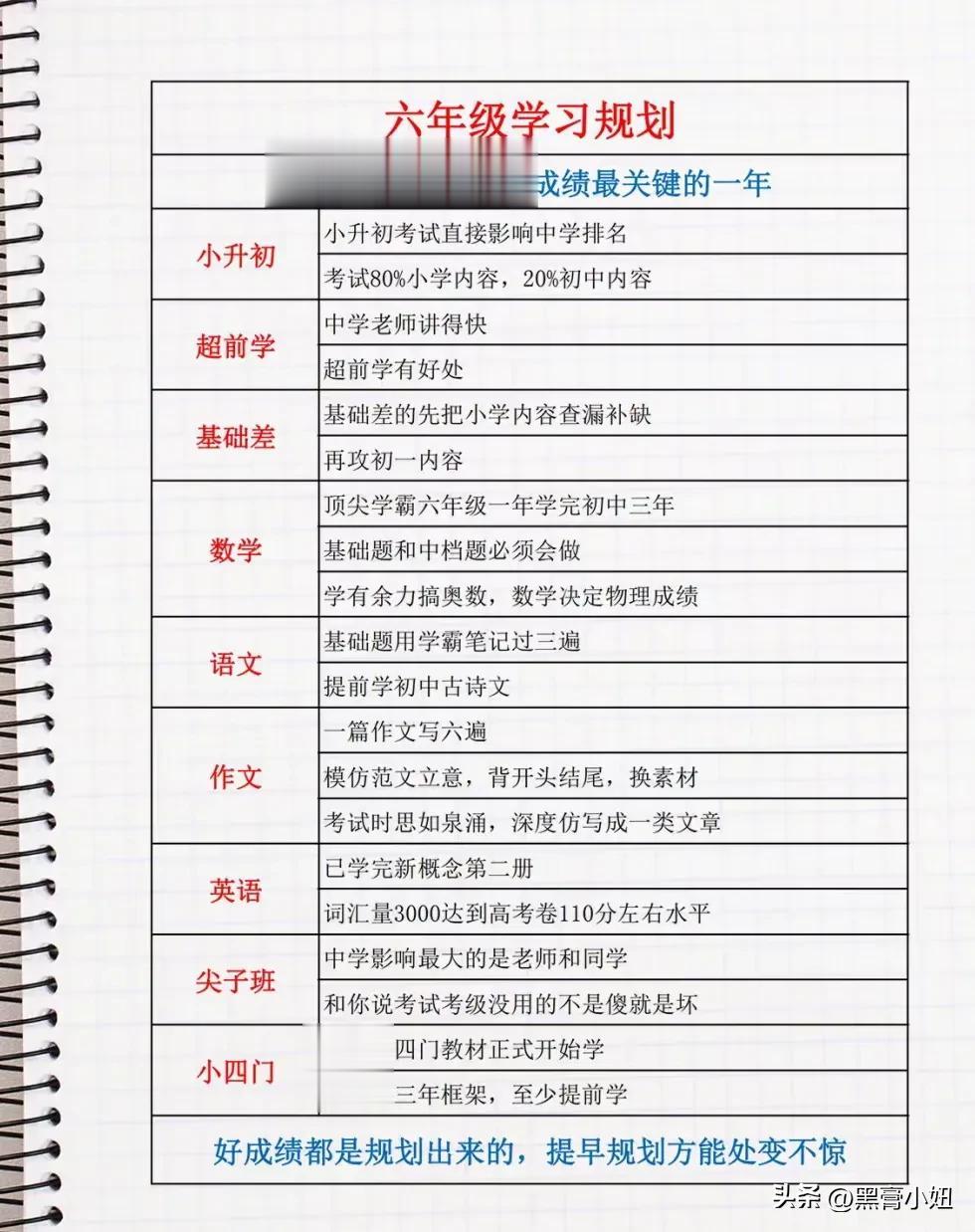 一位海淀区学霸妈妈直言:没有规划的人生就像没有掌舵者的船,从小规划的目的,至少能上高中不被过早分流,最好能上重点高中!并给孩子整理出来一份1-6年级牛孩学习规划计划!看完之后,简直太惊艳了!难怪会如此火!涵盖练字、阅读理解、阅读、语文、作文、英语、数学、特长、扩大视野等等,每一个年级的计划都不同,真所谓:妈妈会规划,孩子成学霸!赶紧行动起来! 学霸养成指南教育指南