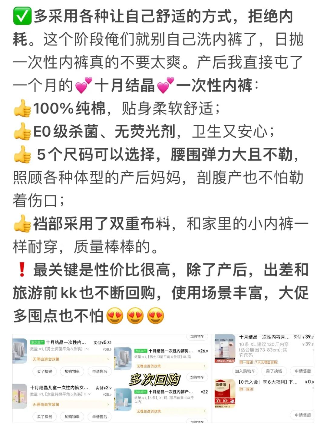 比如产后就不要给自己增加劳累,完完全全可以选择【十月结晶一次性内裤】给自己减少洗内内的工作量,它家一次性内裤不仅是100%纯棉、E0级灭菌,同时穿着特别柔软舒适,裤腰宽松不勒、裆部也双层加厚耐磨耐用和家里小内裤一样。一天一包次抛使用,不要太舒服哦。