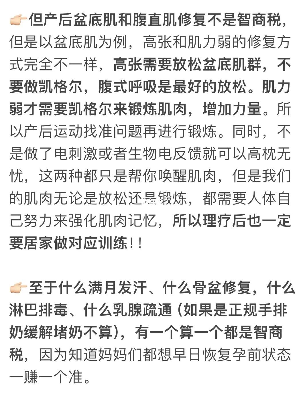 比如盆底肌和腹直肌也有自己的锻炼方式不是做了理疗就可以高枕无忧