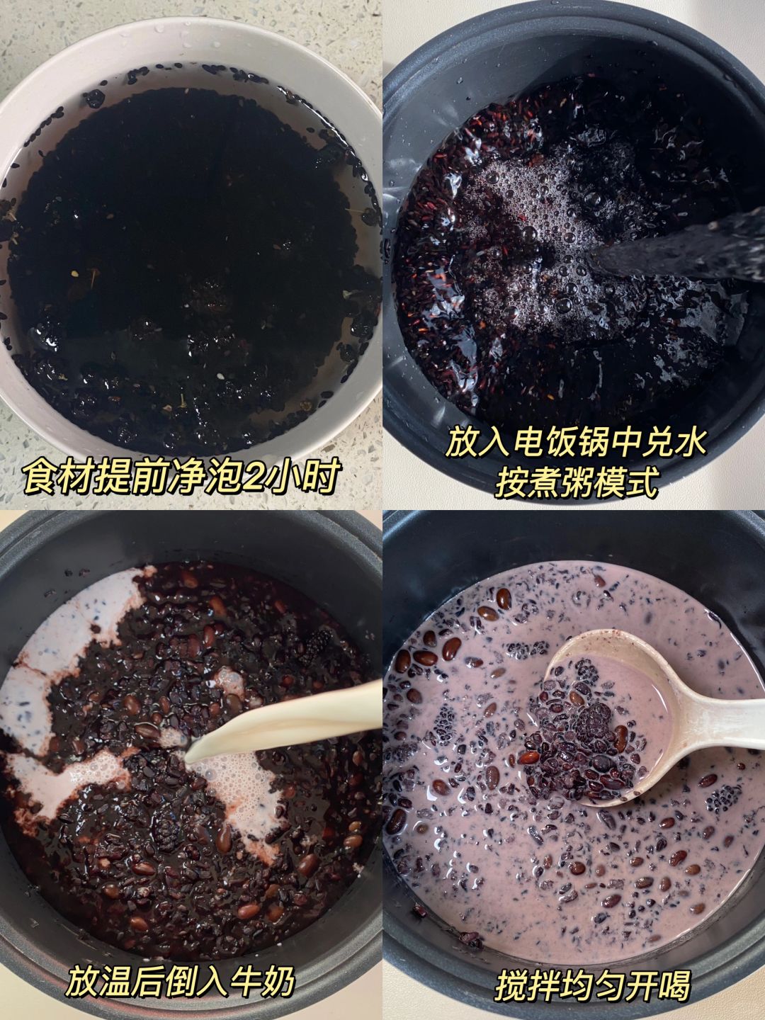🥣做法:食材提前净泡2小时、洗净放入电饭锅加入适量清水,按煮粥模式,煮好后加入牛奶搅拌