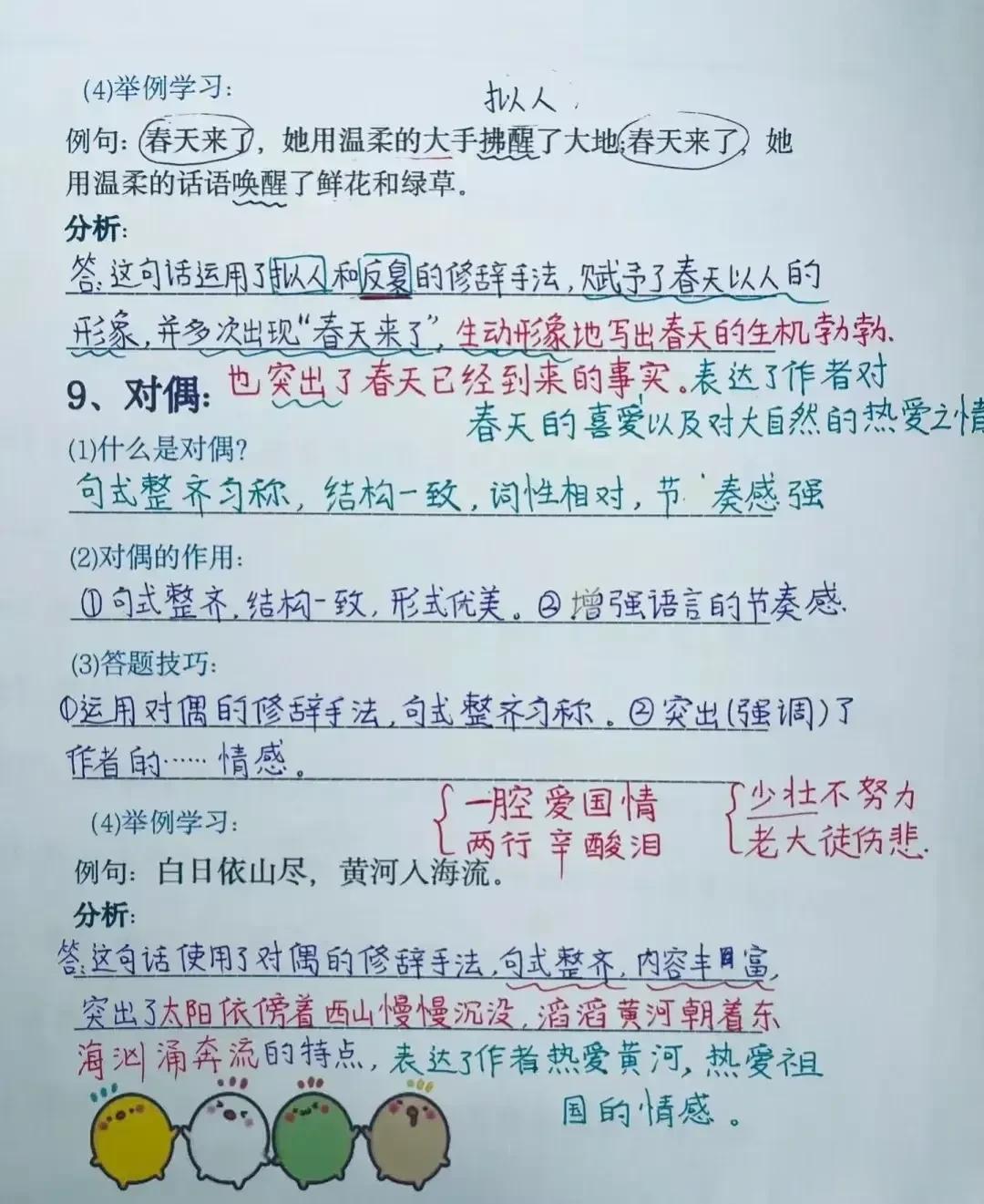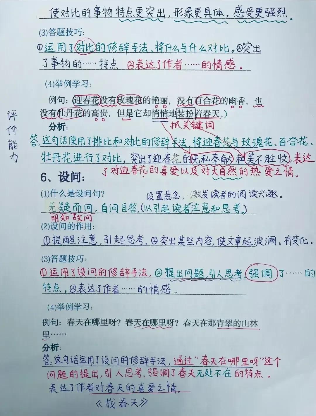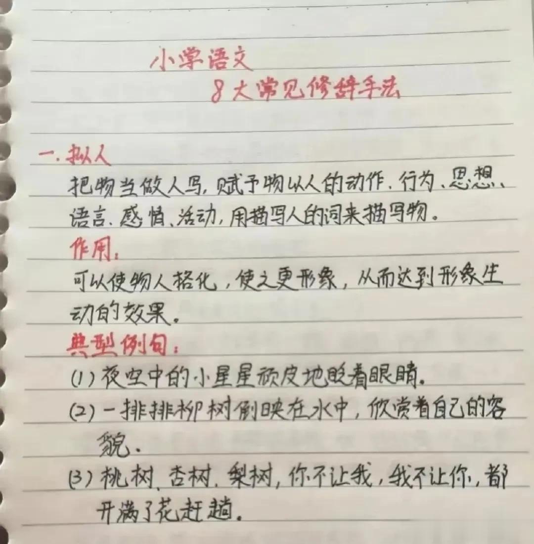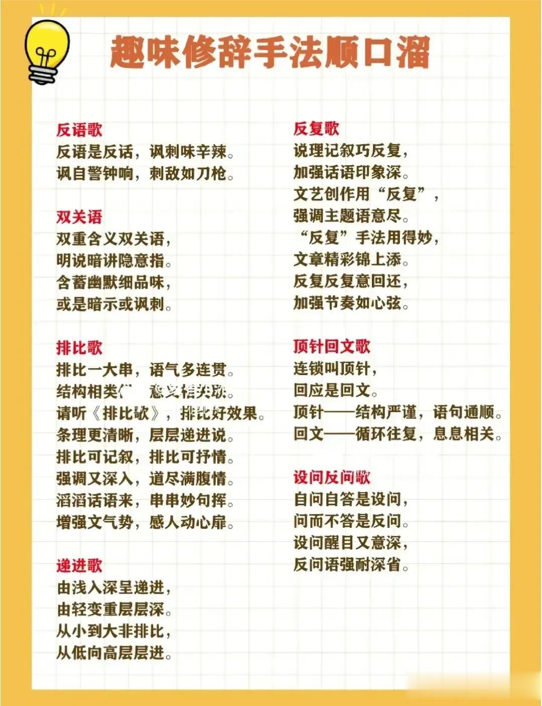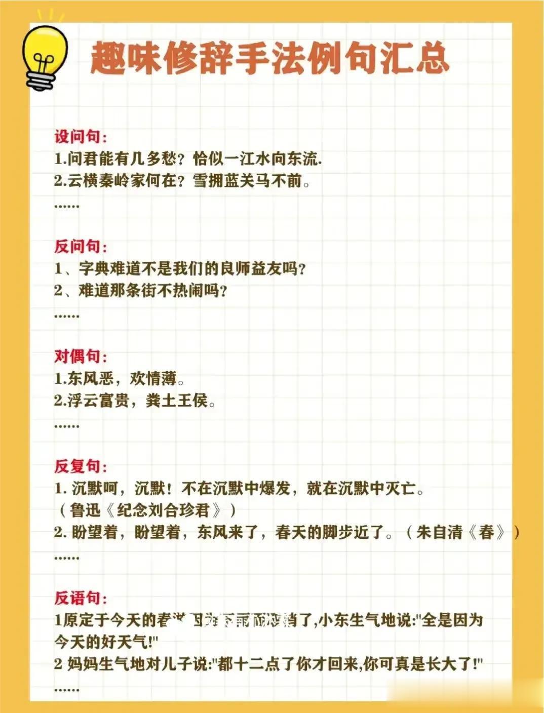 北大博士妈妈自述:孩子语文成绩赢在起跑线上,全靠这套趣味修辞手法顺口溜,让孩子的基础知识掌握牢牢的。写作时,修辞手法也是运用的优美高级,老师都夸她语文有水平!这么好的基础知识,家有孩子的赶紧收藏!修辞手法是小学语文学习的重点,没事让孩子多看看,练一练,尽早掌握,对于学习语文大有帮助。 如果你家的孩子阅读理解总丢分,写句子也不够优美,记流水账一样,那就从基础的句式训练开始学起,当孩子会仿写,会造句,会扩句,会运用各类修辞手法,语文成绩就上来了。更多基础训练在下方链接! 语文基础句段强化训练