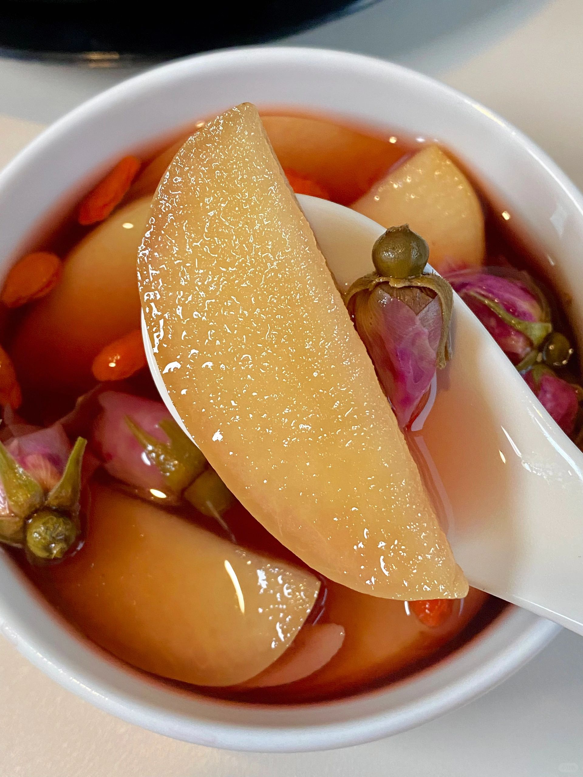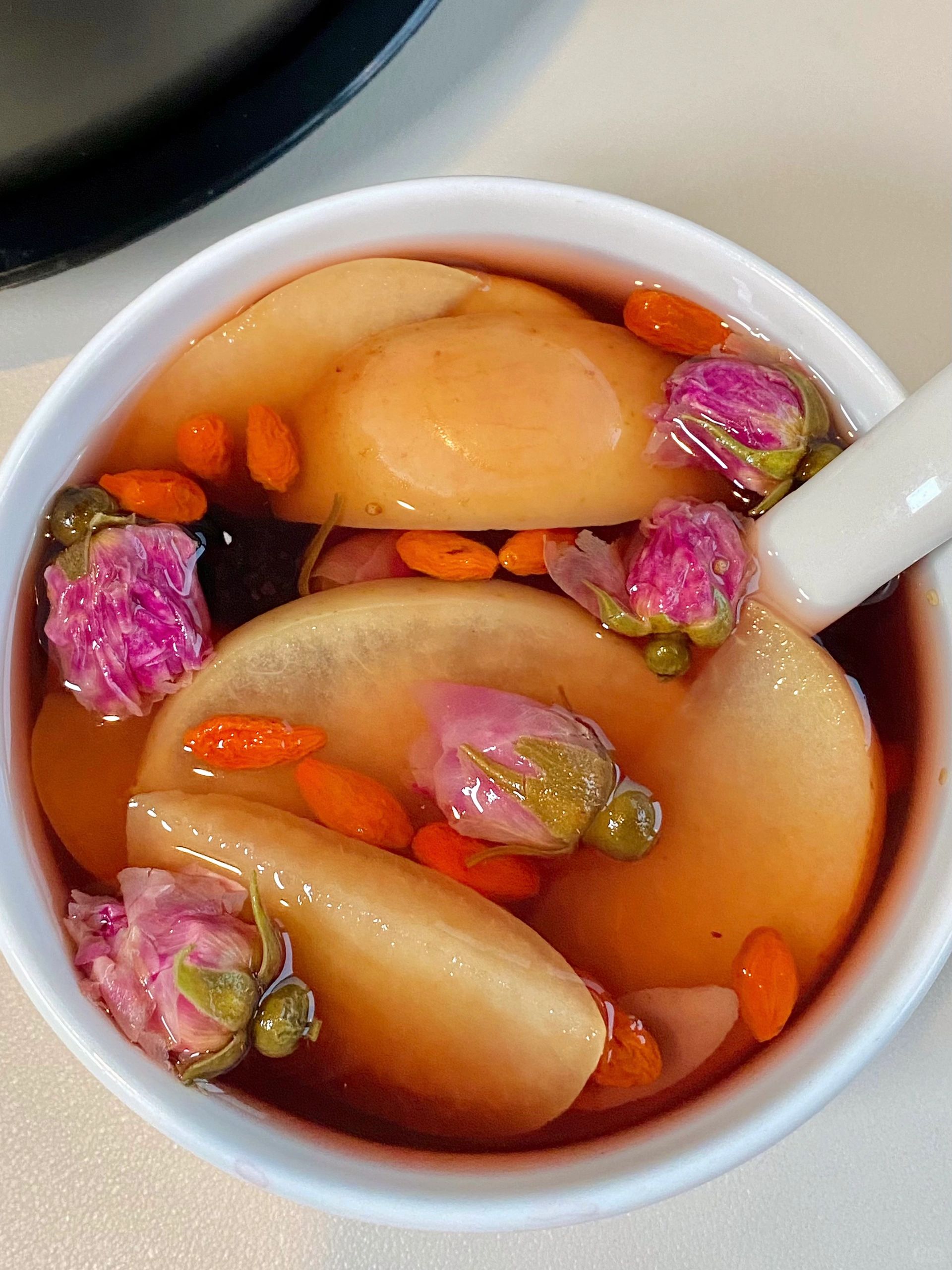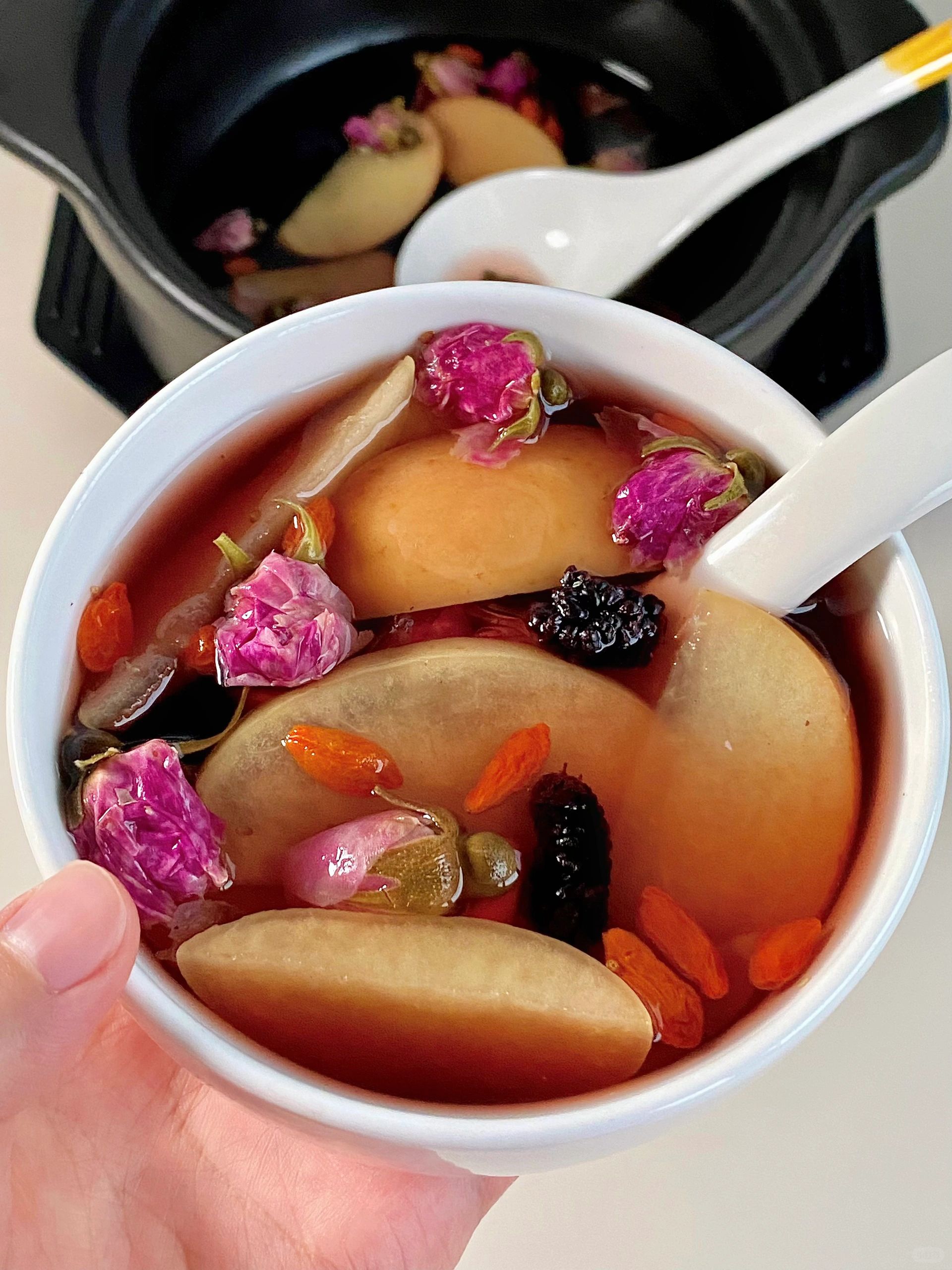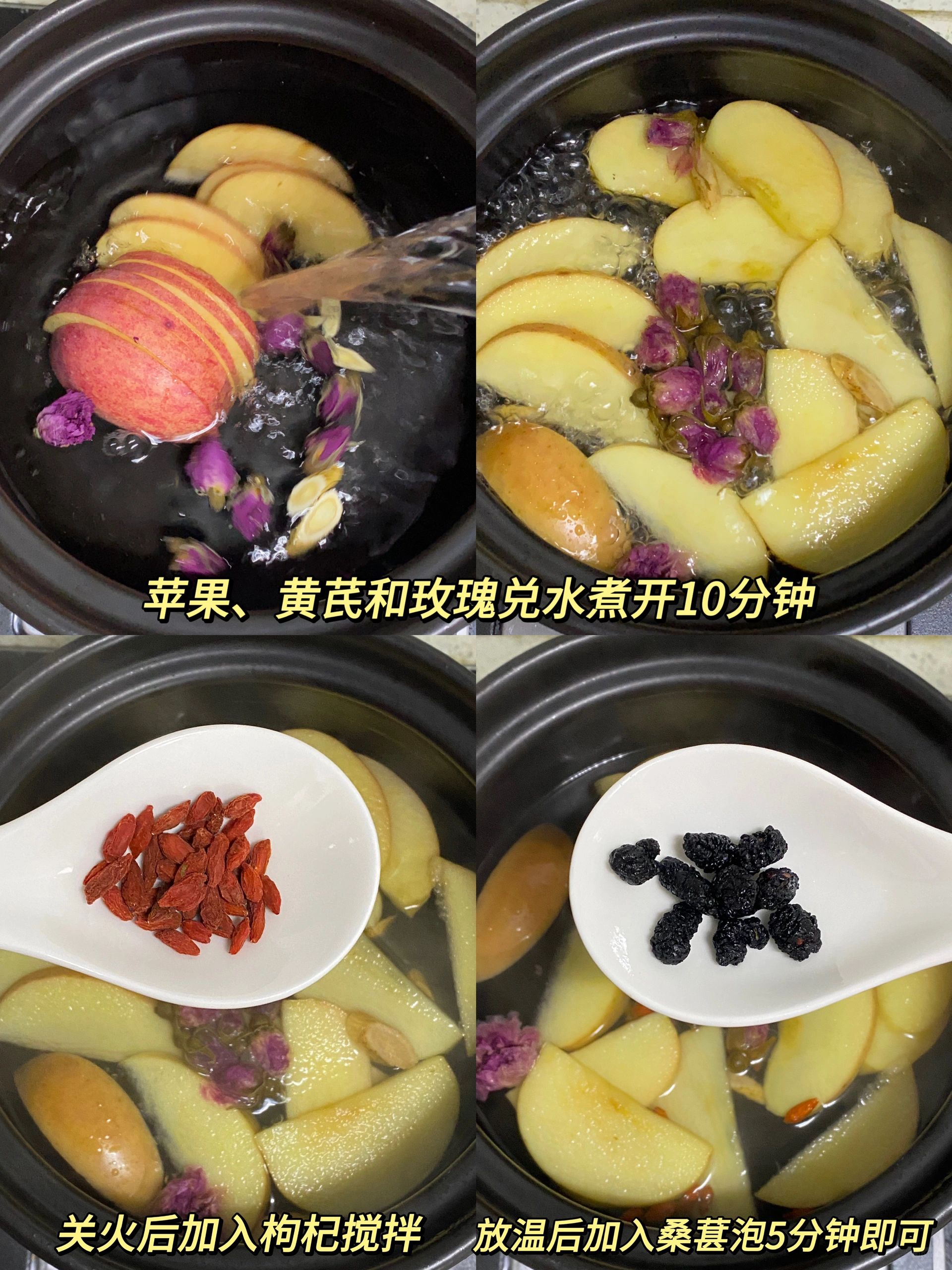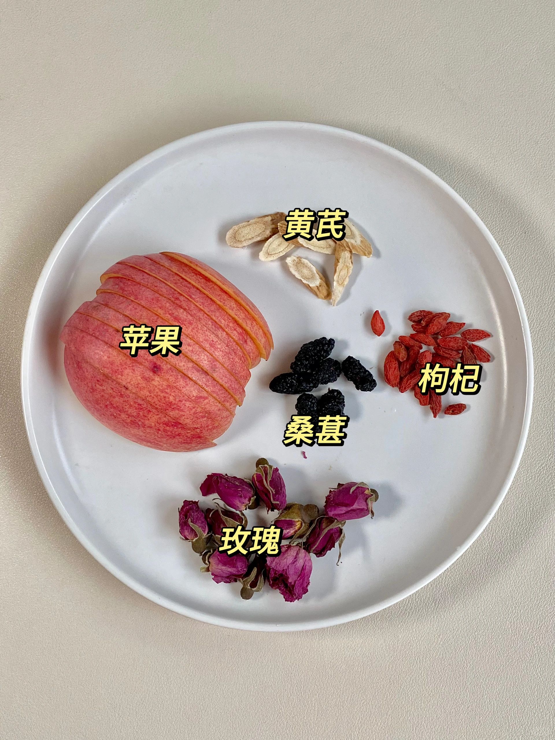 因为我经常熬夜😭…邻居姐姐教我的苹果桑葚玫瑰茶! 经常熬夜、小脸蜡🟡、长时间对着💻的姐妹…答应我!一定要试试!!一口下去香香甜甜的! 苹果的清甜带玫瑰花香!喝完嘴巴都香香的,还补充了满满的花青素!! 25➕的姐妹都给我喝起来!尤其是爱熬夜的姐妹!! 经常喝!素颜上班也元气满满哒~ 📝苹果、黄芪、玫瑰、枸杞、桑葚 ✔️做法:苹果、黄芪和玫瑰兑水煮开10分钟,关火后加入枸杞,放温后加入桑葚泡5分钟即可 香甜好喝的口感!女孩子坚持一周2-3次!美美哒~