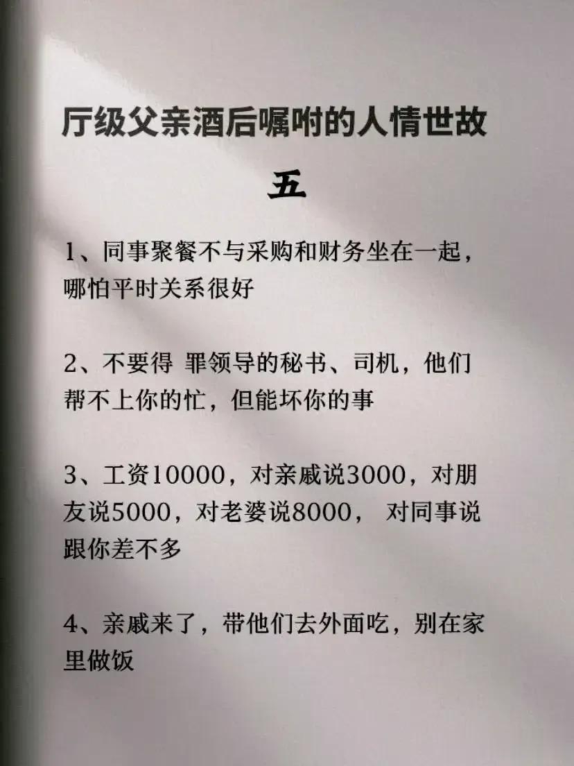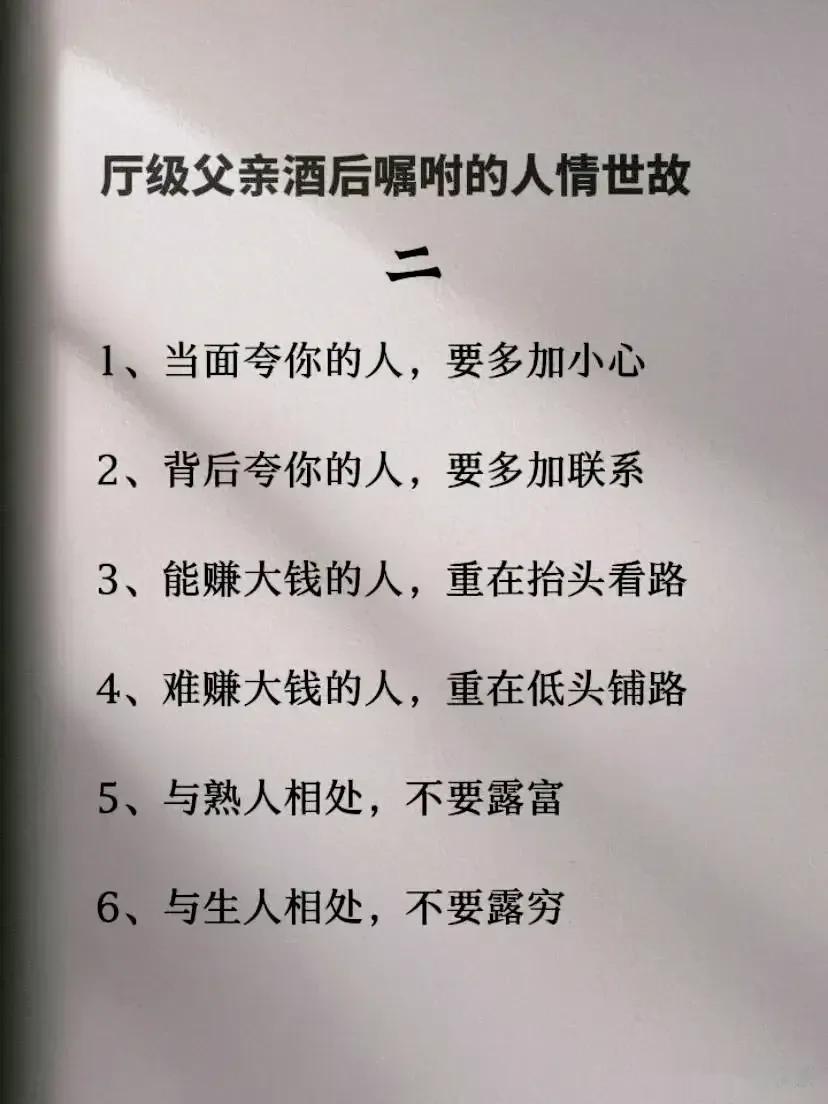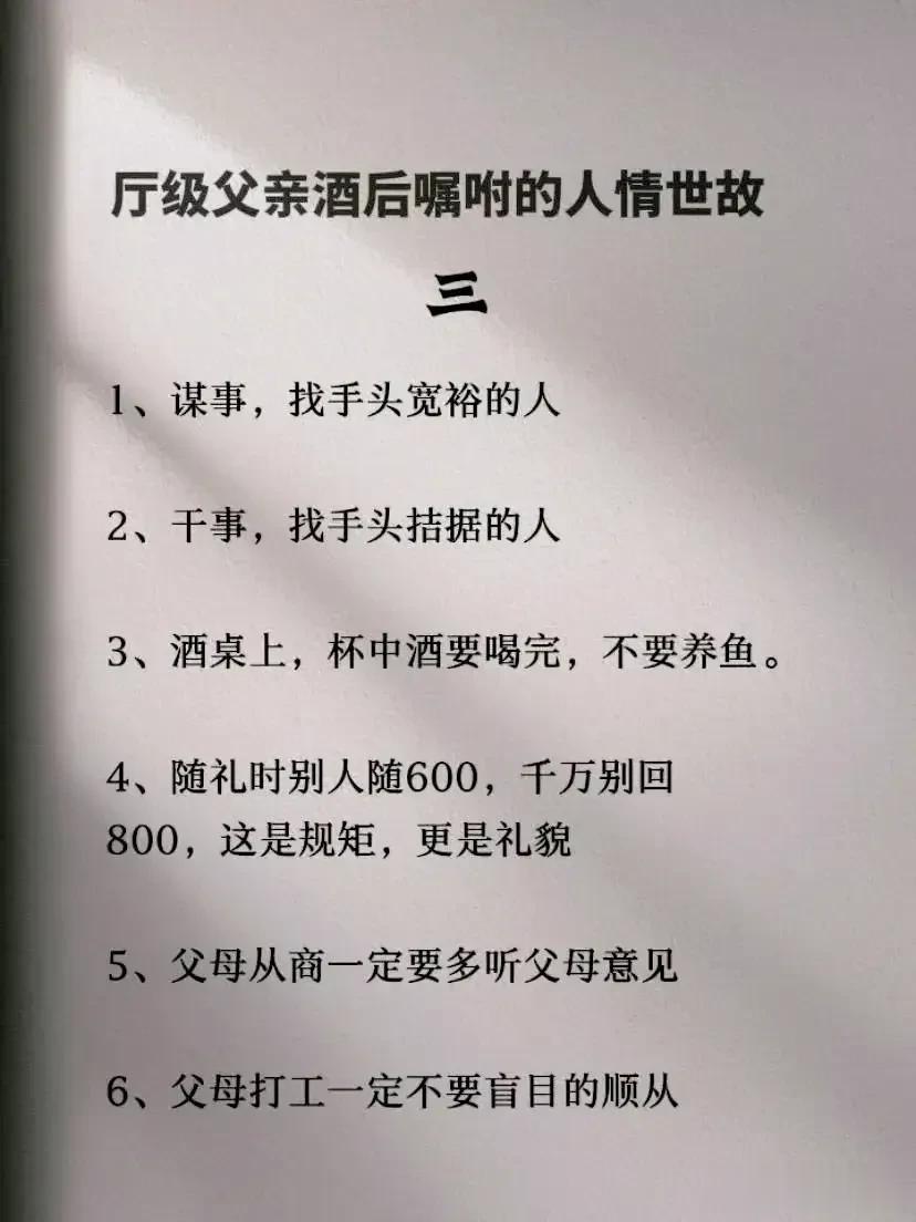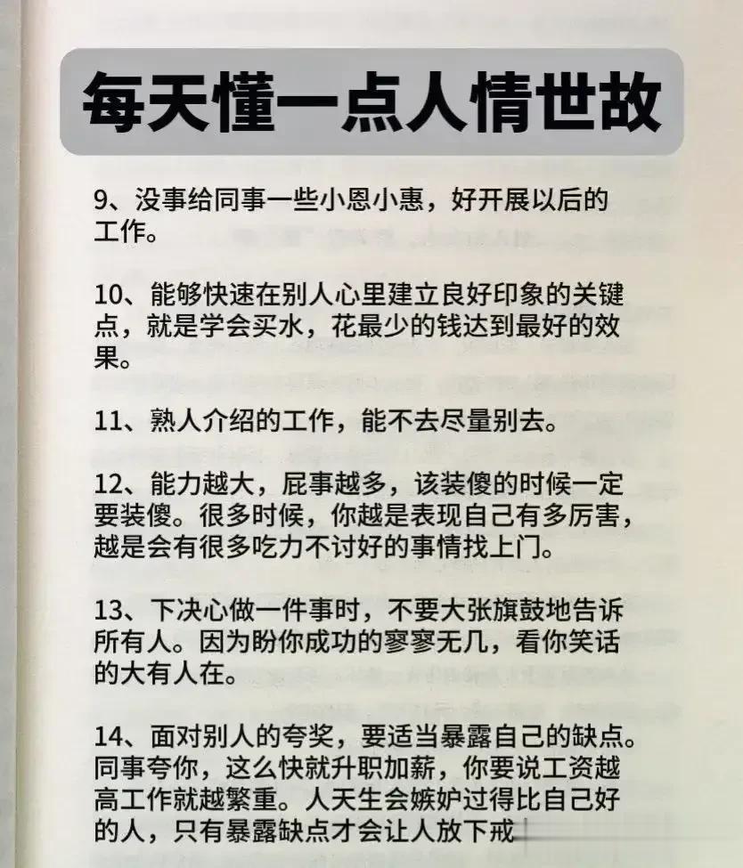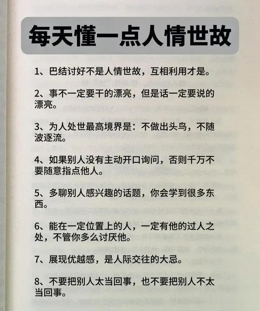 一位厅级父亲酒后嘱咐儿子的人情世故,全是精髓,不仅可以帮助我们建立良好的人际关系,还能够提升自身的社交能力和成功的机会。看完之后,才明白会变通,懂人情世故到底有多重要,它能决定一个人的一生是飞黄腾达,还是穷困潦倒? 据说,那些混得好的人,早就把人情世故如数家珍!无论是在职场还是日常生活中,都能得心应手,事半功倍! 曾经的我也是嗤之以鼻,直到四十岁的我才明白,有的人做得很棒却得不到提拔和重用,导致人生走了很多弯路。究其原因,就是不懂人情世故,容易得罪人! 没事拿出十分之一的时间来翻翻这本《每天懂一点人情世故》,学习并运用好这门技巧将会给我们带来很大收益。