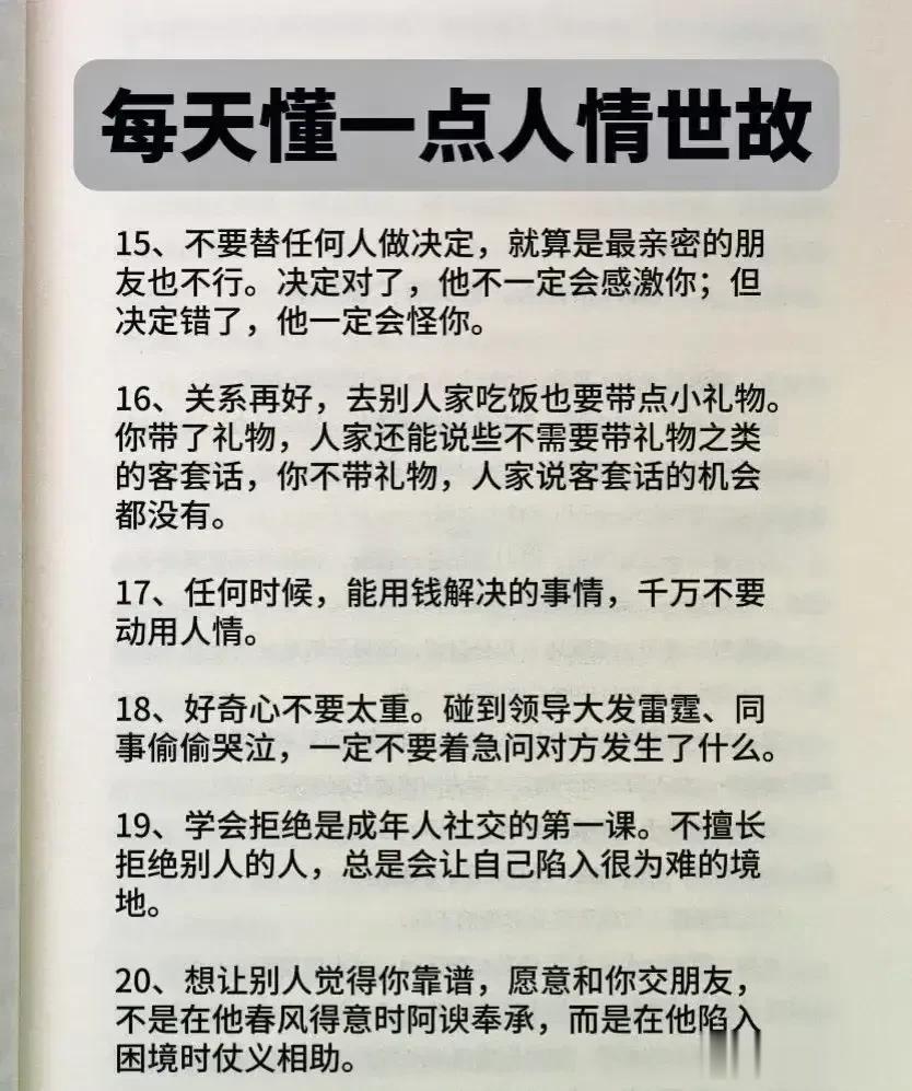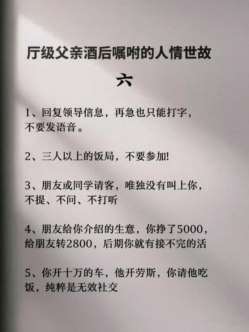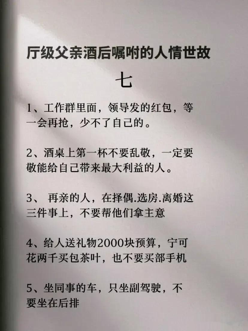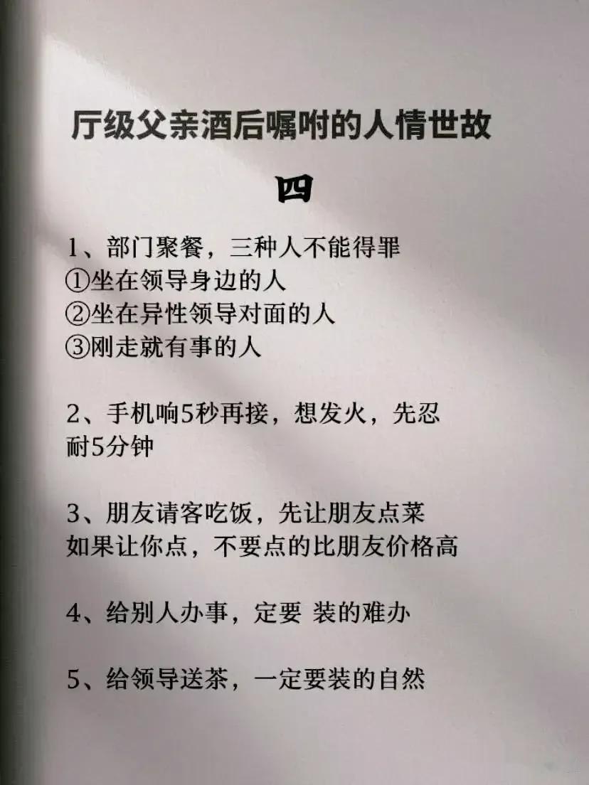 一位厅级父亲酒后嘱咐儿子的人情世故,全是精髓,不仅可以帮助我们建立良好的人际关系,还能够提升自身的社交能力和成功的机会。看完之后,才明白会变通,懂人情世故到底有多重要,它能决定一个人的一生是飞黄腾达,还是穷困潦倒? 据说,那些混得好的人,早就把人情世故如数家珍!无论是在职场还是日常生活中,都能得心应手,事半功倍! 曾经的我也是嗤之以鼻,直到四十岁的我才明白,有的人做得很棒却得不到提拔和重用,导致人生走了很多弯路。究其原因,就是不懂人情世故,容易得罪人! 没事拿出十分之一的时间来翻翻这本《每天懂一点人情世故》,学习并运用好这门技巧将会给我们带来很大收益。