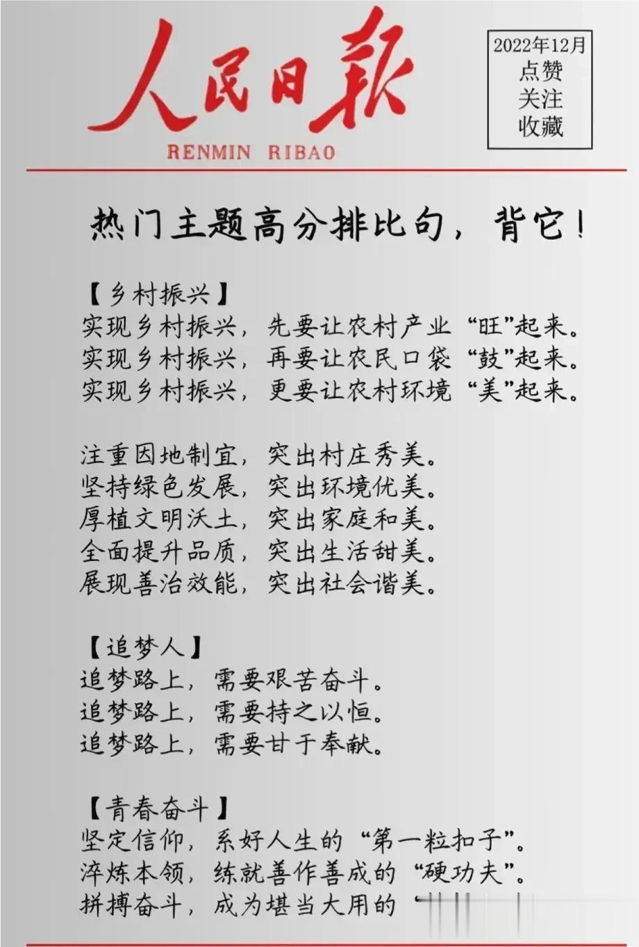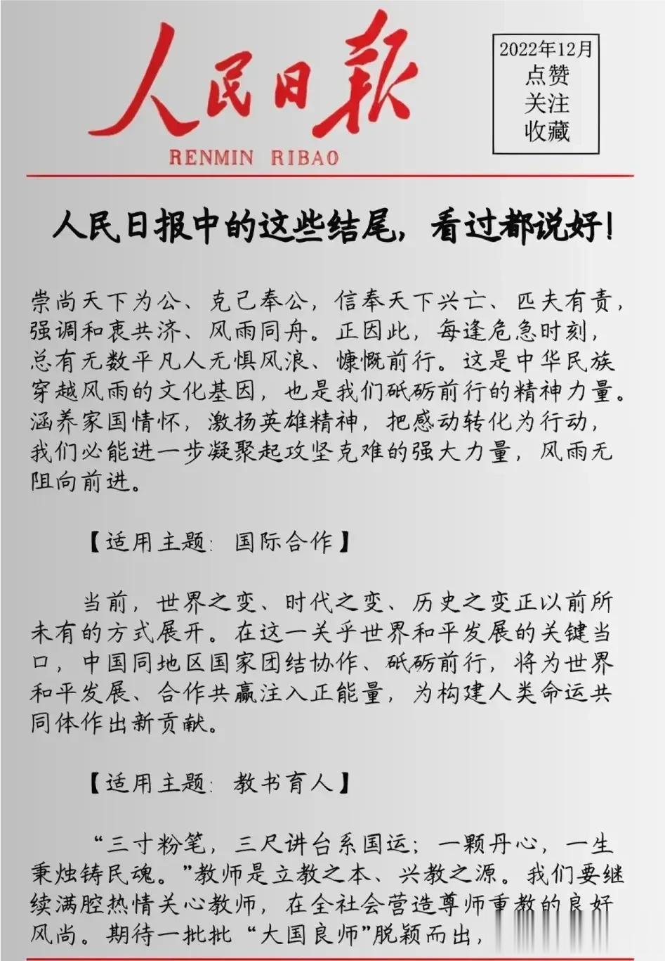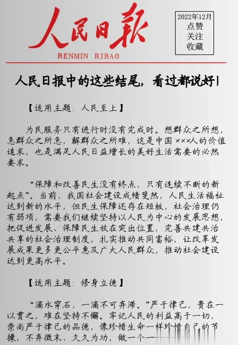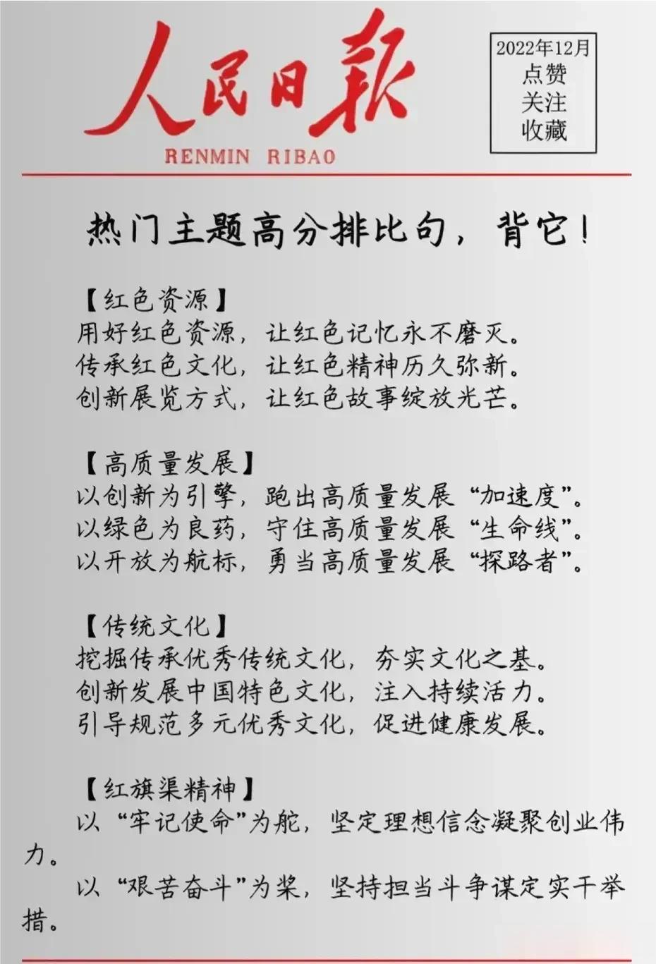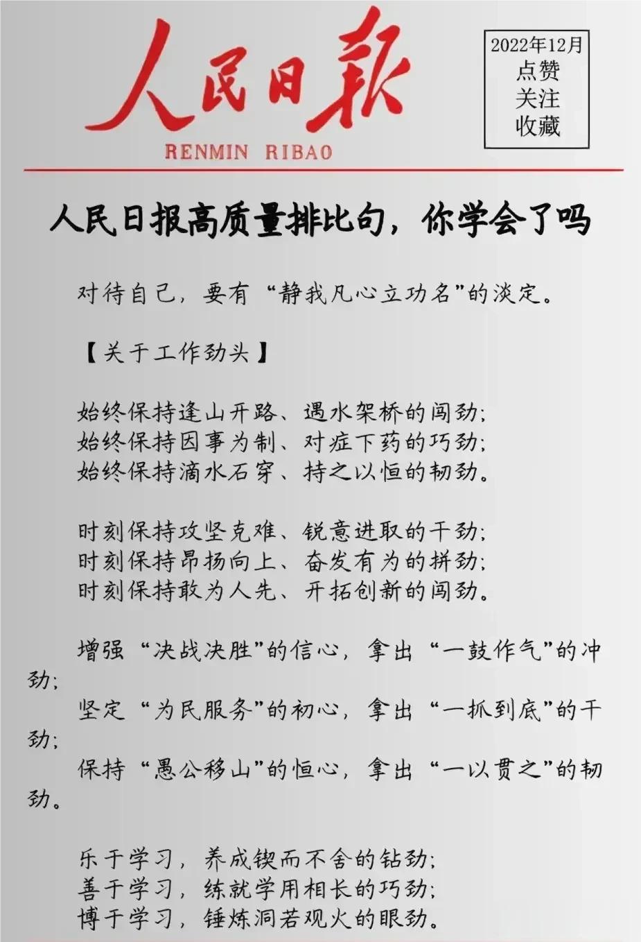 “写得太好了!”看过都说好!人民日报高质量排比句和分类主题结尾,每一句都是金句,每一句都满满的高级感。是写作上的“绝佳”素材,运用到作文中可以惊艳老师。家里有孩子的,一定保存下来,平时要让孩子多积累人民日报的文案,快速提升孩子的作文水平。 写作技巧初中高中素材
