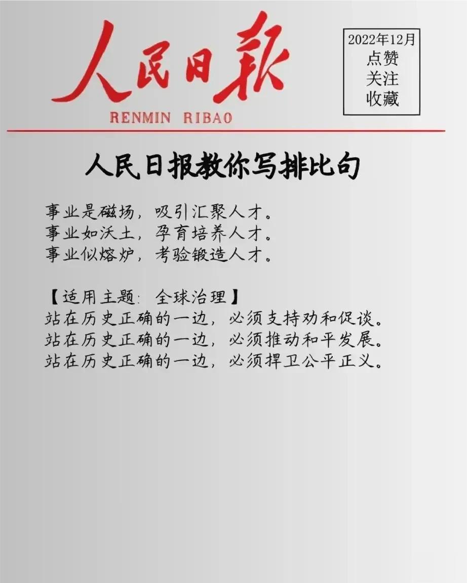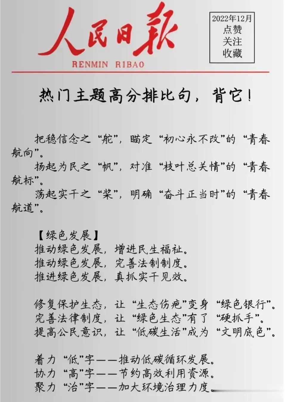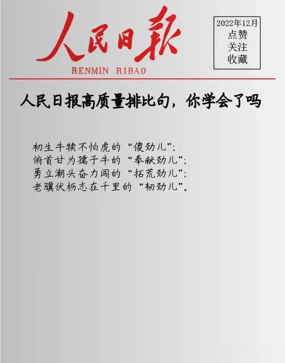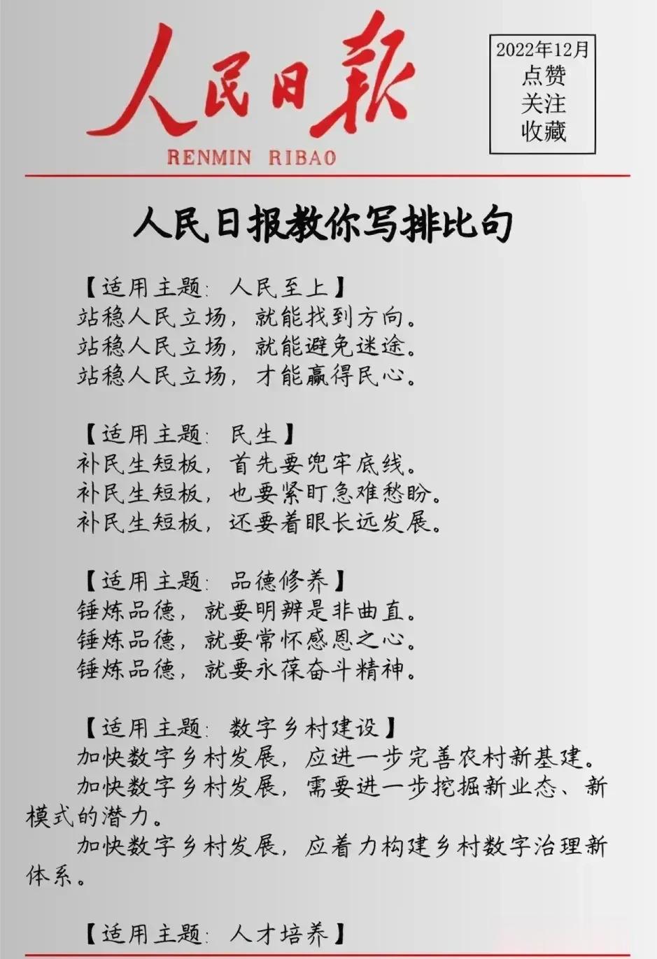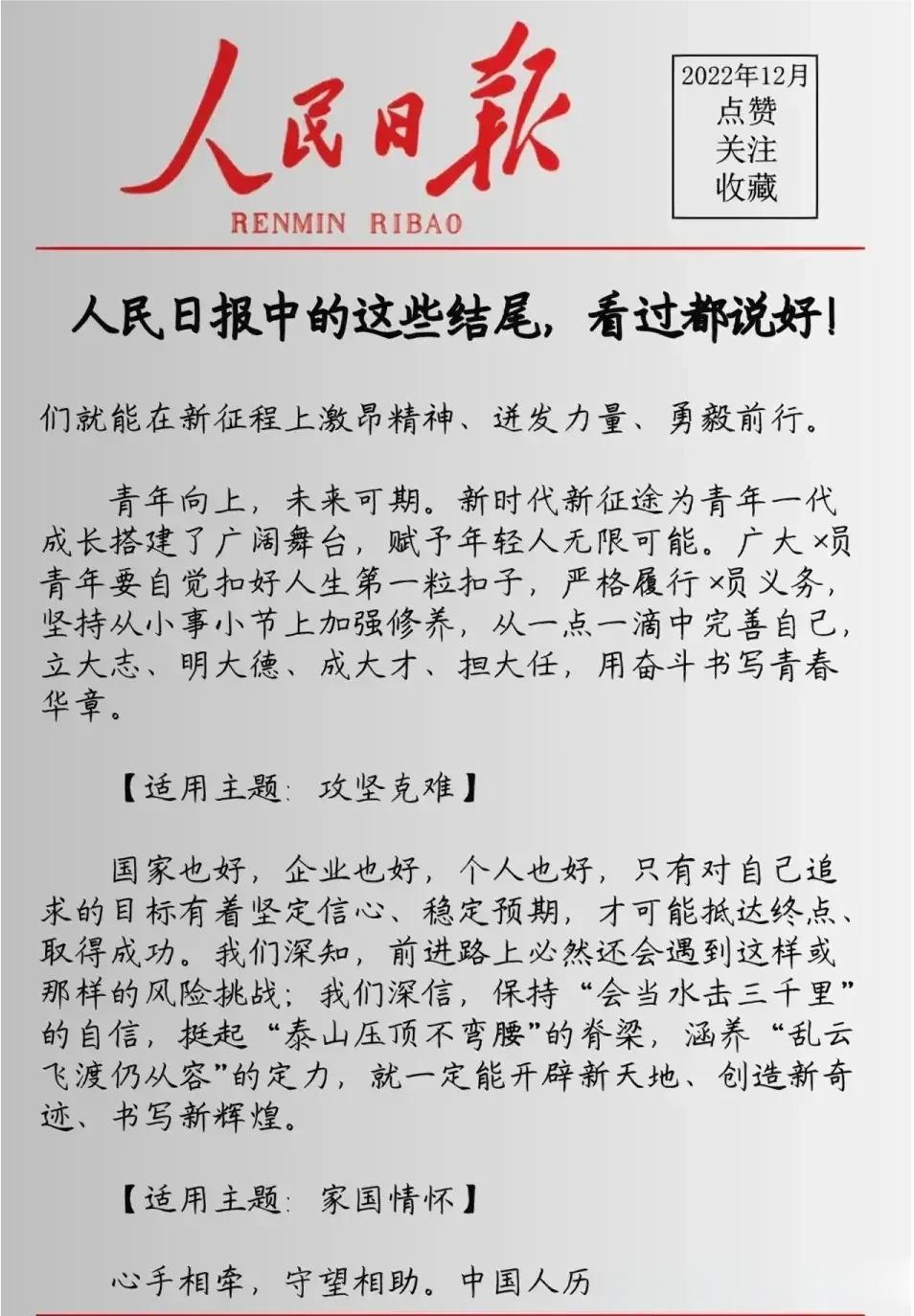 “写得太好了!”看过都说好!人民日报高质量排比句和分类主题结尾,每一句都是金句,每一句都满满的高级感。是写作上的“绝佳”素材,运用到作文中可以惊艳老师。家里有孩子的,一定保存下来,平时要让孩子多积累人民日报的文案,快速提升孩子的作文水平。 写作技巧初中高中素材