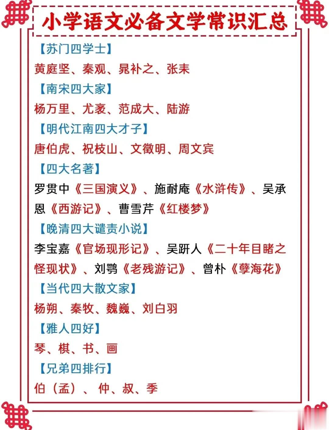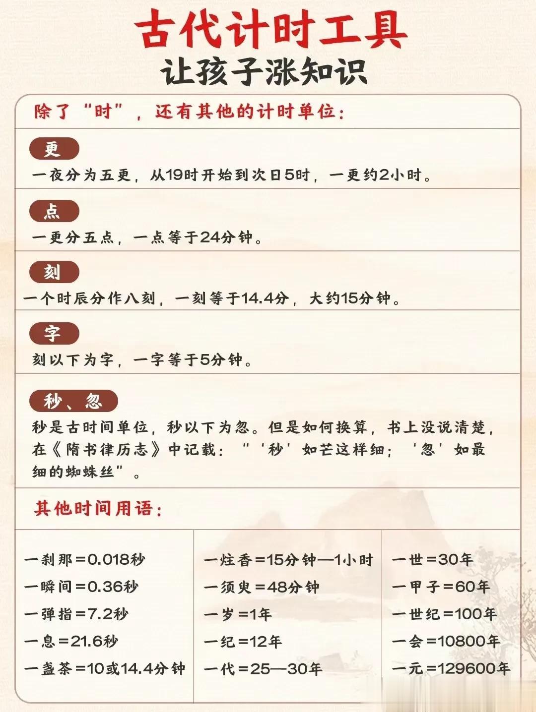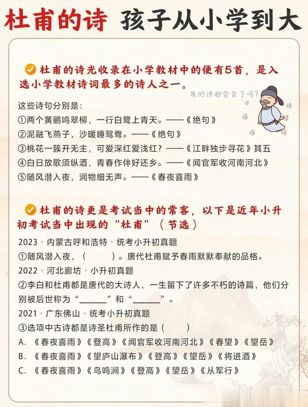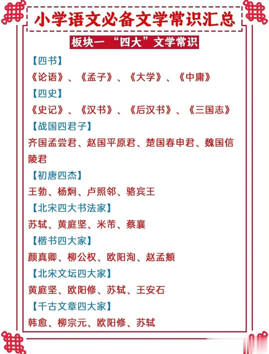 终于有人把十二时辰表、古代计时工具、杜甫介绍、唐代最长寿的诗人、必备文学常识等全都整理出来了,看完之后,真是大涨知识!这么多国学常识竟然是第一次听说!赶紧收藏让孩子记一记! 文学常识的积累能增强我们的知识储备,丰富我们的文学表达,提高沟通能力,并且对之后初、高中的学习也有所帮助。