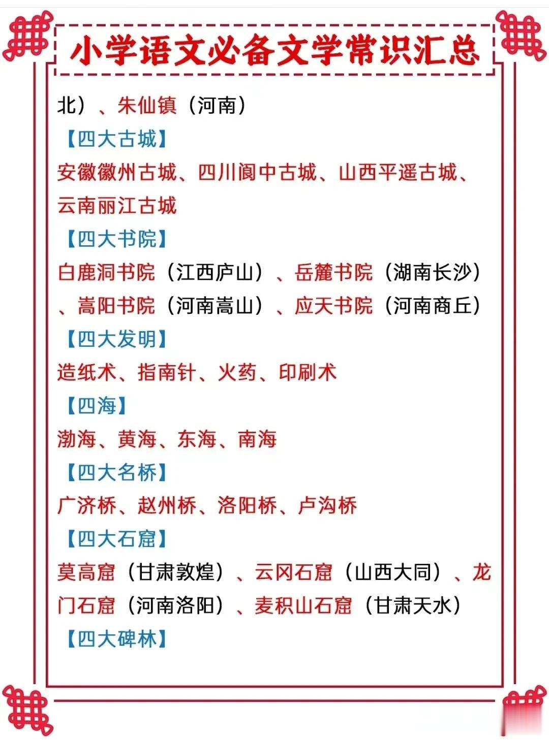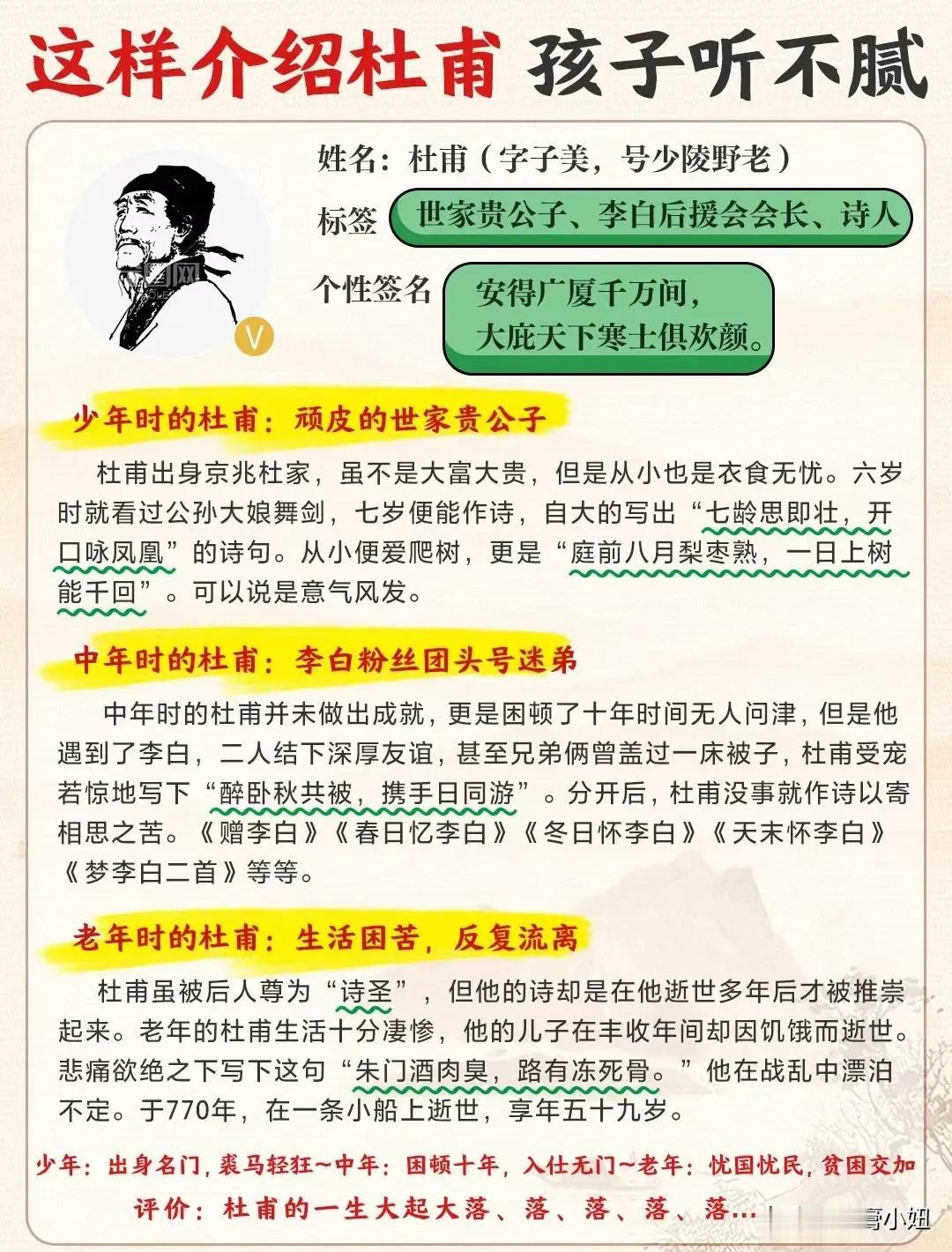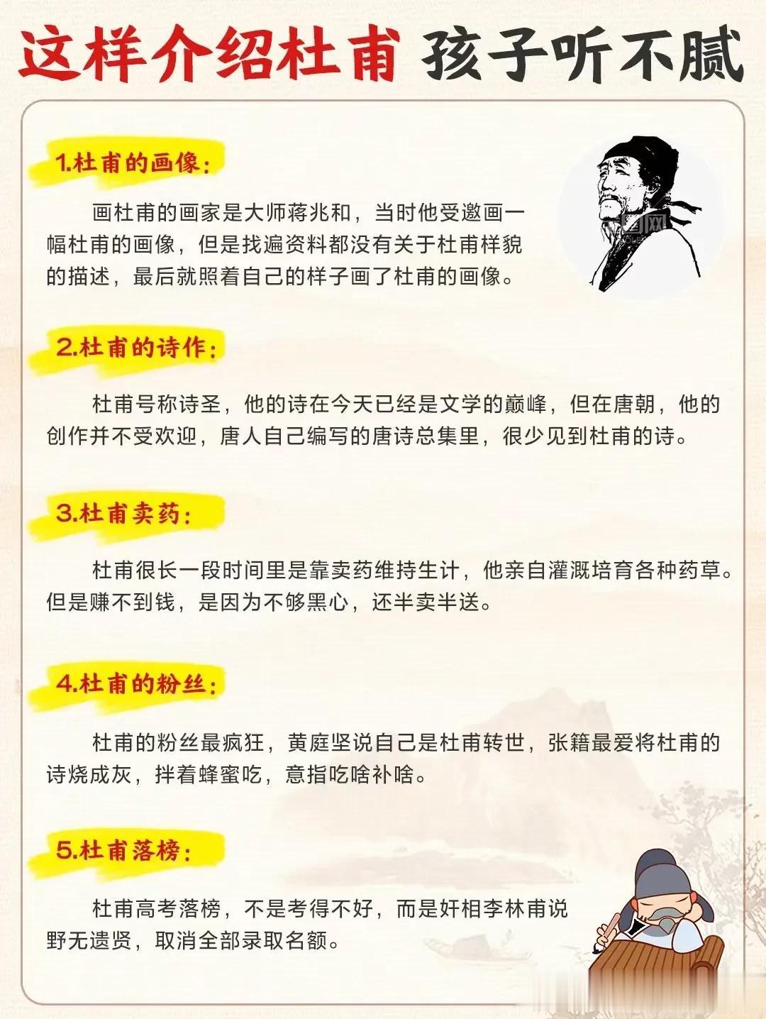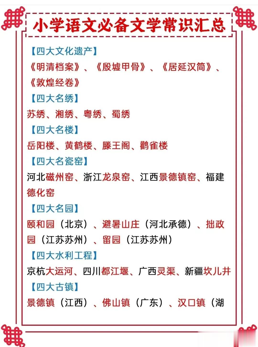 终于有人把十二时辰表、古代计时工具、杜甫介绍、唐代最长寿的诗人、必备文学常识等全都整理出来了,看完之后,真是大涨知识!这么多国学常识竟然是第一次听说!赶紧收藏让孩子记一记! 文学常识的积累能增强我们的知识储备,丰富我们的文学表达,提高沟通能力,并且对之后初、高中的学习也有所帮助。