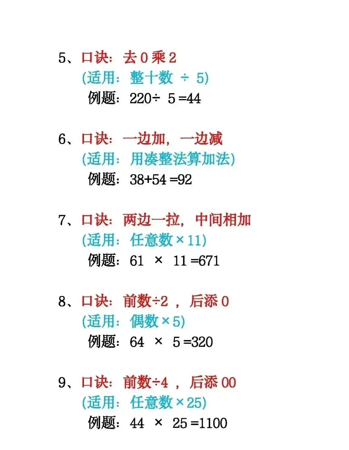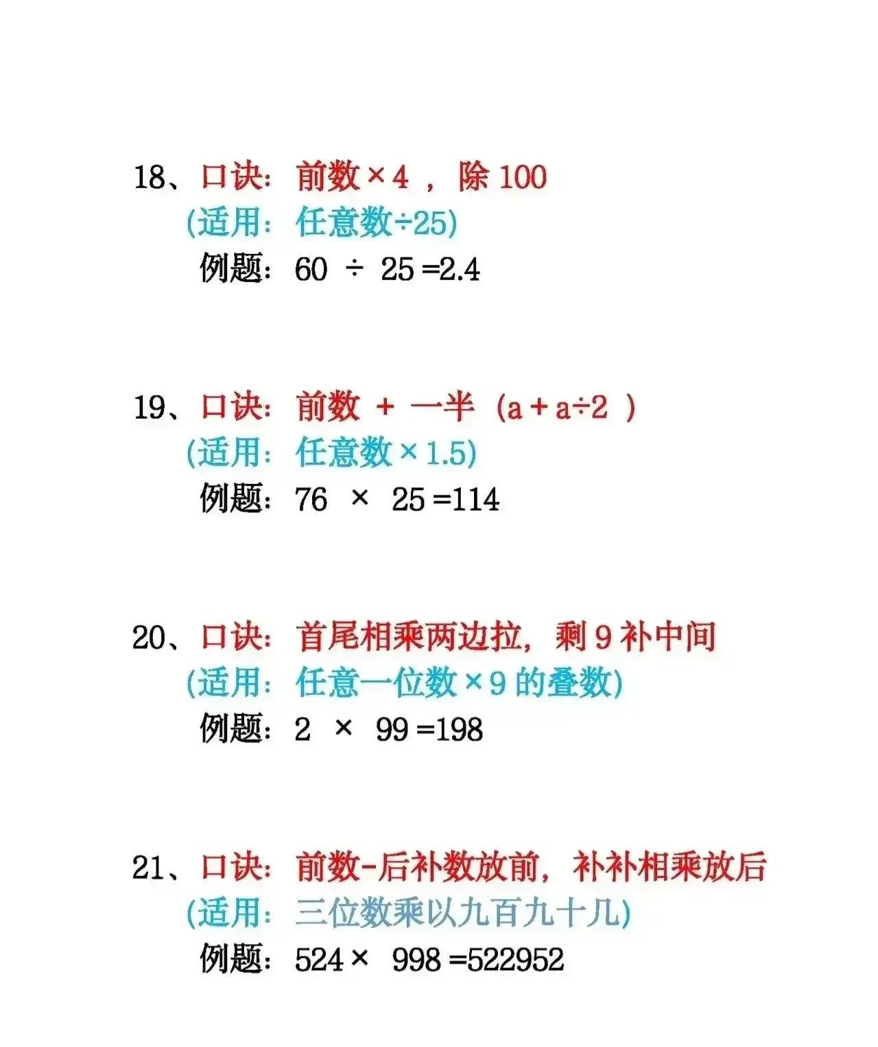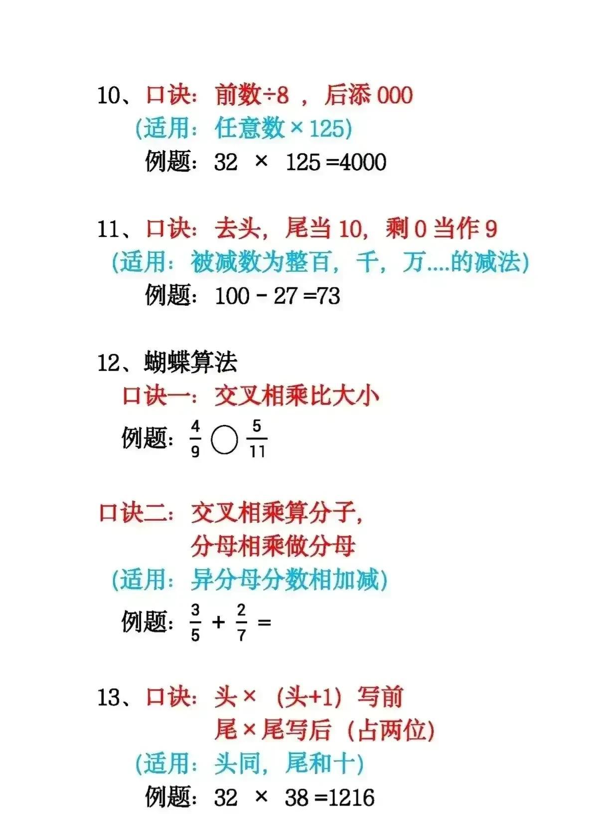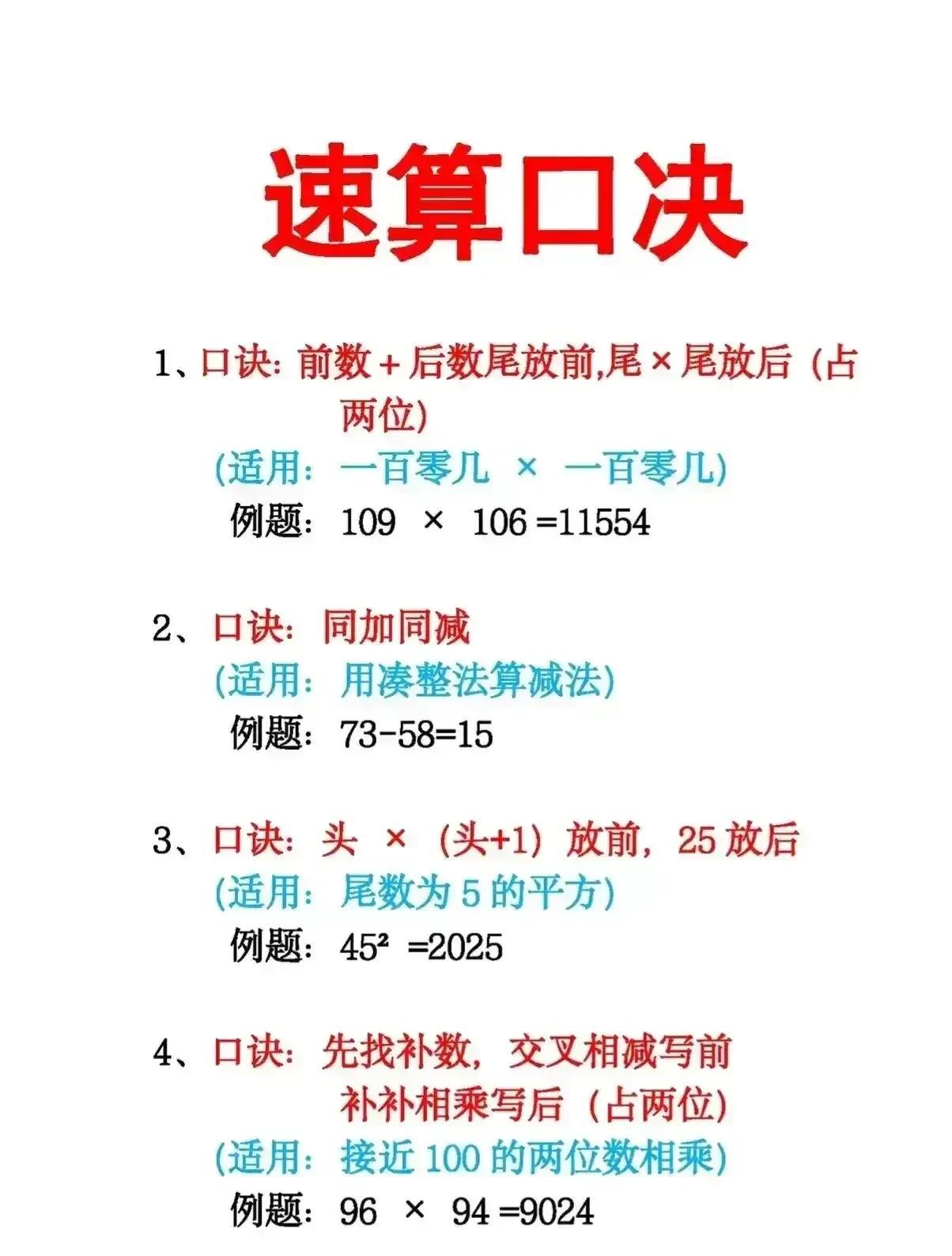 真后悔知道的太晚了!一位奥数老师直言:吃透这18张图中的速算技巧,让你的加减乘除、分数、平方计算速度惊人!赶紧背下这份速算口诀,孩子计算又快又准! 其实,真没想到从小学开始,数学的各类计算都是有技巧的,难怪那些数学学霸次次计算速度能拿奖,原来是早就打通了数学的任督二脉!没事让孩子按照方法,练一练,学会举一反三,数学像开窍了一样!计算再也不磨蹭了! 小学数学速算技巧