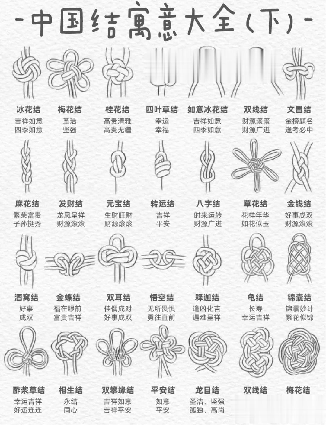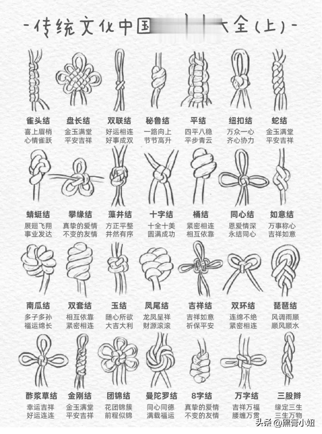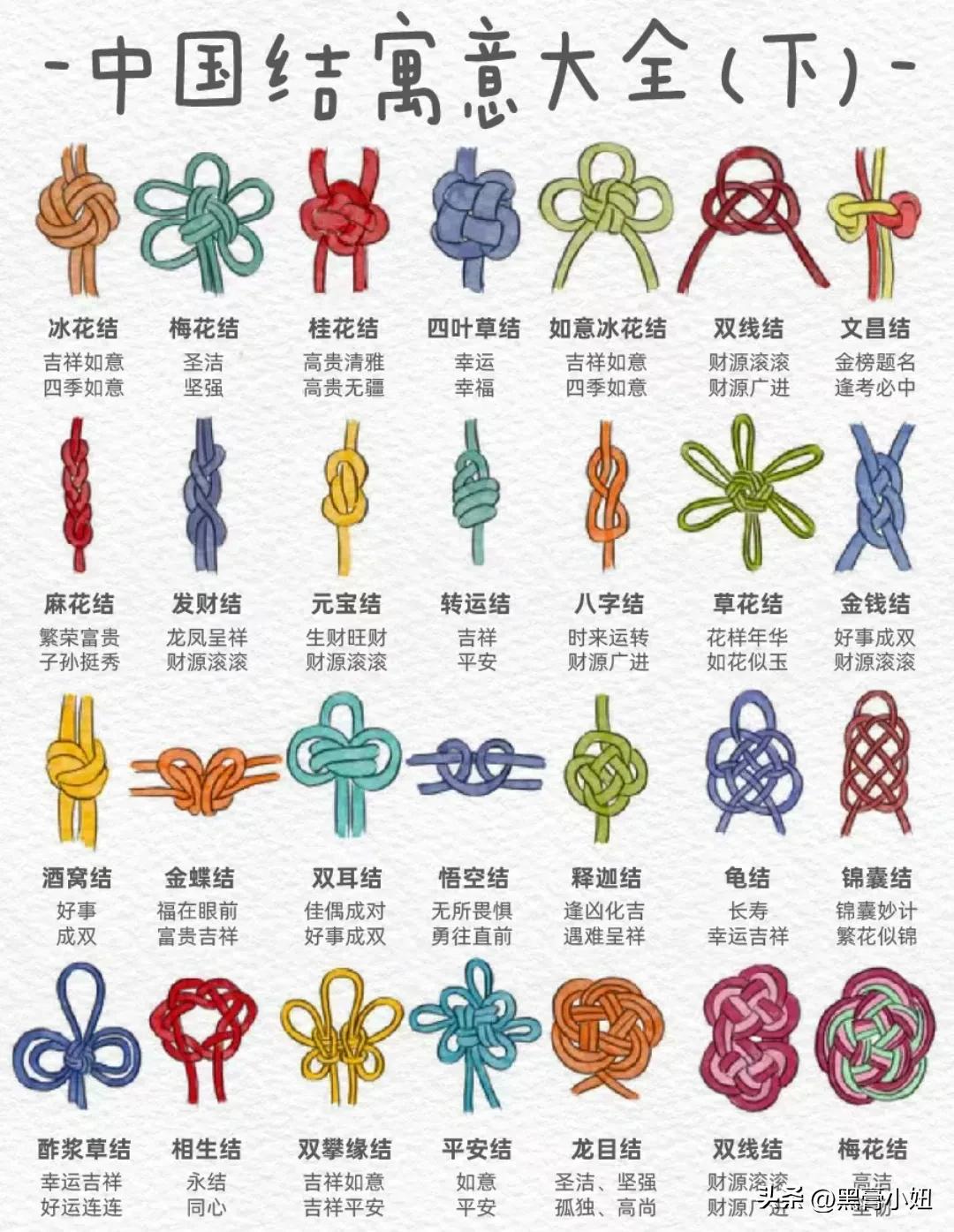 终于有人把中国结的寓意详细的整理出来!看完之后,真的大涨知识,估计98%的人不知道!果断收藏! 中国结代表着中华民族的传统文化,每一种结都象征着人们的美好祝福和心愿,体现着对真善美的追求和渴望!比如纽扣结代表万众一心,齐心协力;如意结代表万事称心,吉祥如意;金刚结代表金玉满堂,平安吉祥;转运结代表吉祥平安……#妙笔生花创作挑战#