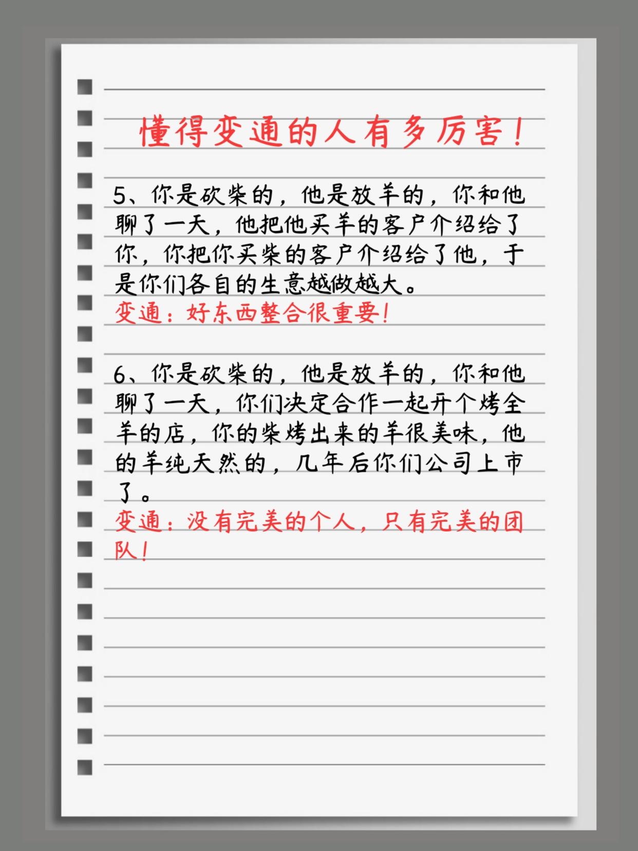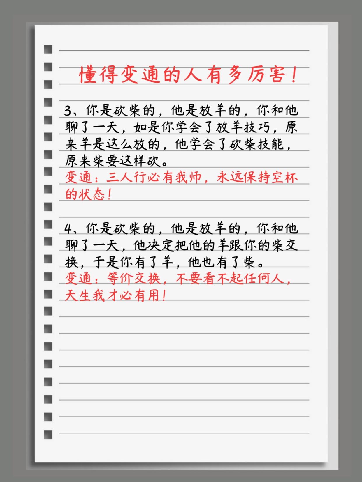 什么是变通 1、学会变通,尤其是非原则性的事情,不要较真。 2、审时度势,见人说人话,见鬼说鬼话。 3、看不惯一个人的时候,不要直接和他作对。 4、不随便得罪人,不结仇,不树敌。 5、事不拖、话不多、人不作。 6、等价交换,不要看不起任何人,天生我才必有用! 7、三人行必有我师,永远保持空杯的状态! 8、好东西整合很重要! 9、没有完美的个人,只有完美的团队! 10、请放弃你的无效社交! 11、沟通很重要,找对人聊天少走弯路更重要!#人际交往 #为人处世 #变通 #受益一生 #智慧人生