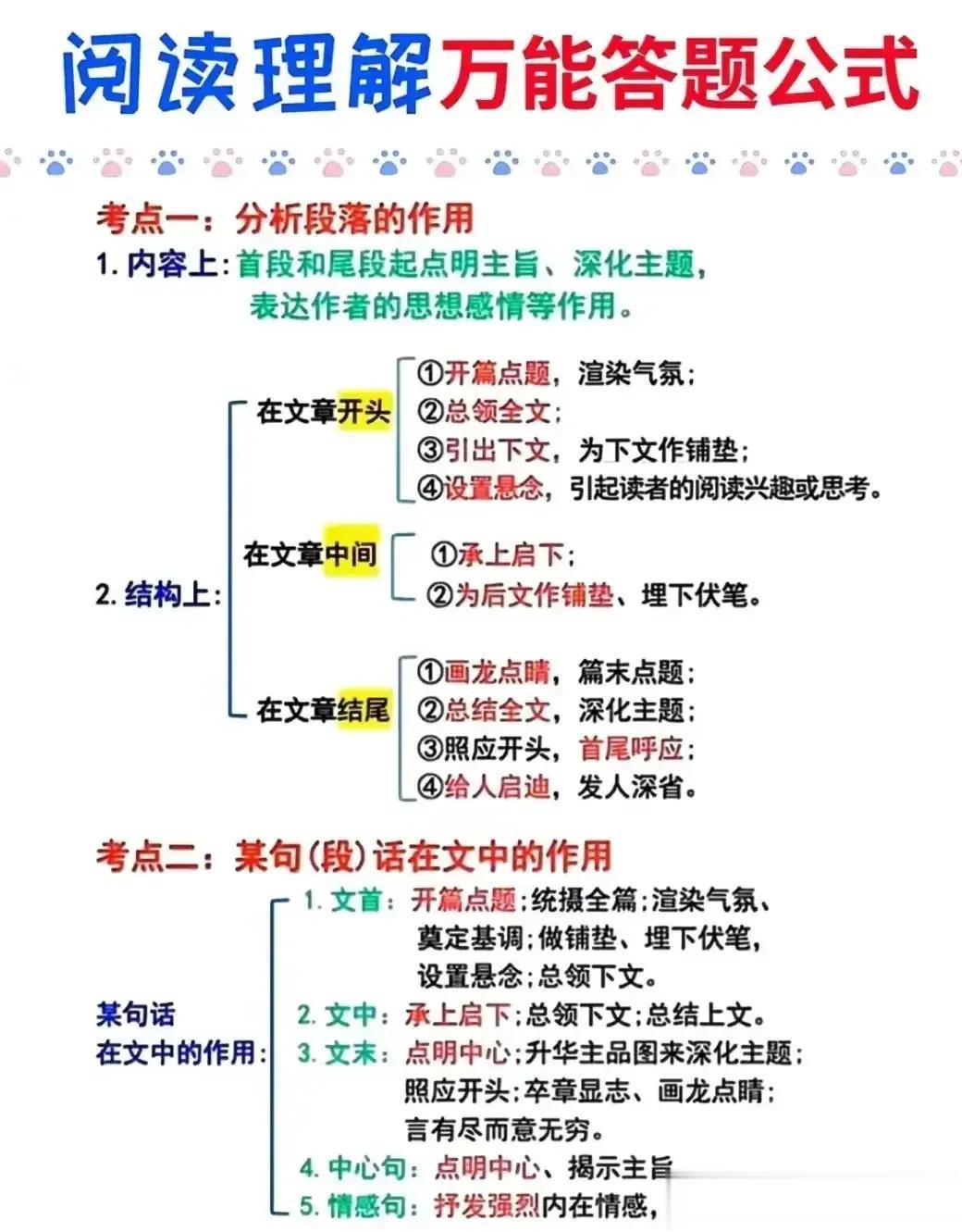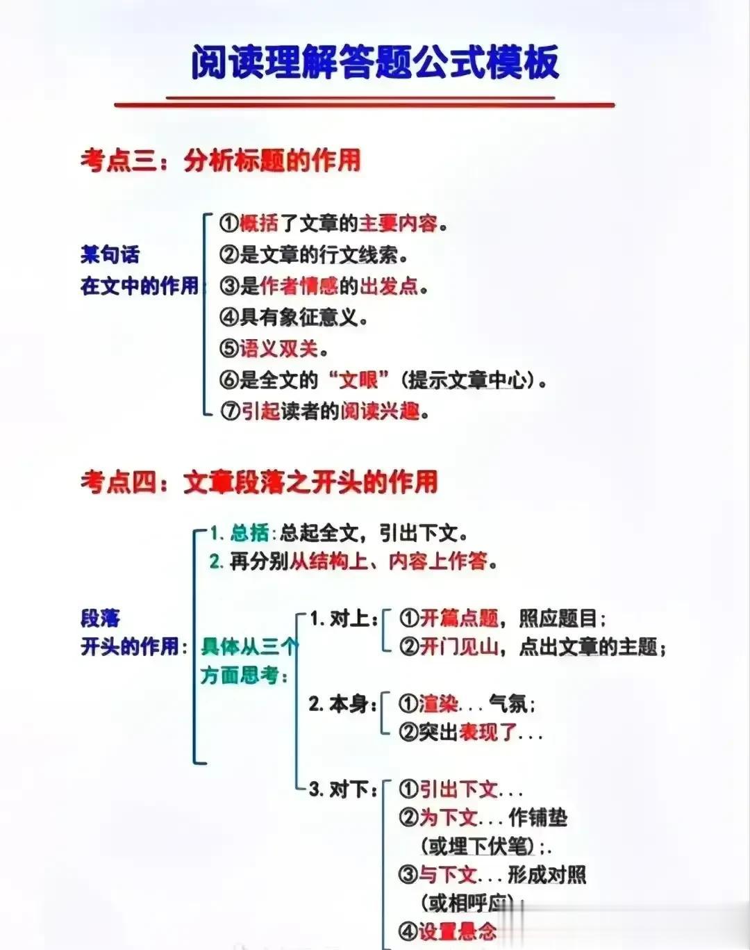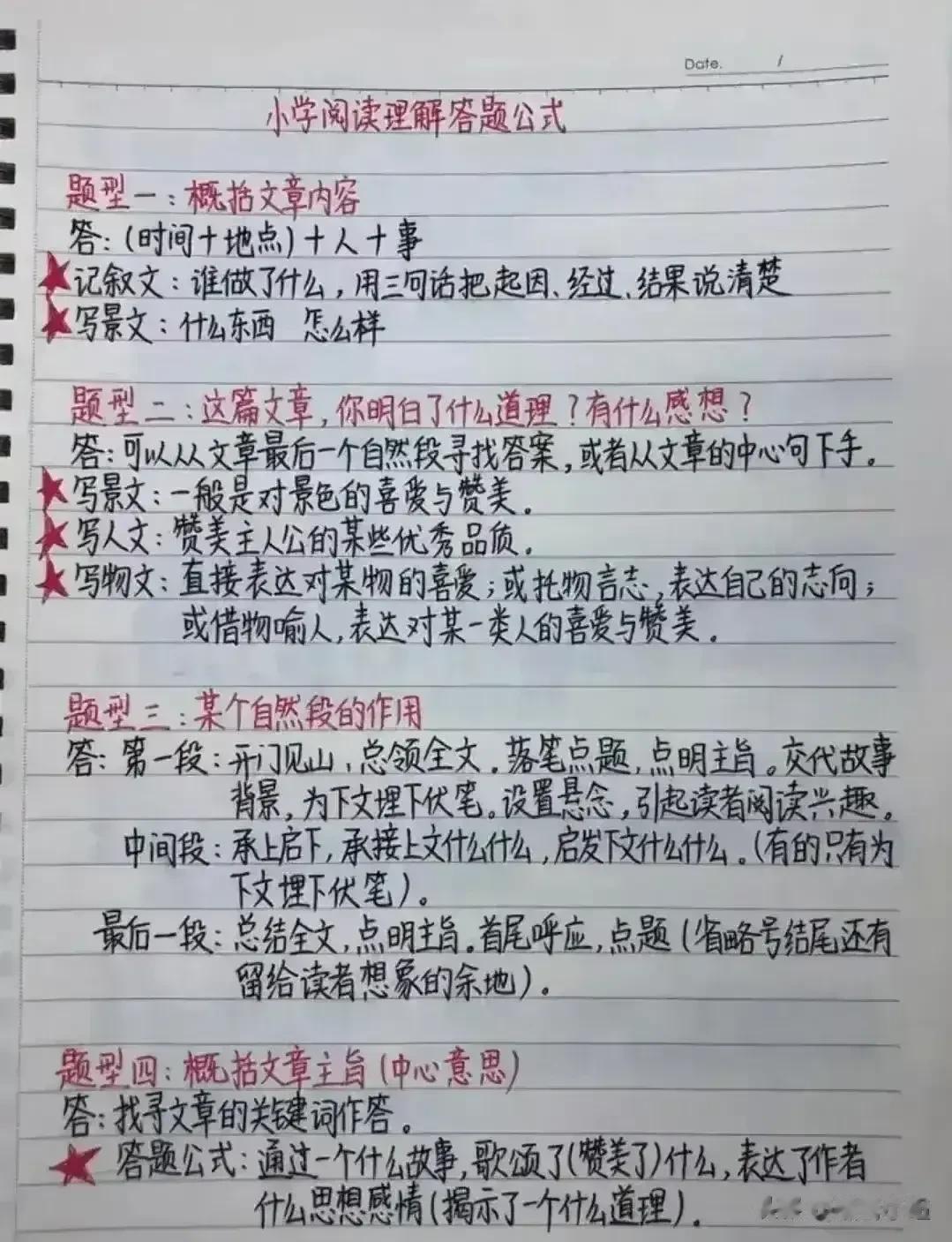 我的妈呀!!快期末考试了才知道,原来语文阅读理解是有答题公式的,难怪学霸早就把阅读答题公式摘抄下来背诵并熟练运用了,真的后悔知道的太晚了!家有孩子的,赶紧保存下来背熟!期末考试还能冲刺一把!让孩子答题答到点子上。 下方阅读答题公式,寒假让孩子记一记,练一练!让语文阅读和作文更上一层楼! 中小学阅读答题公式