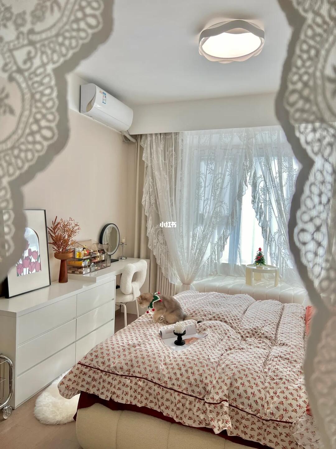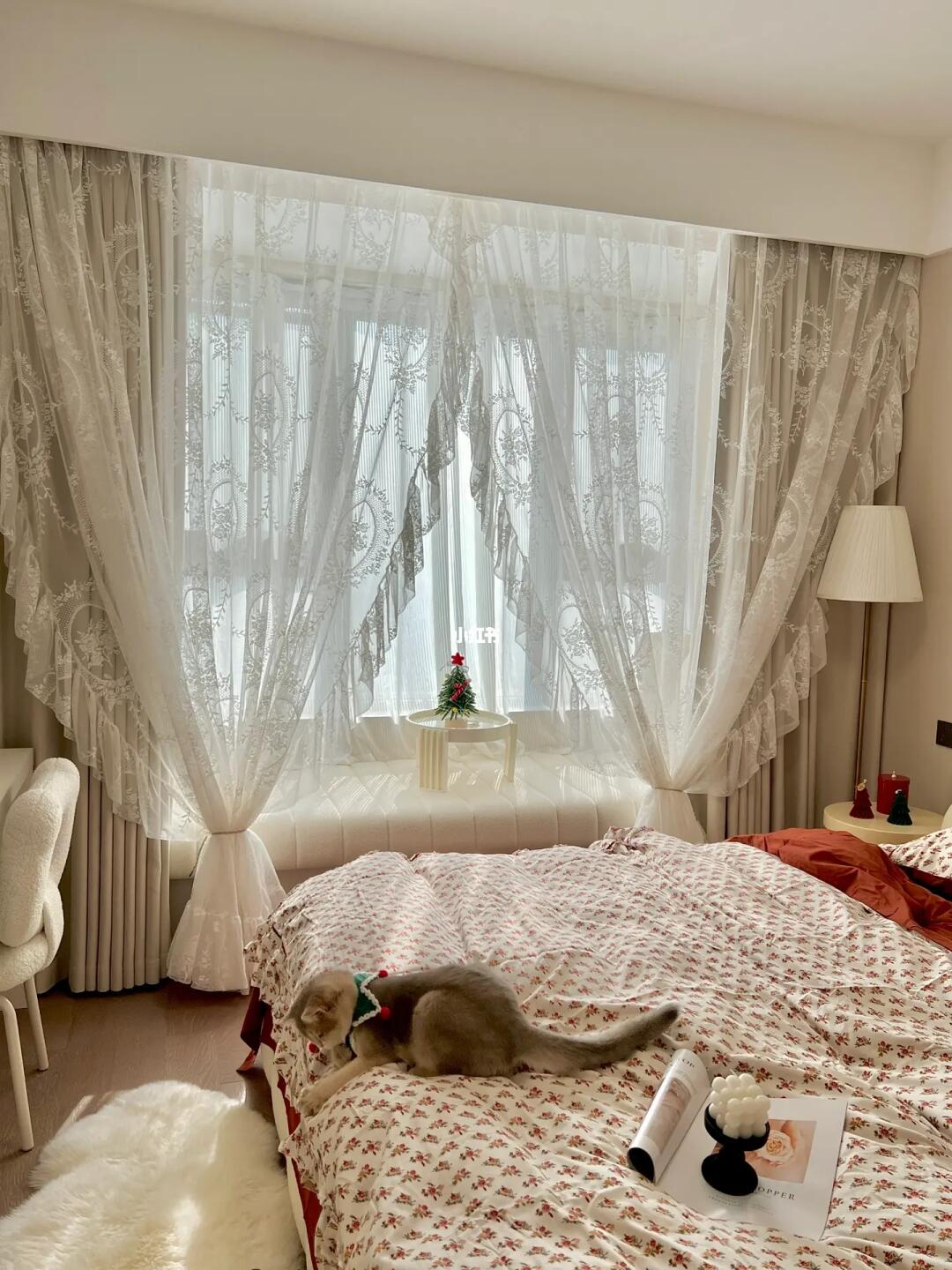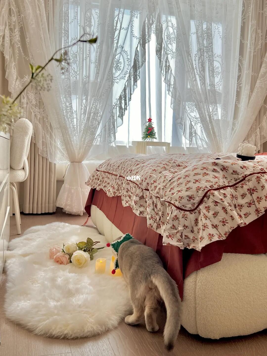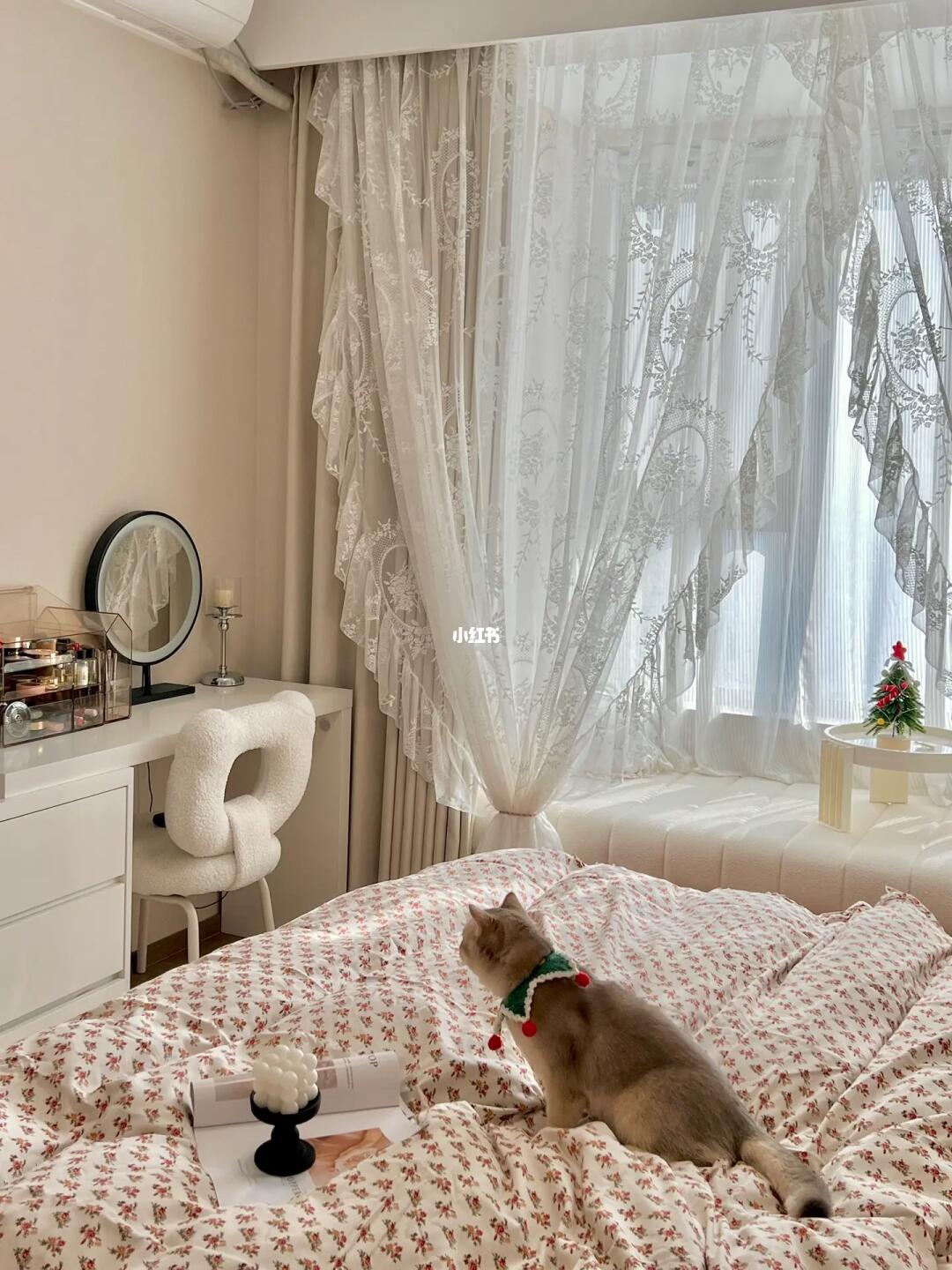 我的奶油卧室真的太温馨啦✨ 奶油色的床搭配法式四件套 配上花边吸顶灯和蕾丝纱帘 奶呼呼的复古又浪漫💕 和小猫一起宅在家🐈 懒洋洋的太阳晒到飘窗垫上 暖呼呼的真的好舒服~