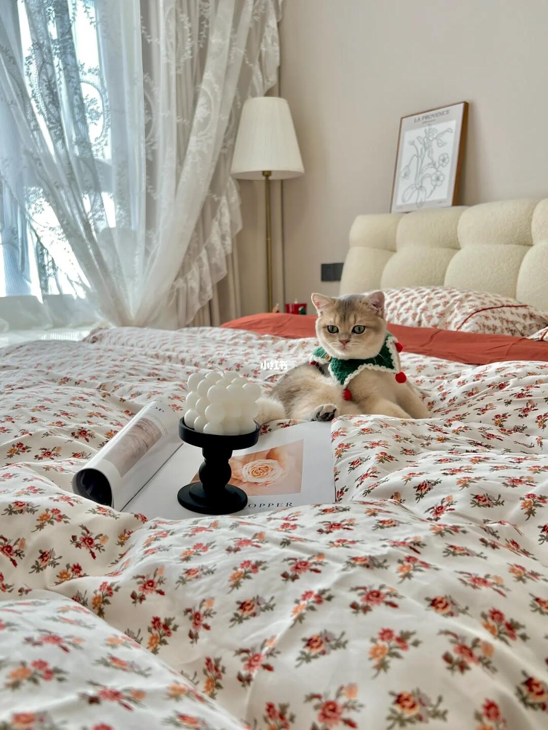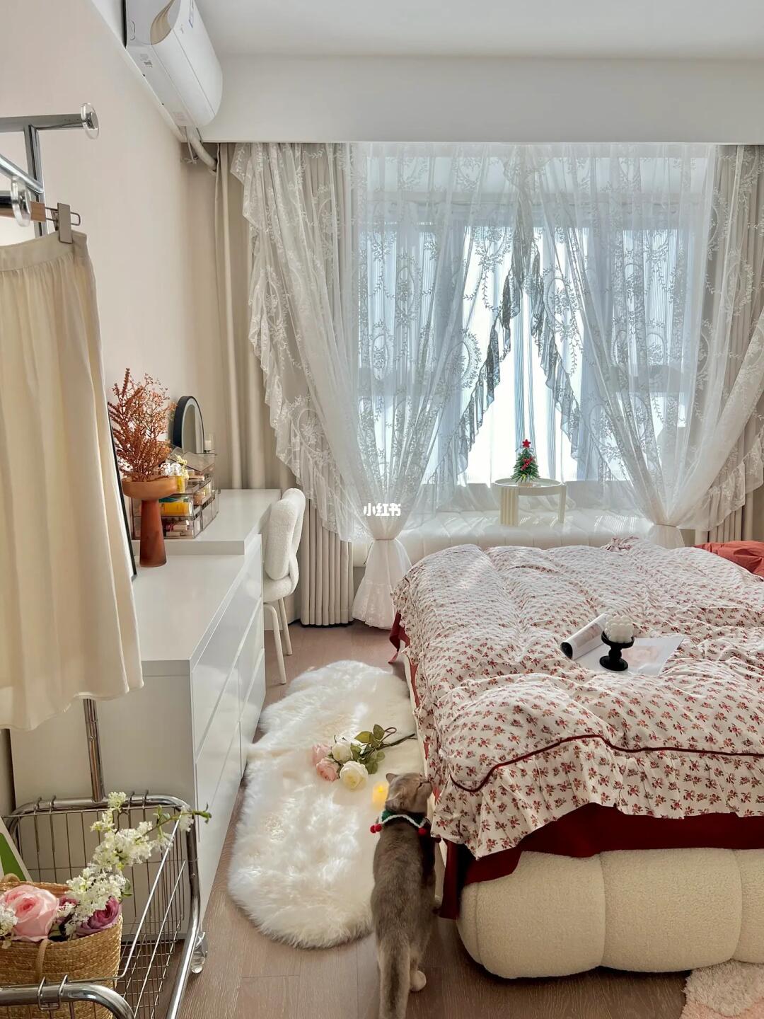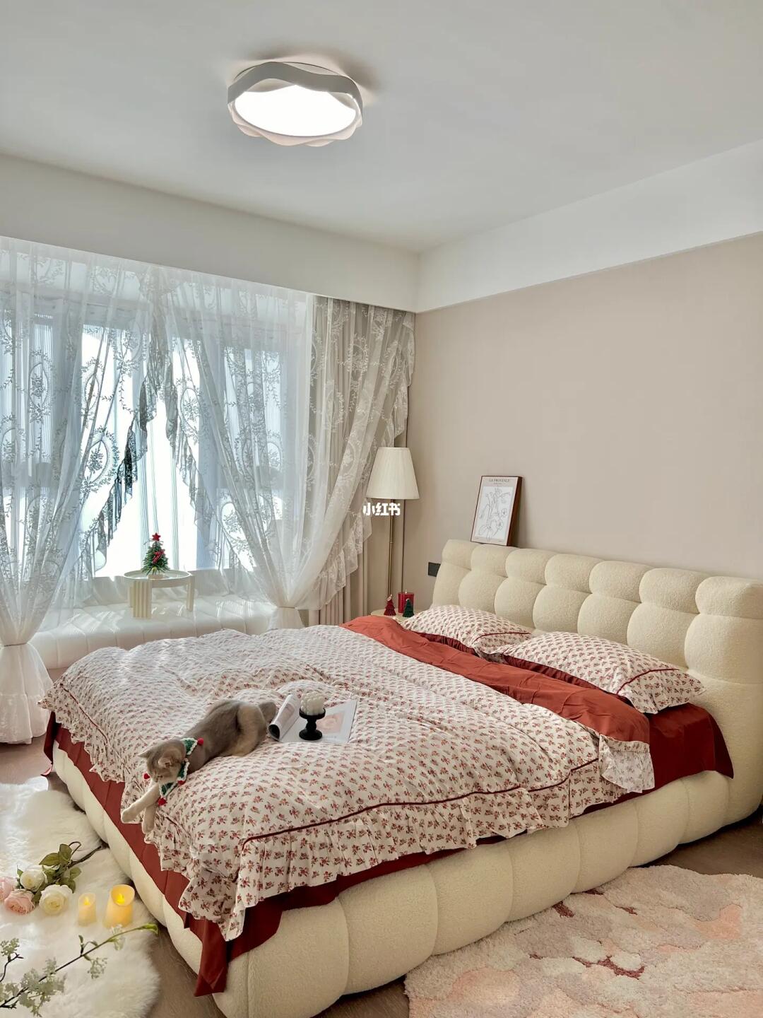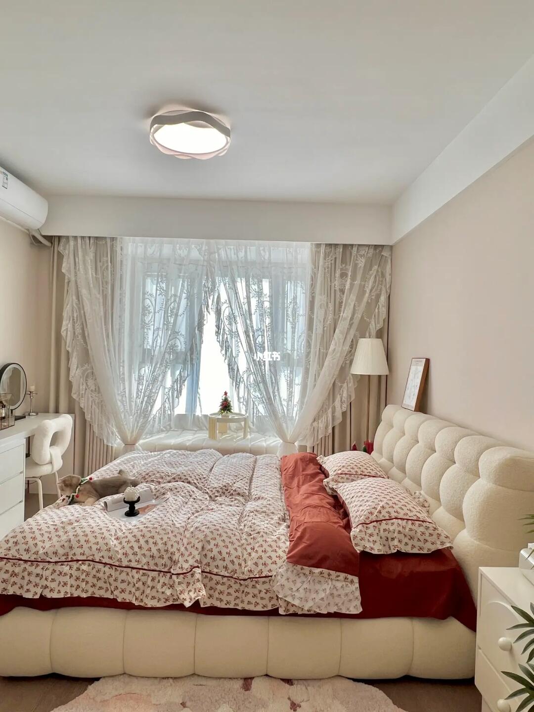 我的奶油卧室真的太温馨啦✨ 奶油色的床搭配法式四件套 配上花边吸顶灯和蕾丝纱帘 奶呼呼的复古又浪漫💕 和小猫一起宅在家🐈 懒洋洋的太阳晒到飘窗垫上 暖呼呼的真的好舒服~