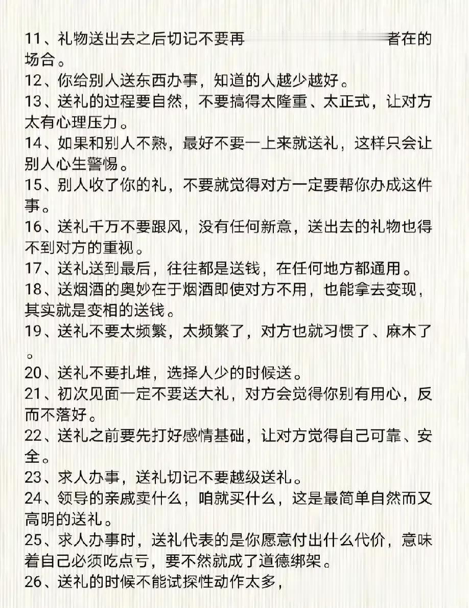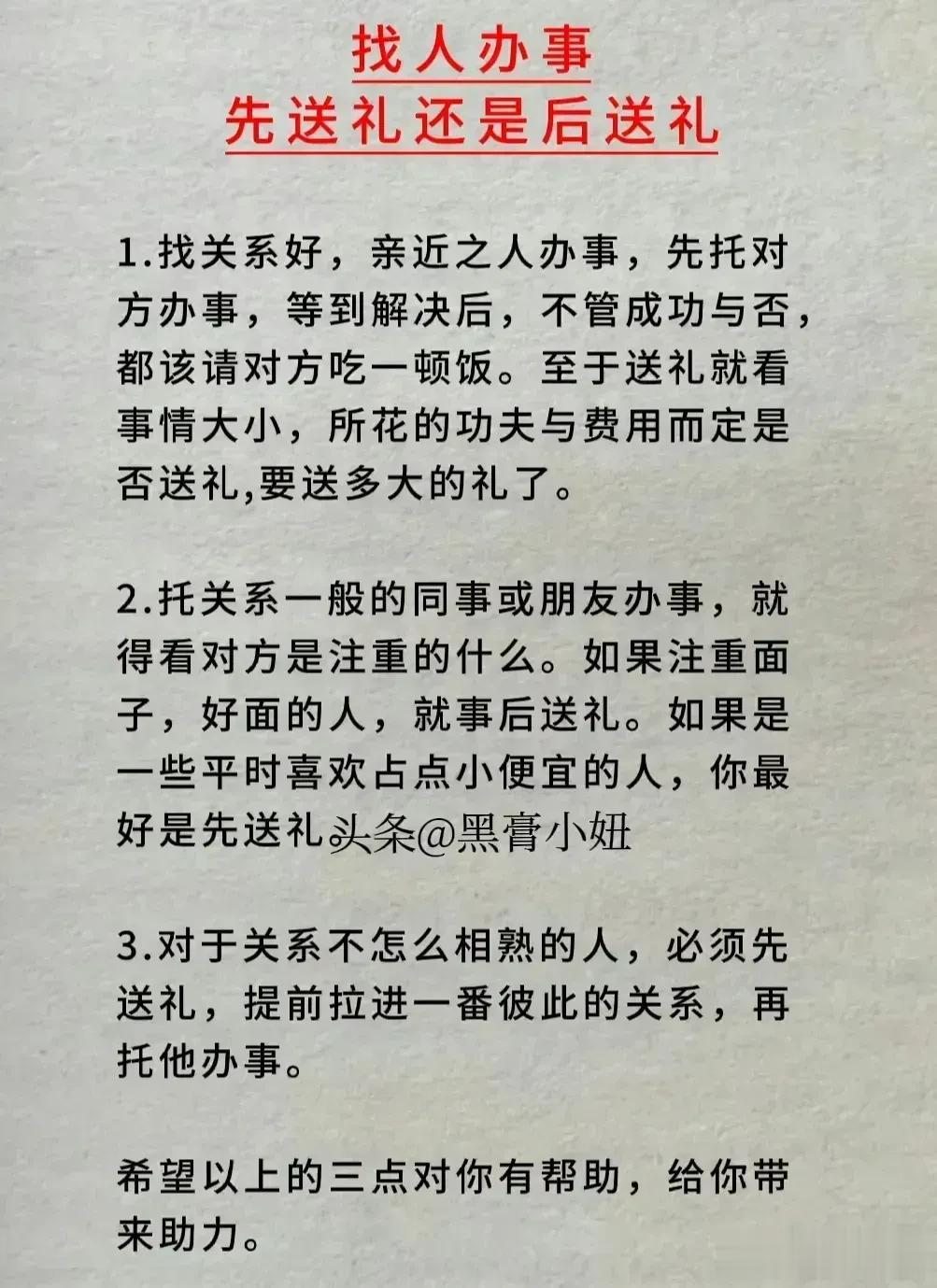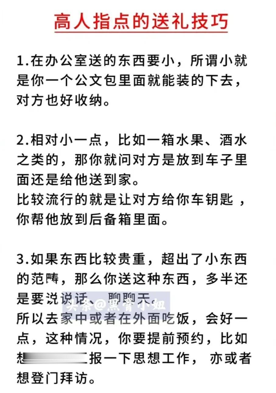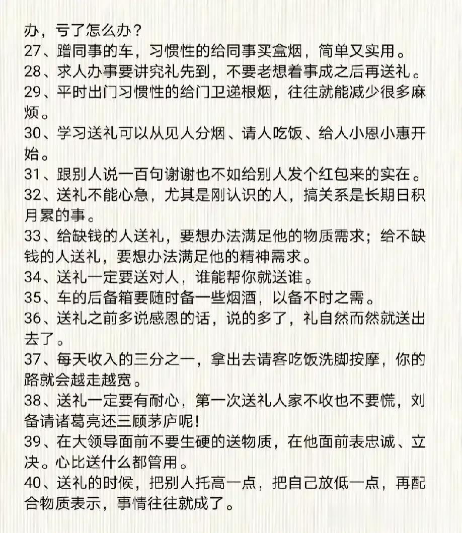 这句话太精辟了!你有多会送礼,就有多成功!原来会送礼的人,混得都不差!第一次见到这么全的送礼潜规则和技巧,若悟透一二,让你混的风生水起! 王志文说:"会送礼,会求人的人,改变命运都非常简单。" 想求人办事,必须要会送礼,正确的送礼和求人方式可以建立良好的人际关系,增加成功的机会。真的是那一句,礼送成了,事就好了! 更多技巧在下方链接!感兴趣的朋友可以多读一读! 中国式应酬送礼办事