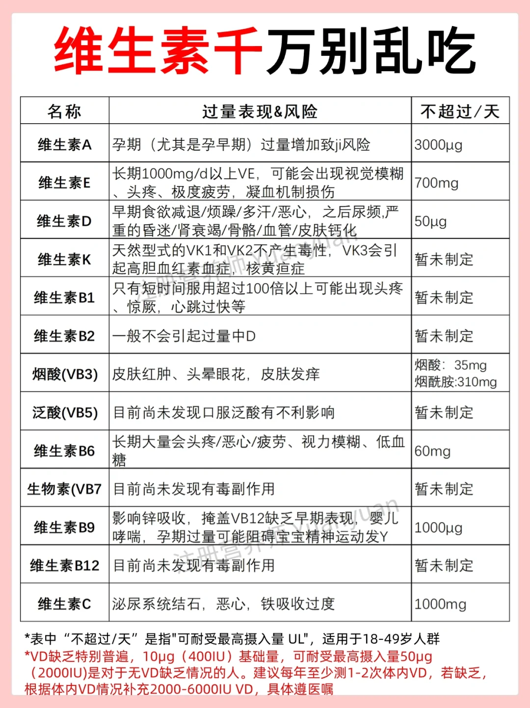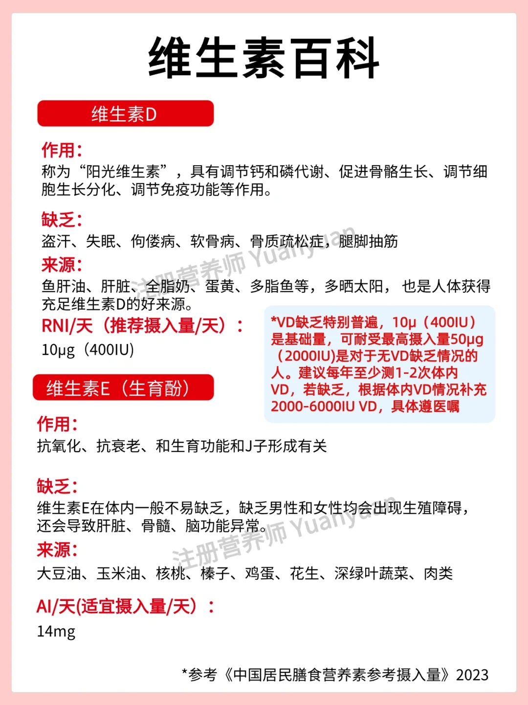 ⚠️⚠️⚠️需要额外注意维生素D, 我们国家VD缺乏特别普遍,10μg(400IU)的推荐摄入量是基础量,可耐受最高摄入量50μg(2000IU)是对于无VD缺乏情况的人。建议大家每年至少测1-2次体内VD,若缺乏,根据体内VD情况补充2000-6000IU VD,具体遵医嘱。