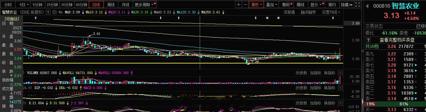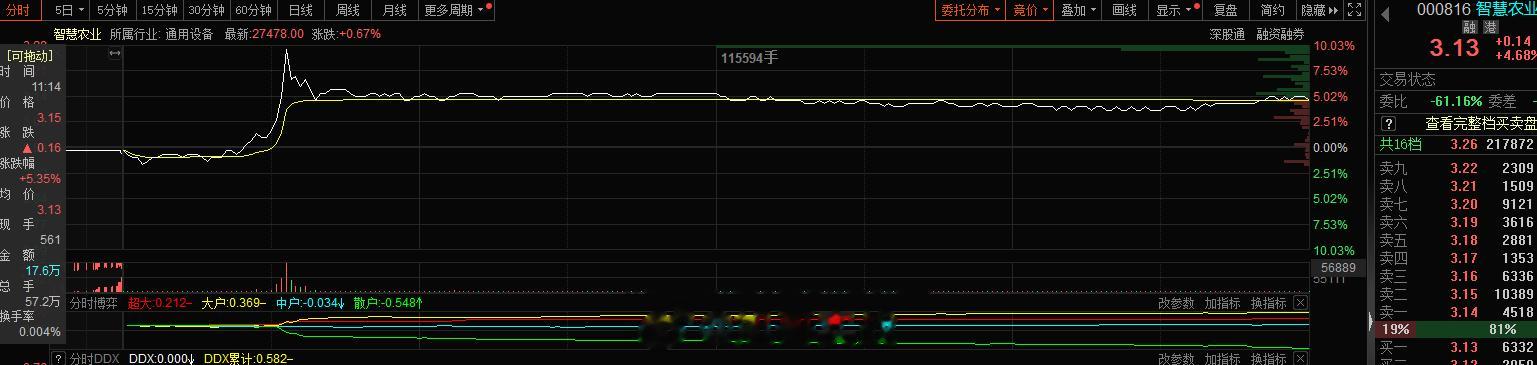 聊下 智慧农业 000816,叠加概念通用设备 发电机概念........今日早盘是有异动,拉升触及涨停,不过没有封死,回落均价下布局,想着是要回封,不过结果是没有成功