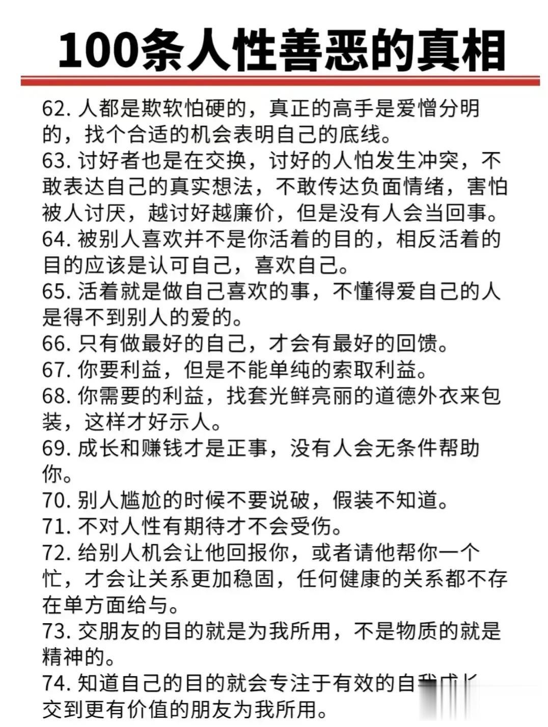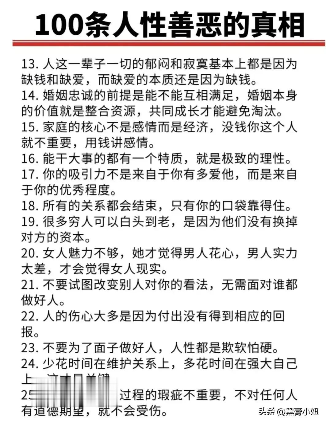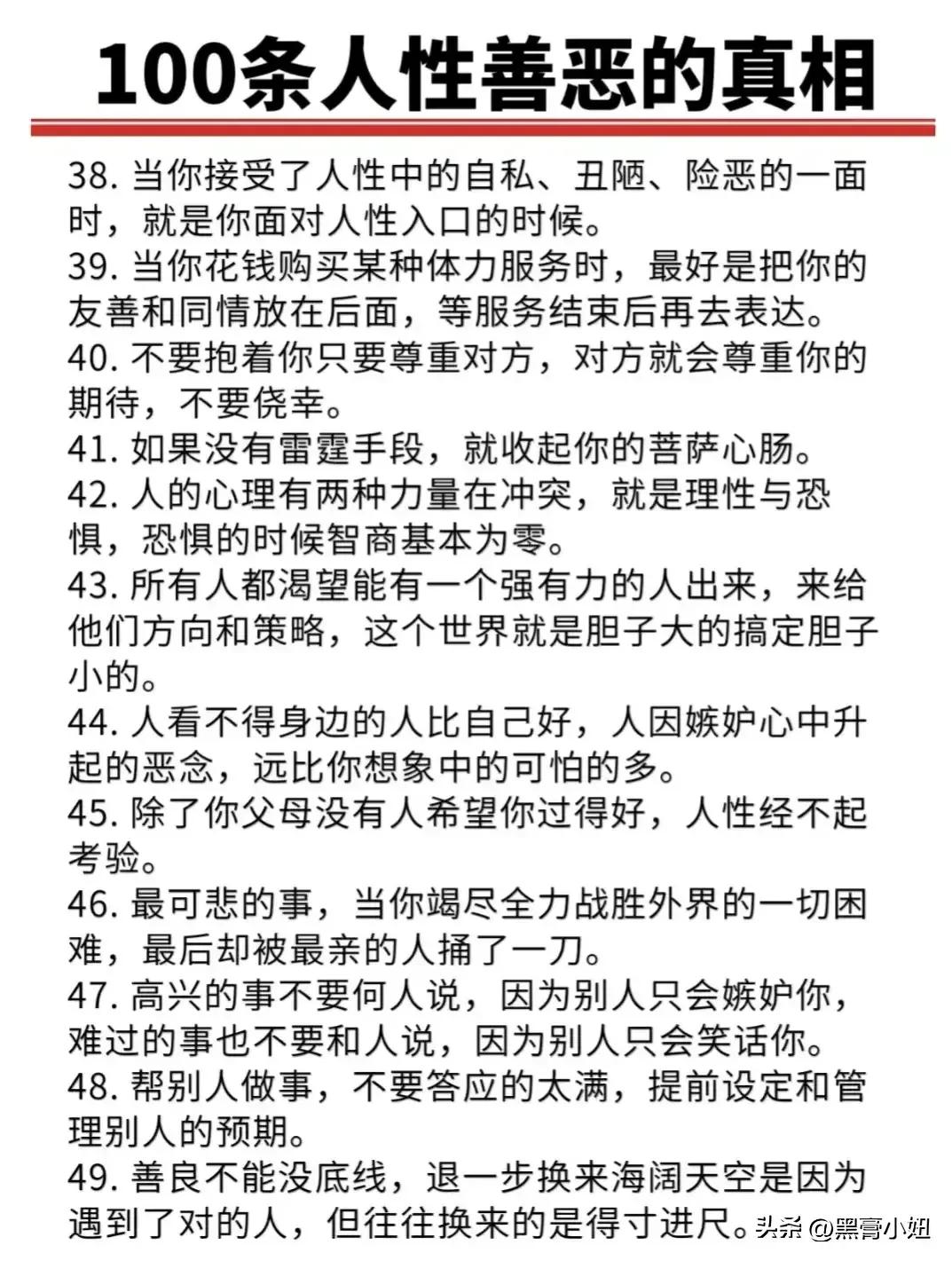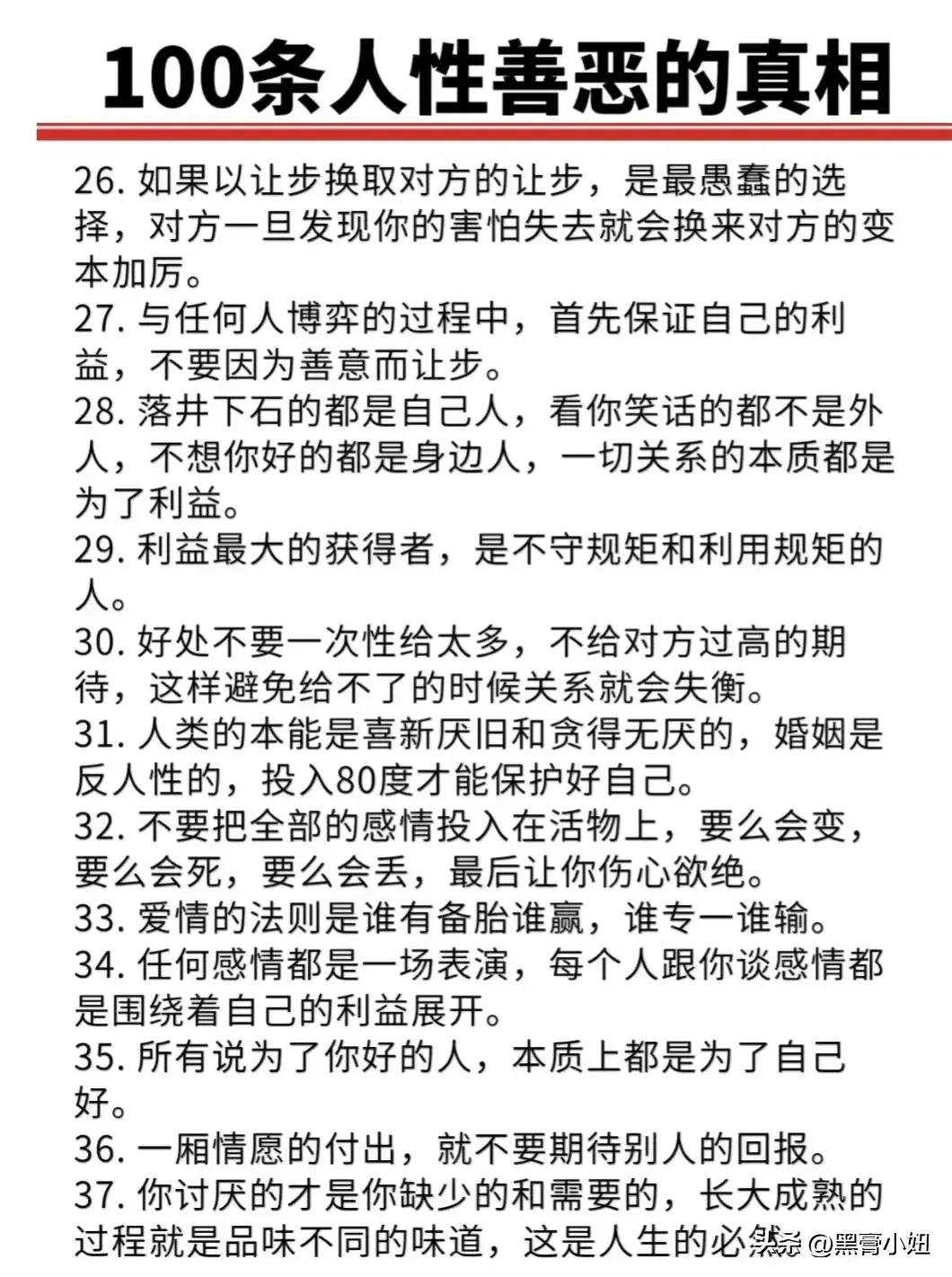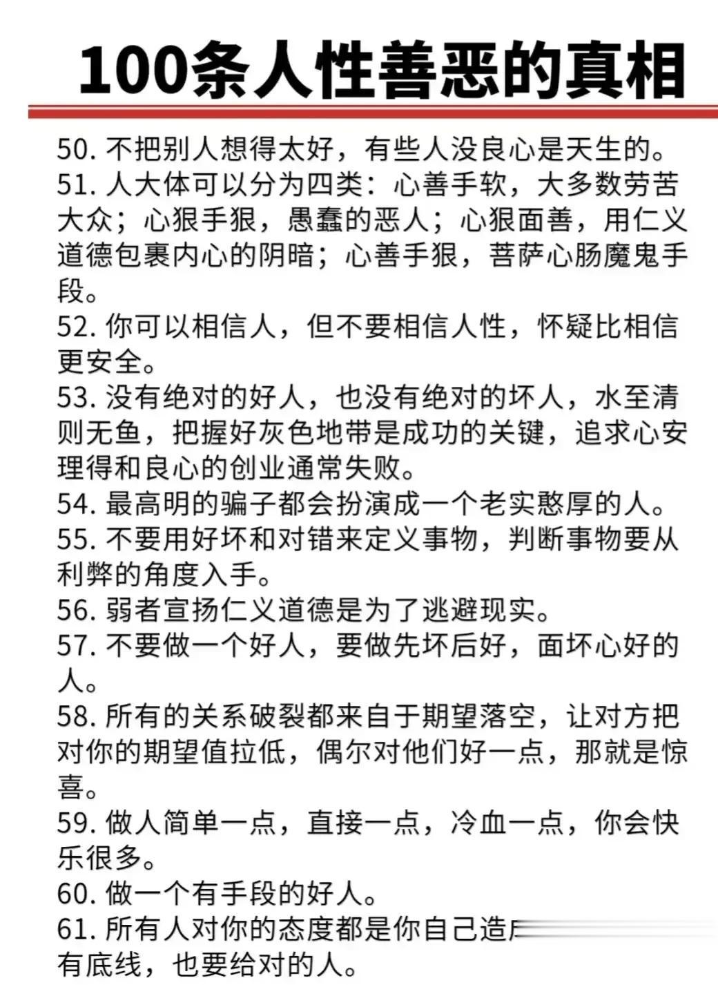 人性的100条善恶真相,道出所有人的心声,真正的高手,早就看透人性,了解人心! 或许厚黑,但你若是不理解这个世界的显规则和潜规则,就很容易吃亏!人性到底有多黑暗?看看你就知道了!这是我见过把“人性”讲得最通透最全的话,很现实,句句扎心,字字见血! 比如不要为了面子做好人,人性都是欺软怕硬。 从利益角度去分析人,参透自私本性,人性善恶要以利益大小为参照。 不要对任何人,抱有任何道德洁癖的期望,这个世界上每个灵魂都半人半鬼,凑太近了谁也没法看 乞丐不会妒忌百万富翁,但是他肯定会妒忌其他收入更高的乞丐 人走茶凉,在职场是常见的事儿,不管曾经的关系有多好,慢慢的也一样。 你每天给一块钱,一天不给别人就会骂你恨 你,你每天给一巴掌,一天没给别人就会感激你,人性就这么贱。 …… 强者都知道的人性真相,通人性者通幸福,懂得越早你就混得越好,没事多看一看,教你读懂人性,提升认知,管理人性,了解人性,会让你少走弯路少吃亏! 读懂人性醒脑指南