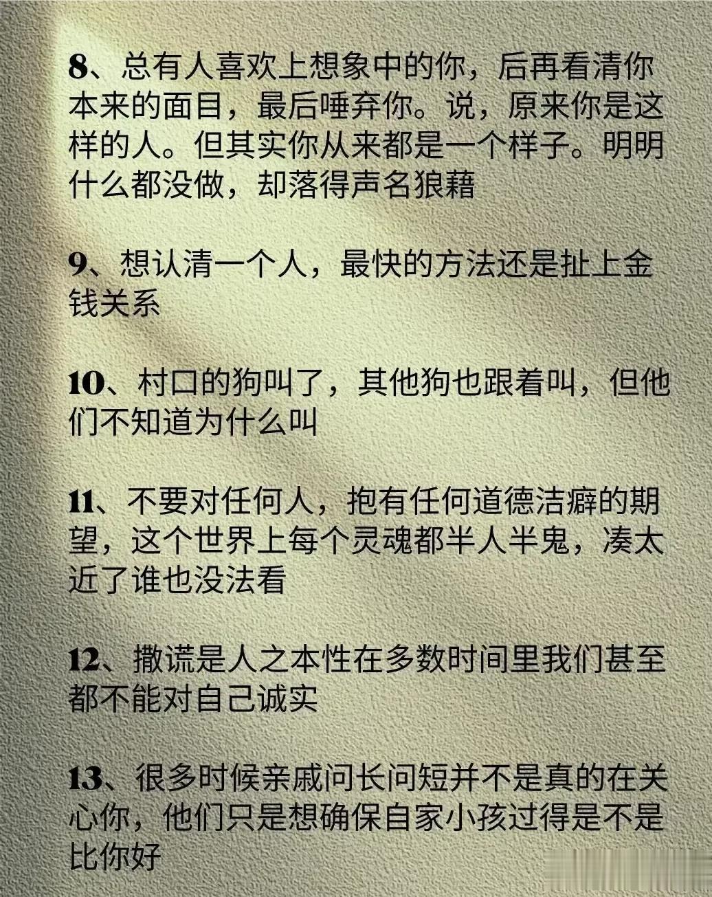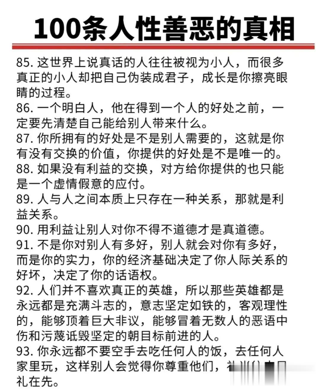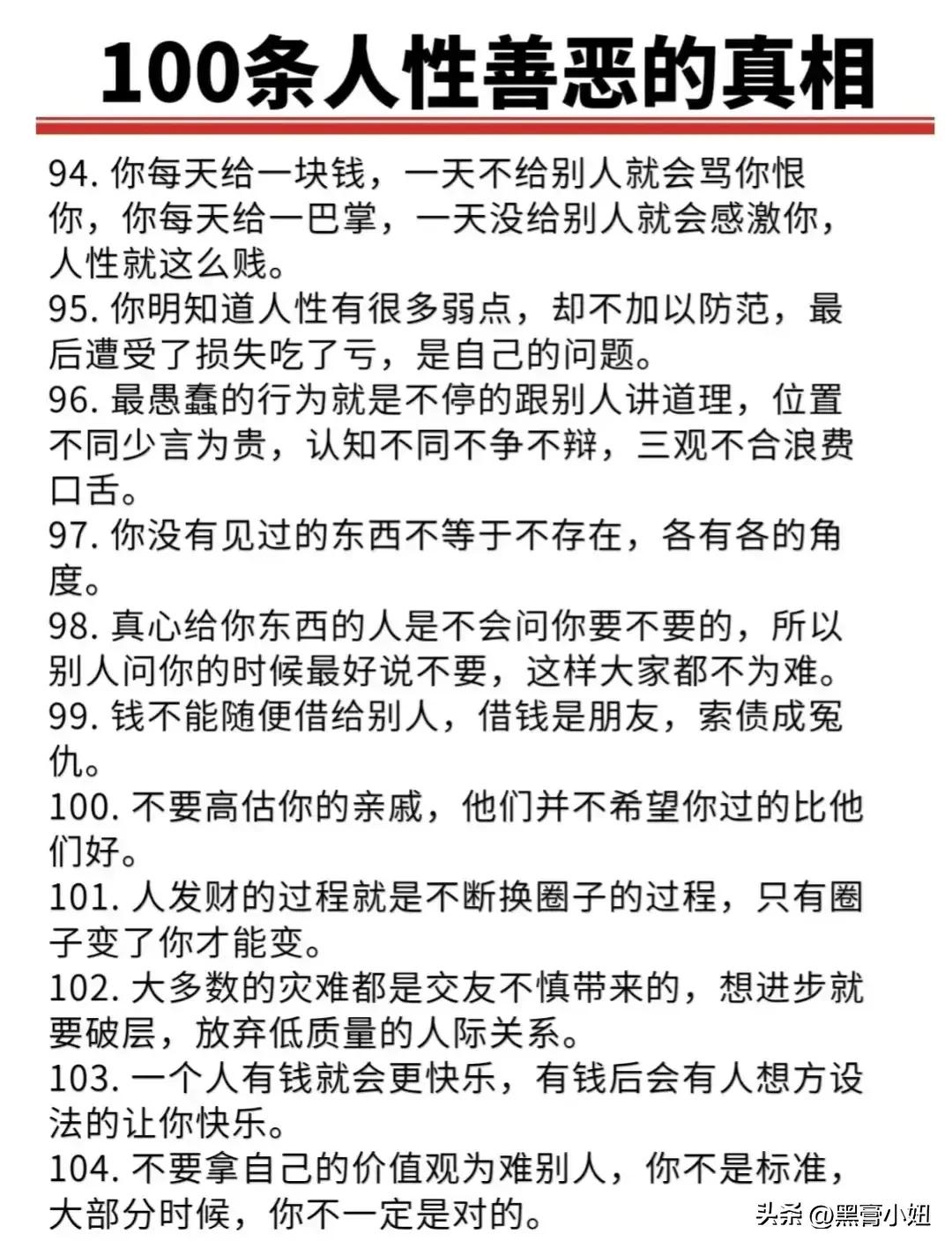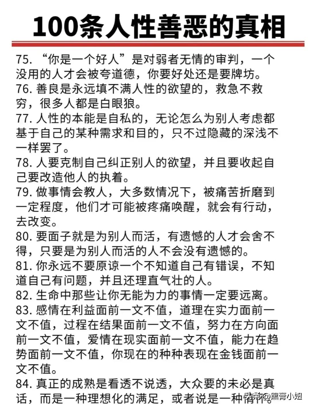 人性的100条善恶真相,道出所有人的心声,真正的高手,早就看透人性,了解人心! 或许厚黑,但你若是不理解这个世界的显规则和潜规则,就很容易吃亏!人性到底有多黑暗?看看你就知道了!这是我见过把“人性”讲得最通透最全的话,很现实,句句扎心,字字见血! 比如不要为了面子做好人,人性都是欺软怕硬。 从利益角度去分析人,参透自私本性,人性善恶要以利益大小为参照。 不要对任何人,抱有任何道德洁癖的期望,这个世界上每个灵魂都半人半鬼,凑太近了谁也没法看 乞丐不会妒忌百万富翁,但是他肯定会妒忌其他收入更高的乞丐 人走茶凉,在职场是常见的事儿,不管曾经的关系有多好,慢慢的也一样。 你每天给一块钱,一天不给别人就会骂你恨 你,你每天给一巴掌,一天没给别人就会感激你,人性就这么贱。 …… 强者都知道的人性真相,通人性者通幸福,懂得越早你就混得越好,没事多看一看,教你读懂人性,提升认知,管理人性,了解人性,会让你少走弯路少吃亏! 读懂人性醒脑指南