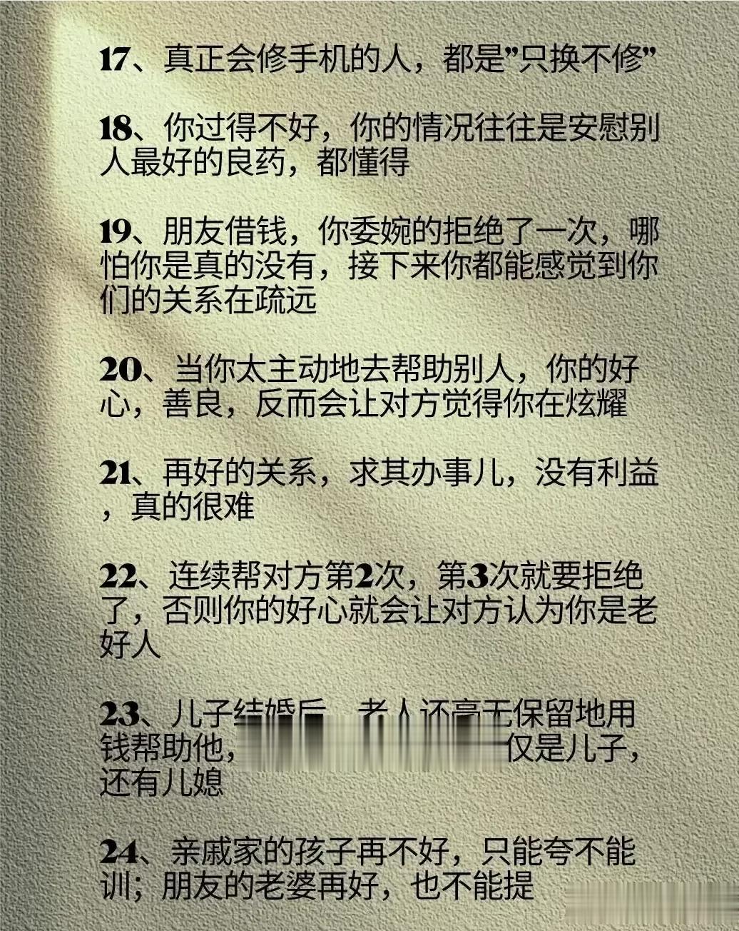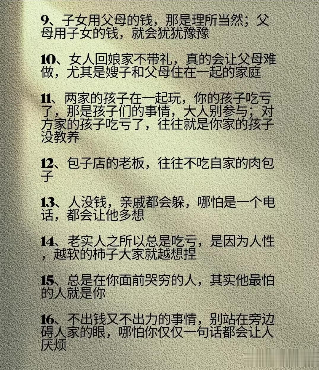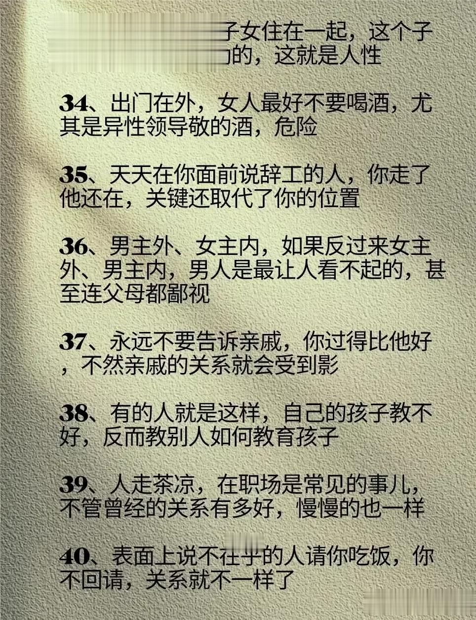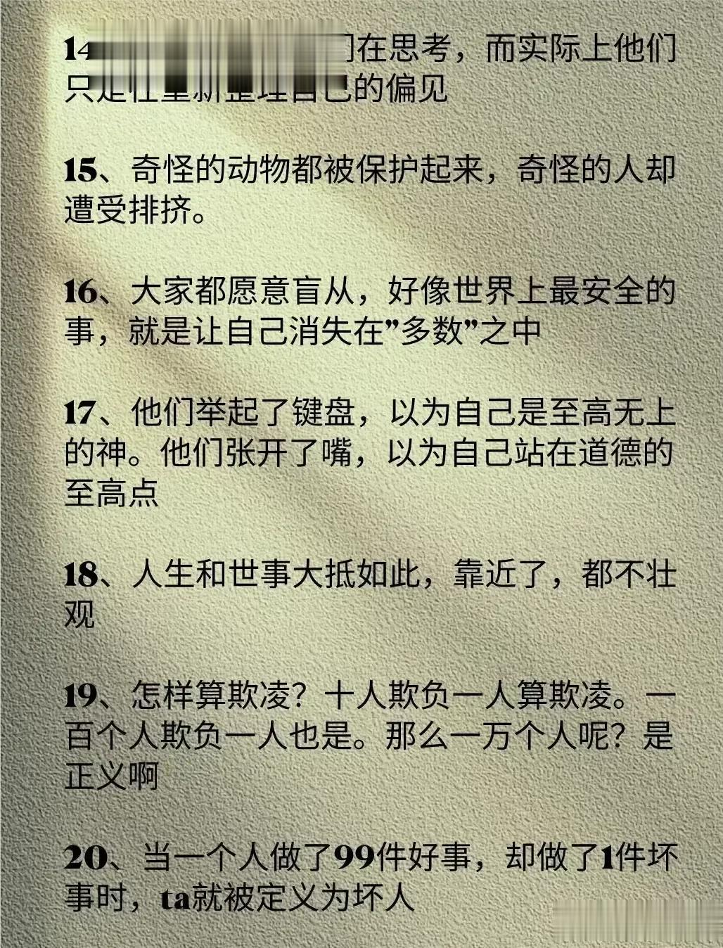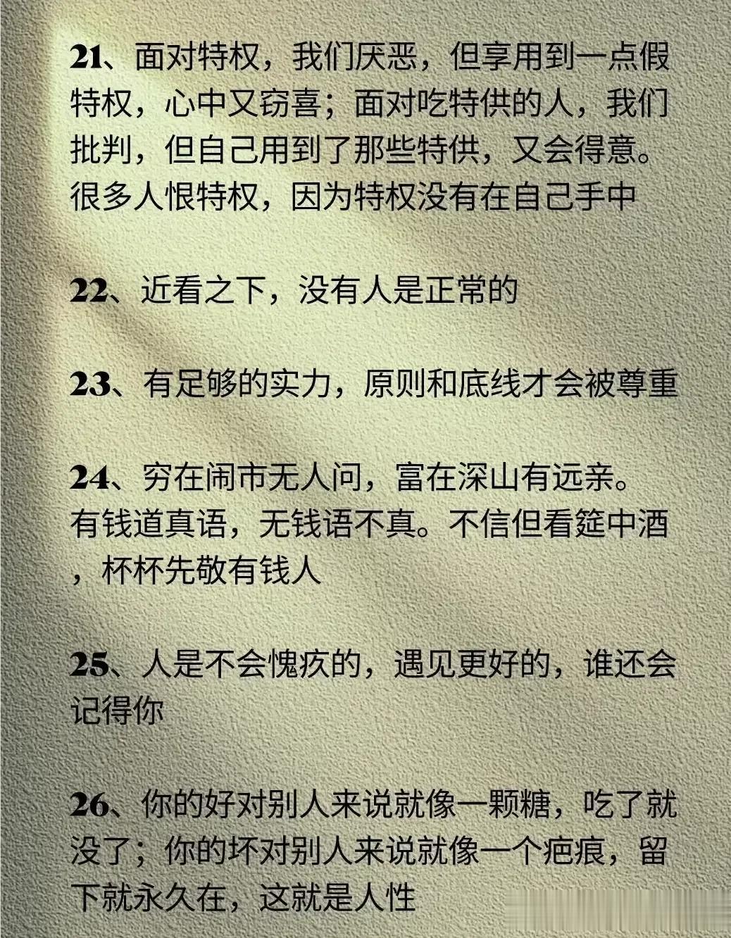 人性的100条善恶真相,道出所有人的心声,真正的高手,早就看透人性,了解人心! 或许厚黑,但你若是不理解这个世界的显规则和潜规则,就很容易吃亏!人性到底有多黑暗?看看你就知道了!这是我见过把“人性”讲得最通透最全的话,很现实,句句扎心,字字见血! 比如不要为了面子做好人,人性都是欺软怕硬。 从利益角度去分析人,参透自私本性,人性善恶要以利益大小为参照。 不要对任何人,抱有任何道德洁癖的期望,这个世界上每个灵魂都半人半鬼,凑太近了谁也没法看 乞丐不会妒忌百万富翁,但是他肯定会妒忌其他收入更高的乞丐 人走茶凉,在职场是常见的事儿,不管曾经的关系有多好,慢慢的也一样。 你每天给一块钱,一天不给别人就会骂你恨 你,你每天给一巴掌,一天没给别人就会感激你,人性就这么贱。 …… 强者都知道的人性真相,通人性者通幸福,懂得越早你就混得越好,没事多看一看,教你读懂人性,提升认知,管理人性,了解人性,会让你少走弯路少吃亏! 读懂人性醒脑指南