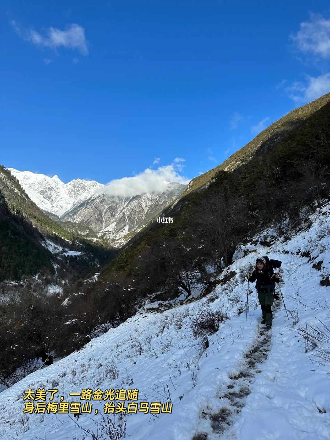 · 我们真的是被大自然眷顾啊[哭惹R]🙏 最后一天 重装尼农峡谷 离开的路上 眼前是白马雪山🏔️ 身后是日照金山 🏔️神女峰、吉娃仁安一路灿烂🌞 · 14公里1100下降20kg负重 又是快乐走路的一天呐! 从冬天白雪皑皑走到秋季缤纷金色 雨崩2024再见啦👋~ ·