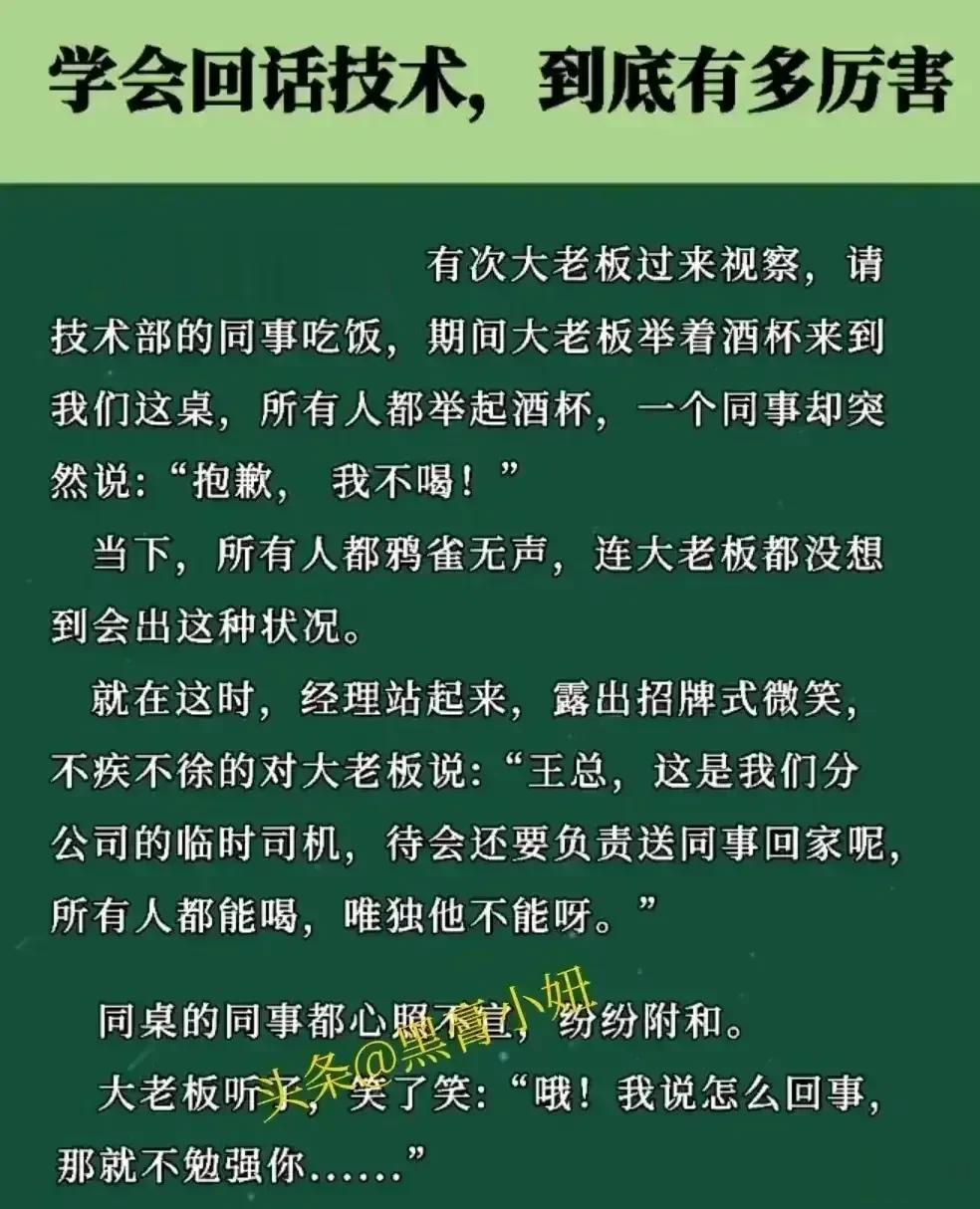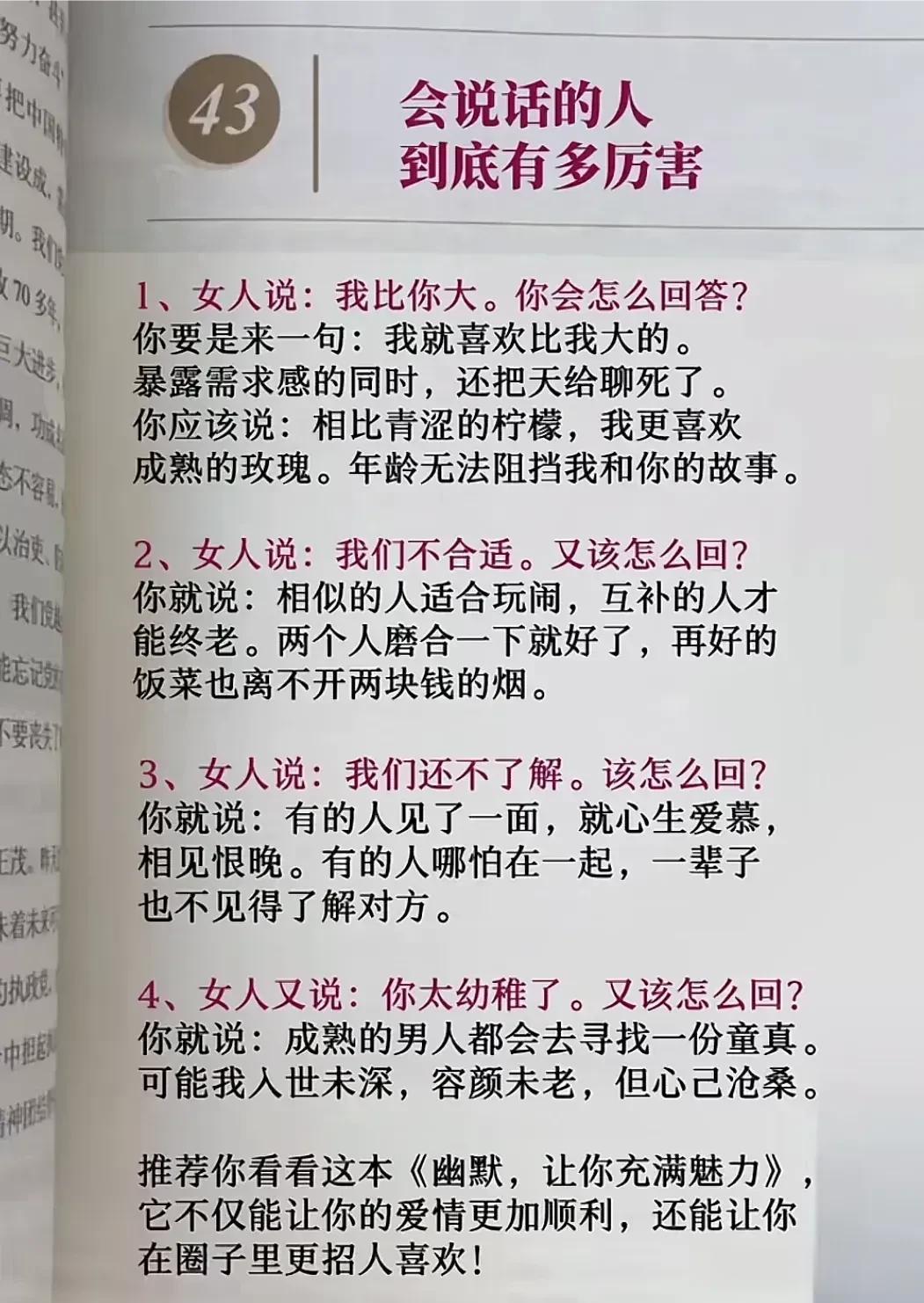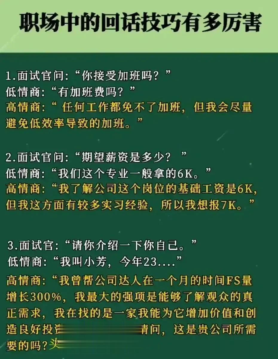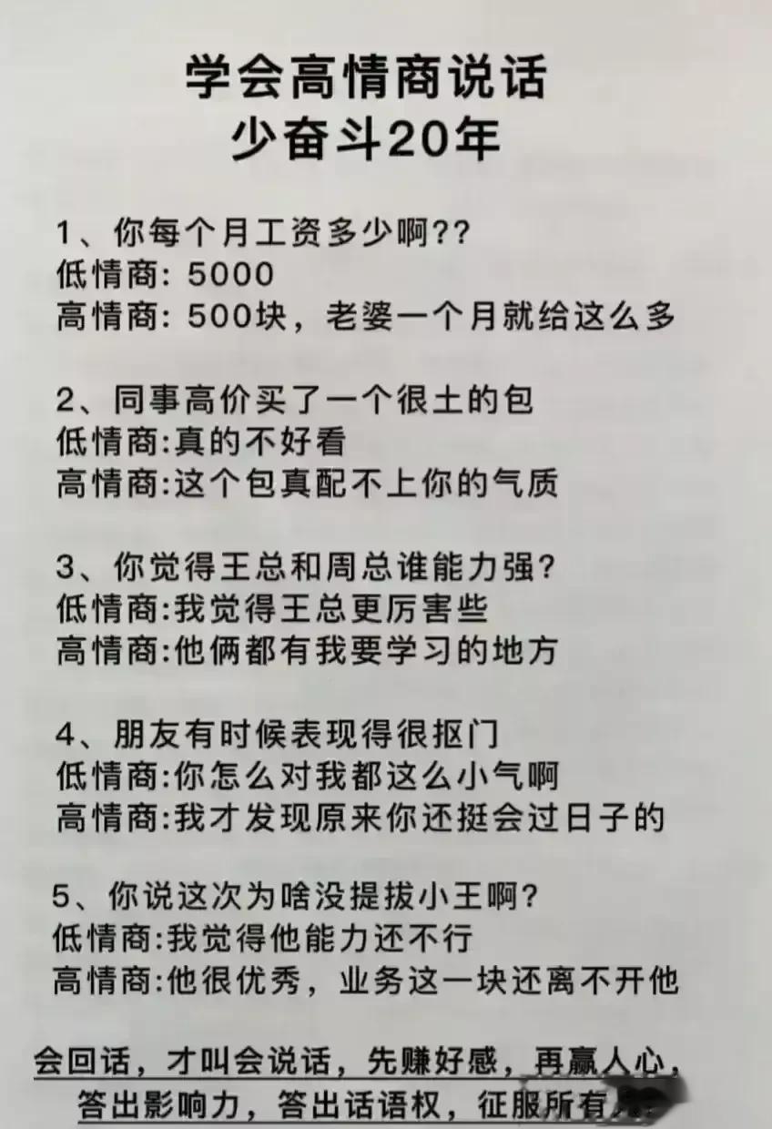 “会说话会回话”的人,到底有多厉害!看完下面的聊天话术,你就明白了,想要在职场上越混越好,不仅要会说话还要会回话,才能赢得更多的机会! 比如领导给我转了早餐钱,该不该收? 面试官问:“你接受加班吗” 面试官问:“期望薪资是多少?” 领导说你辛苦了,该怎么回答? 别人找你借钱时,该怎么回绝? …… 总之,回话是一门技术,也是一门艺术。升职加薪的前提是会说话。要想得到领导的器重和信任,就必须学会把话说到领导心里。推荐你看看下方这套回话沟通技巧书,一看就会的口才攻略,它不仅能让你的爱情更加顺利,还能让你在圈子里更招人喜欢! 沟通智慧回话技术