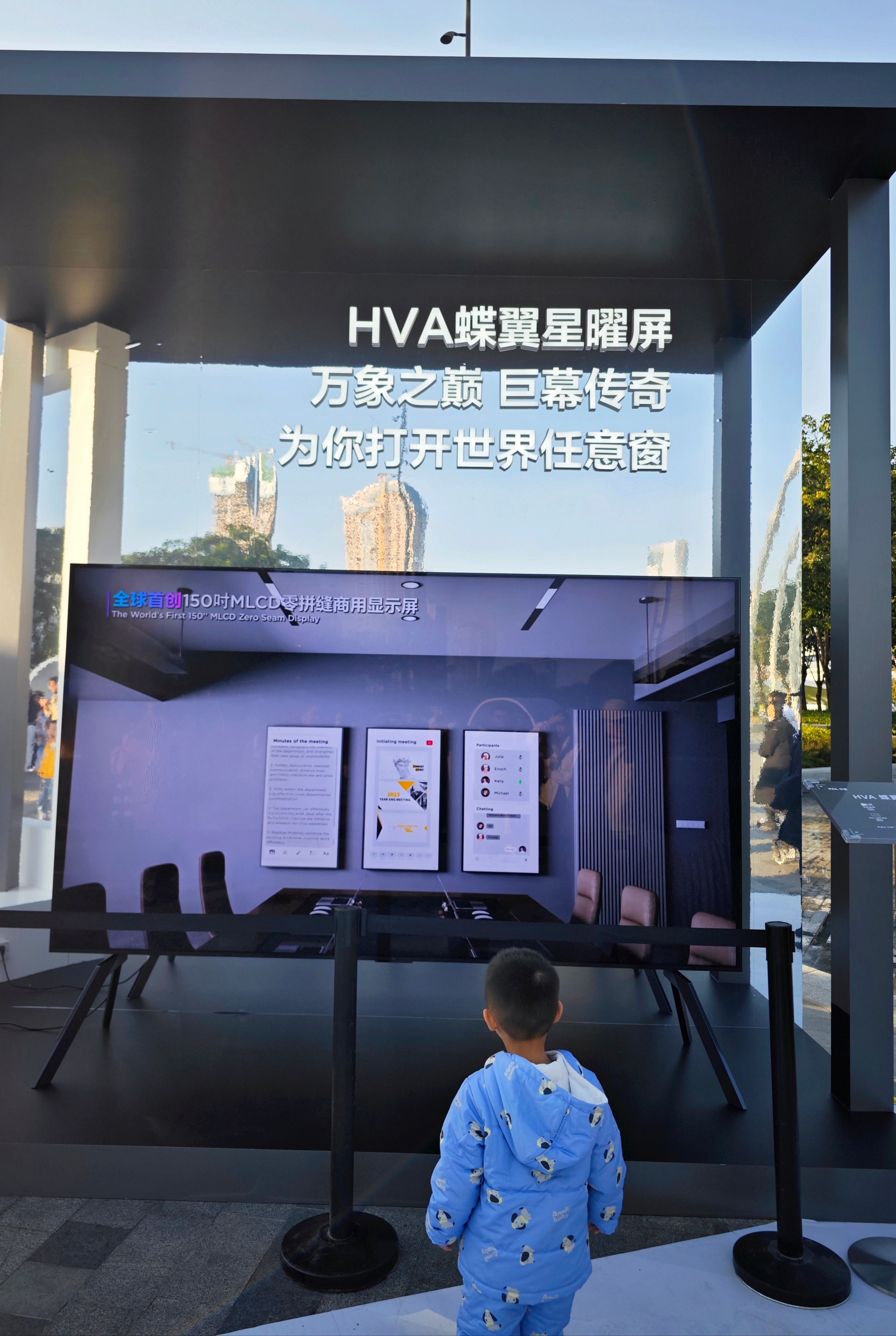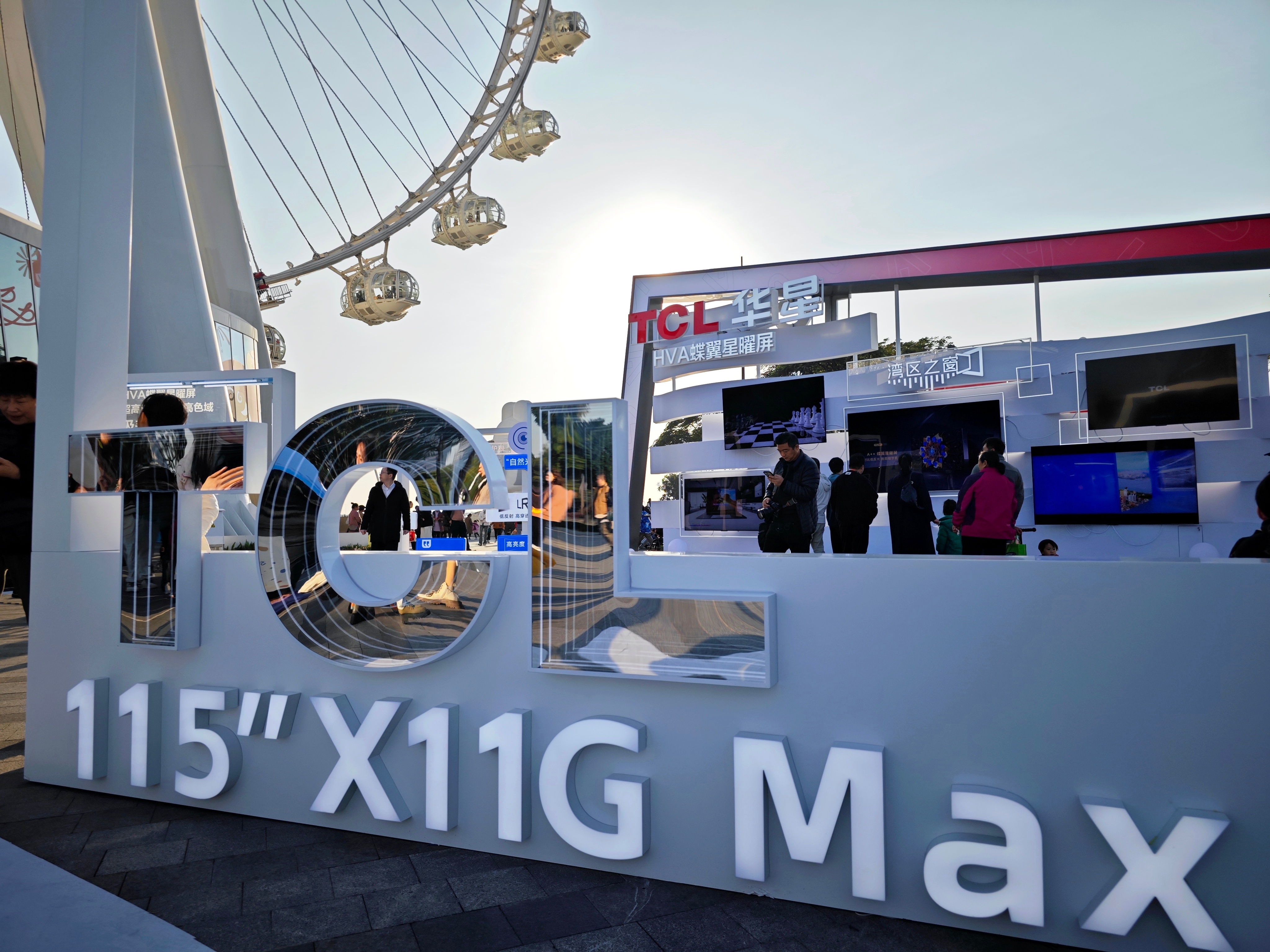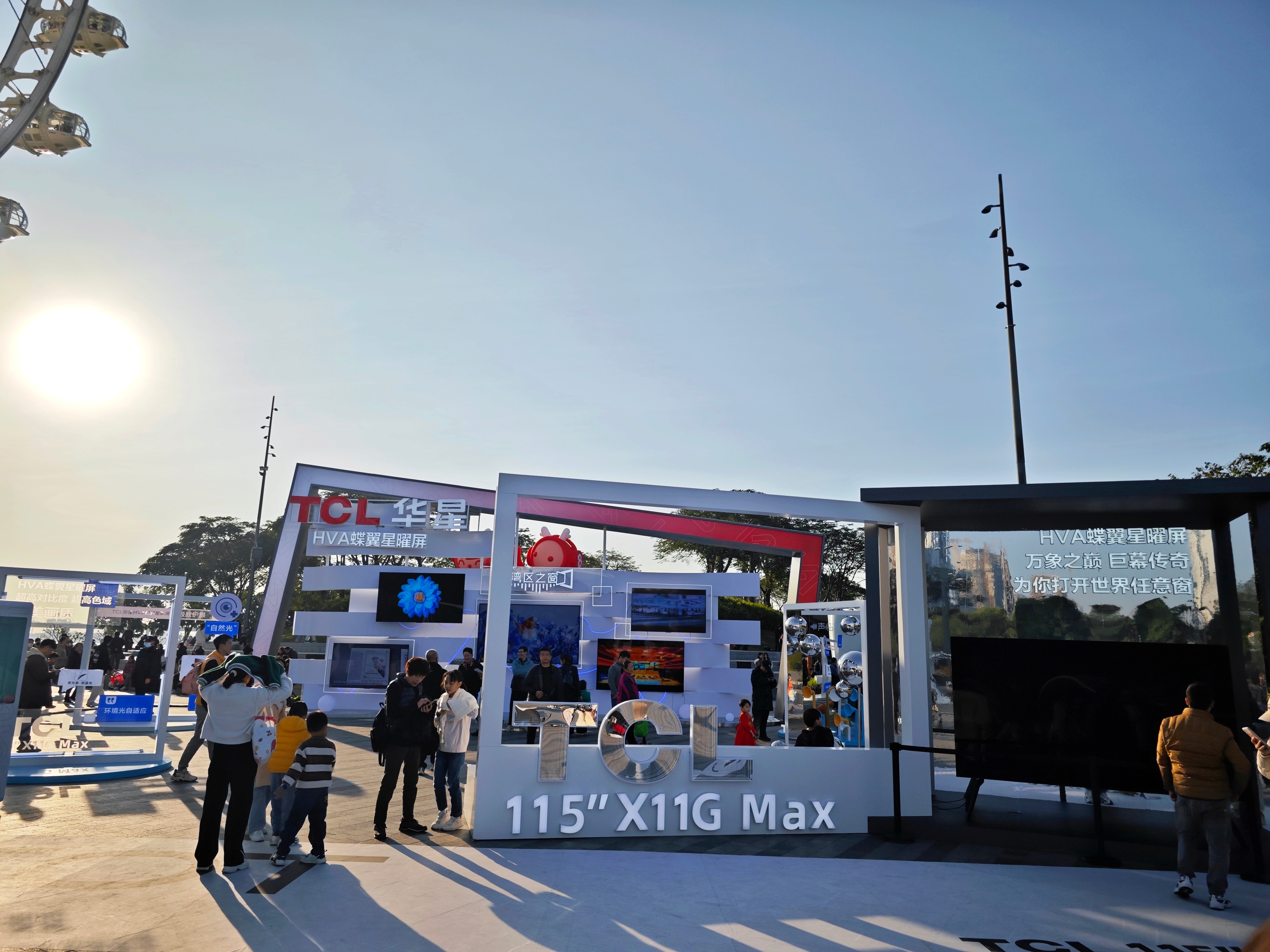 现场摆放了115英寸的X11G MAX巨幕电视,搭载20000+级分区量子点控光,Mini-LED背光技术,5000尼特峰值亮度,HVA蝶翼星曜屏,低反射率膜有效降低环境光反射对画面的干扰,配合高亮度高对比度,在户外显示也是顶级表现!