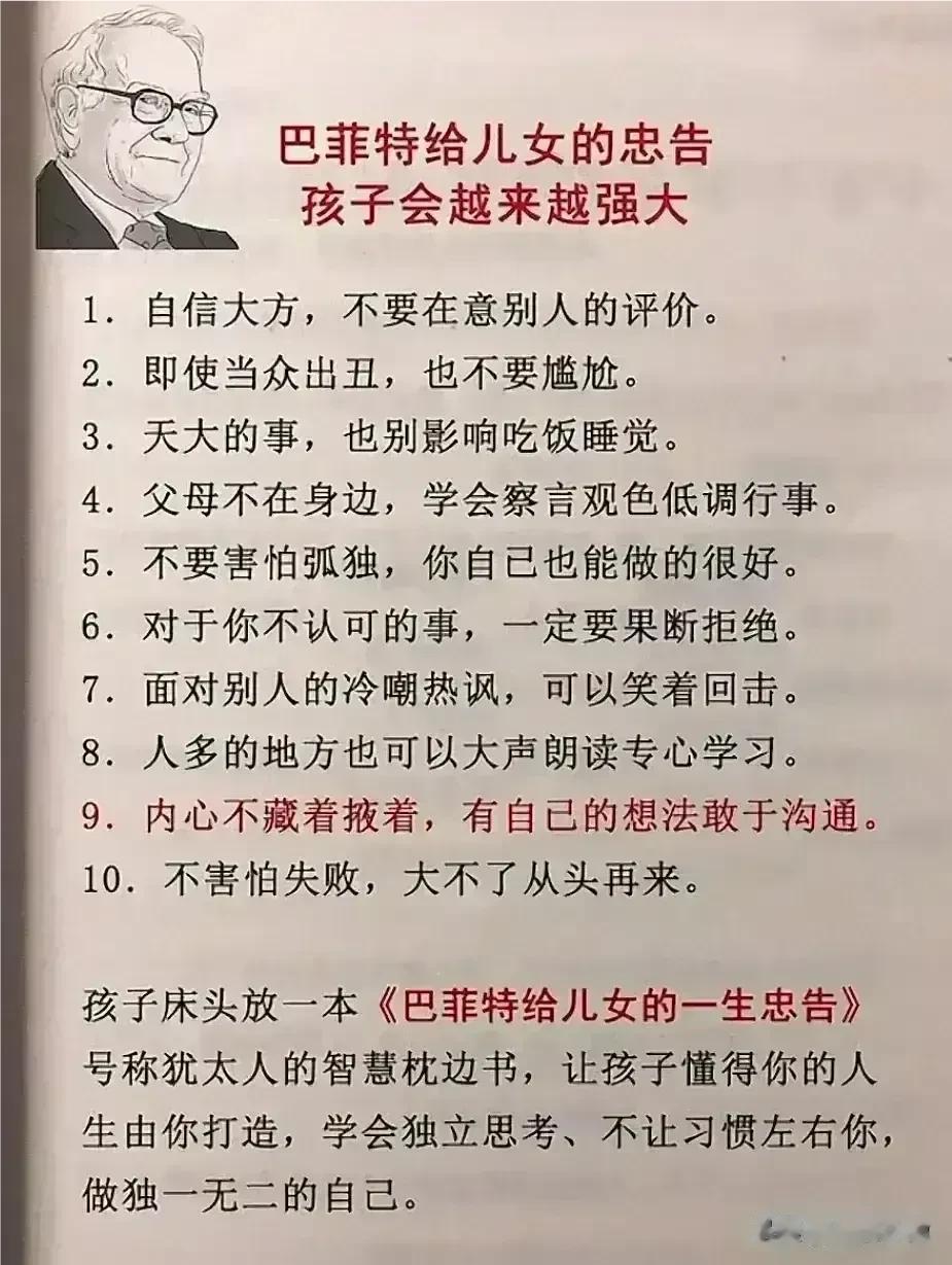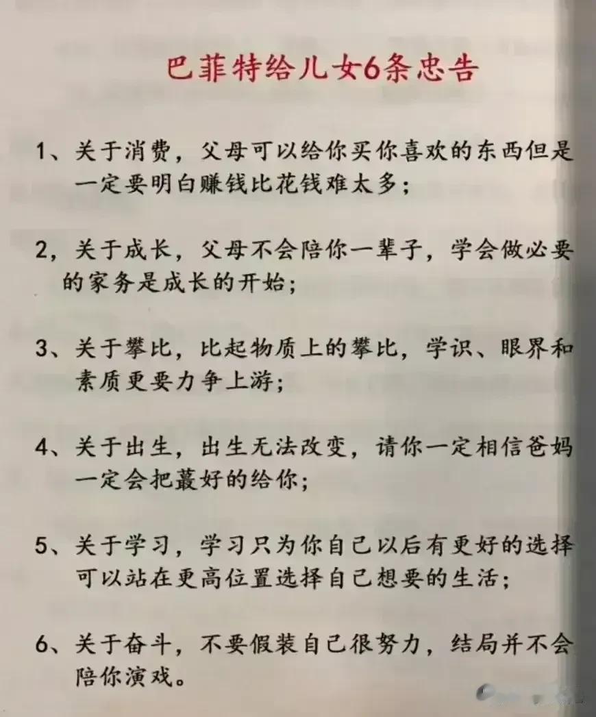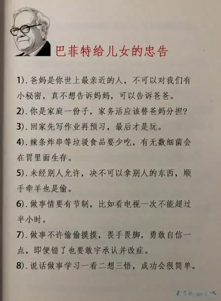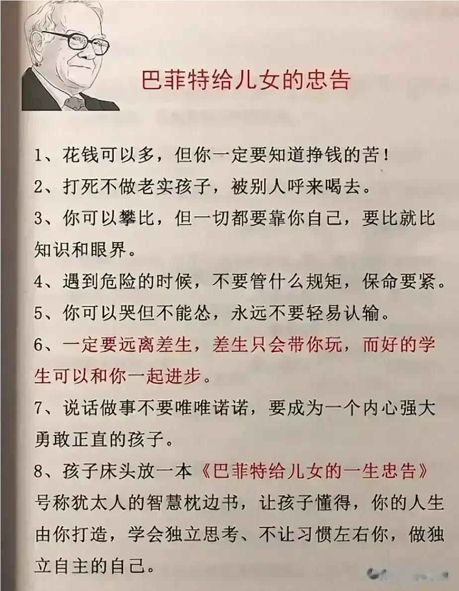 巴菲特一段让人醍醐灌顶的话,12岁之前一定要告诉孩子,长大少吃亏,每一条都发自肺腑,经典又现实,比如付出惨痛代价的五件事、给儿女的金钱观、对你无微不至的男人为什么不能嫁、给儿女为人处世的忠告等等,不愧是伟大的投资家,没想到教育孩子方面都这么优秀!赶紧学一学! 《巴菲特给儿女的一生忠告》号称犹太人的智慧枕边书,让你站在巨人的肩上更好的教育下一代。 巴菲特的忠告家庭教育