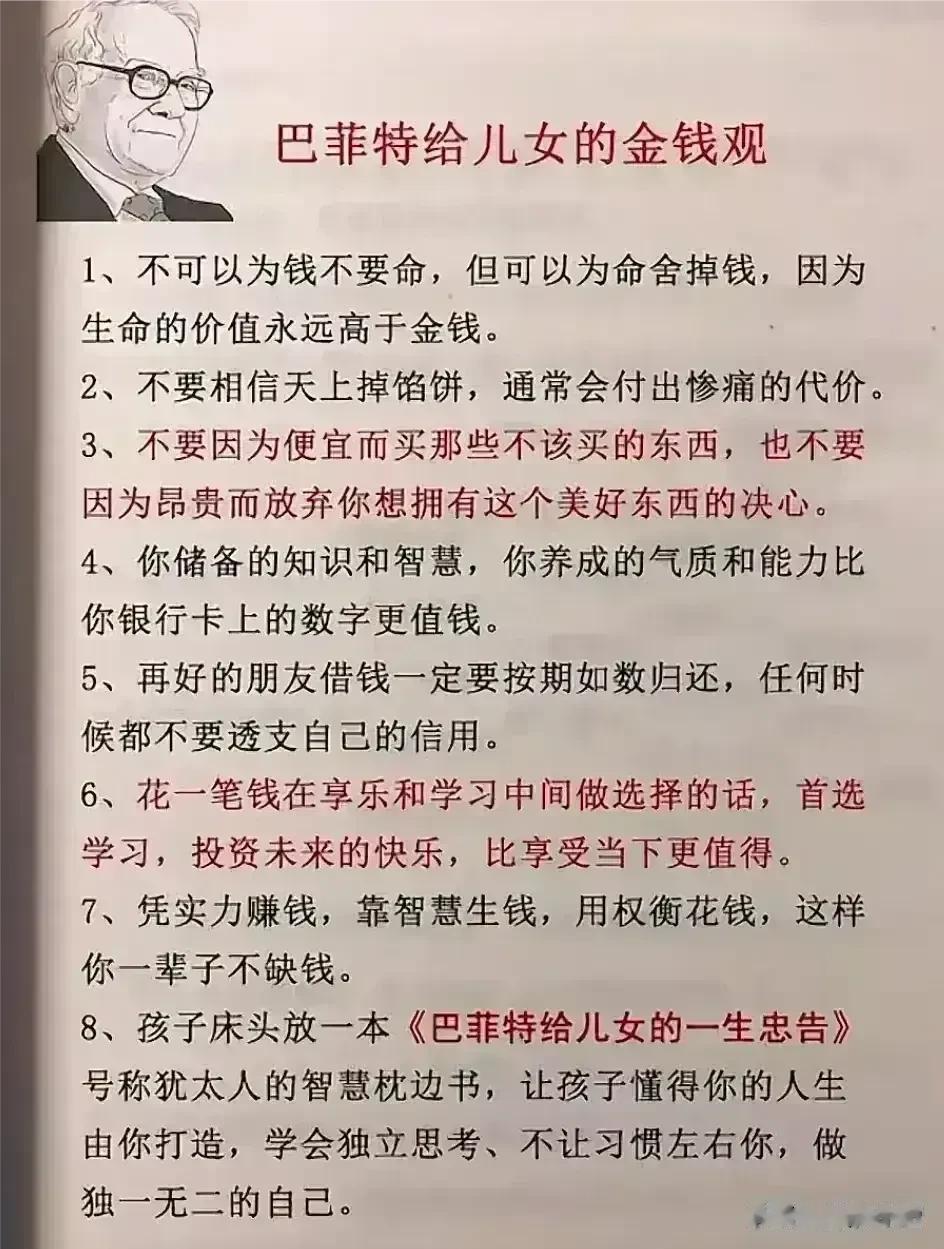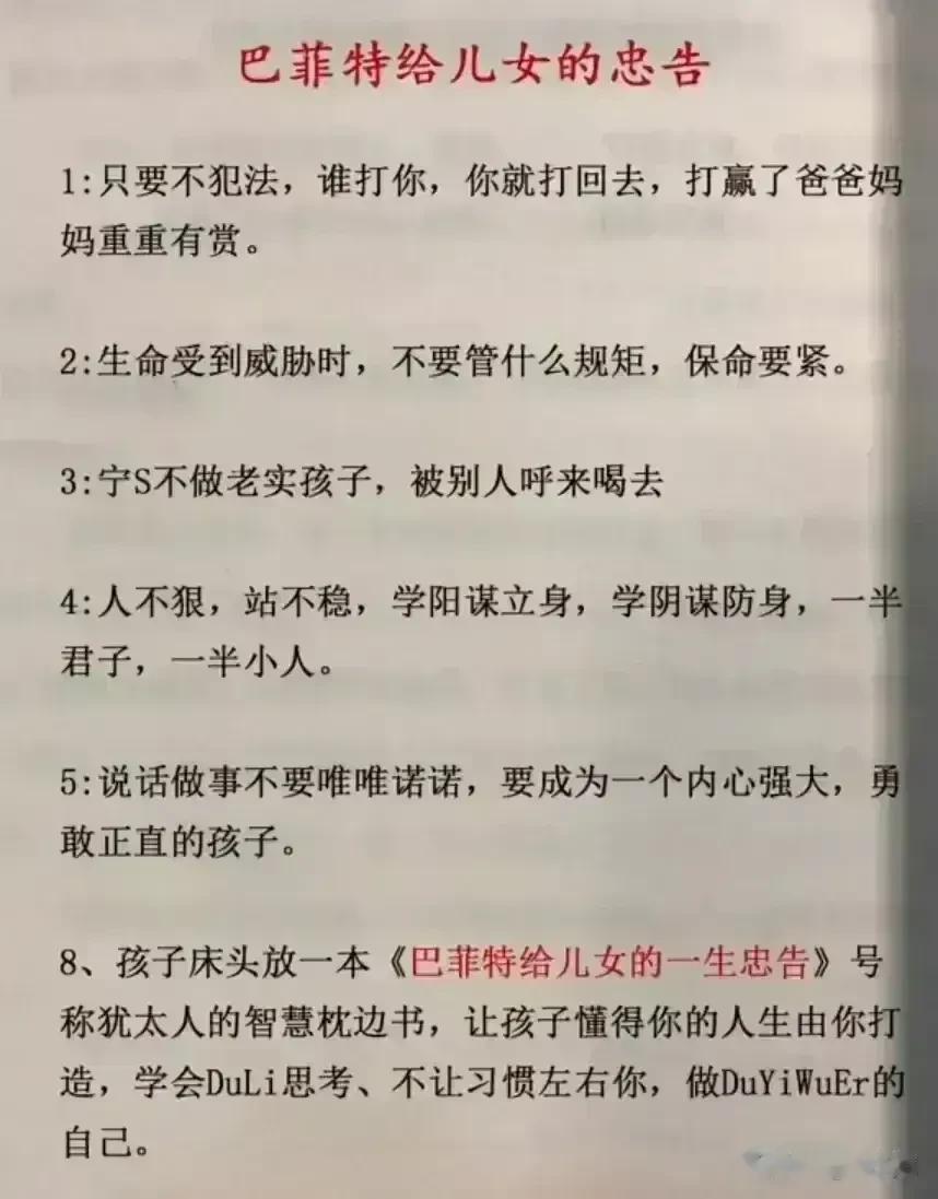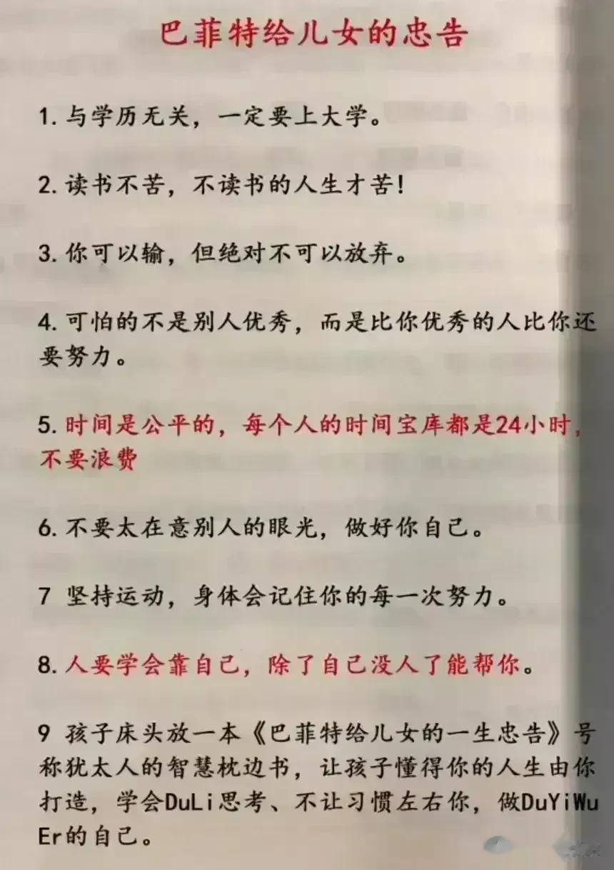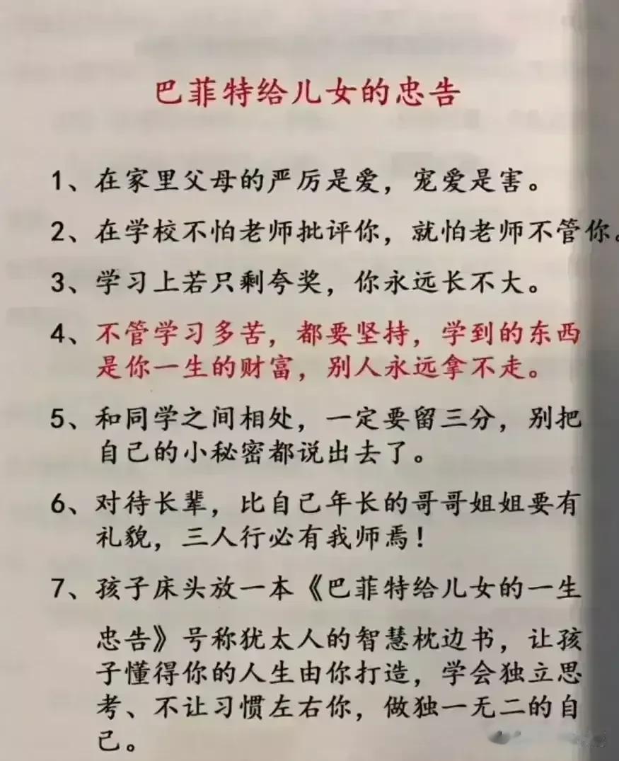 巴菲特一段让人醍醐灌顶的话,12岁之前一定要告诉孩子,长大少吃亏,每一条都发自肺腑,经典又现实,比如付出惨痛代价的五件事、给儿女的金钱观、对你无微不至的男人为什么不能嫁、给儿女为人处世的忠告等等,不愧是伟大的投资家,没想到教育孩子方面都这么优秀!赶紧学一学! 《巴菲特给儿女的一生忠告》号称犹太人的智慧枕边书,让你站在巨人的肩上更好的教育下一代。 巴菲特的忠告家庭教育