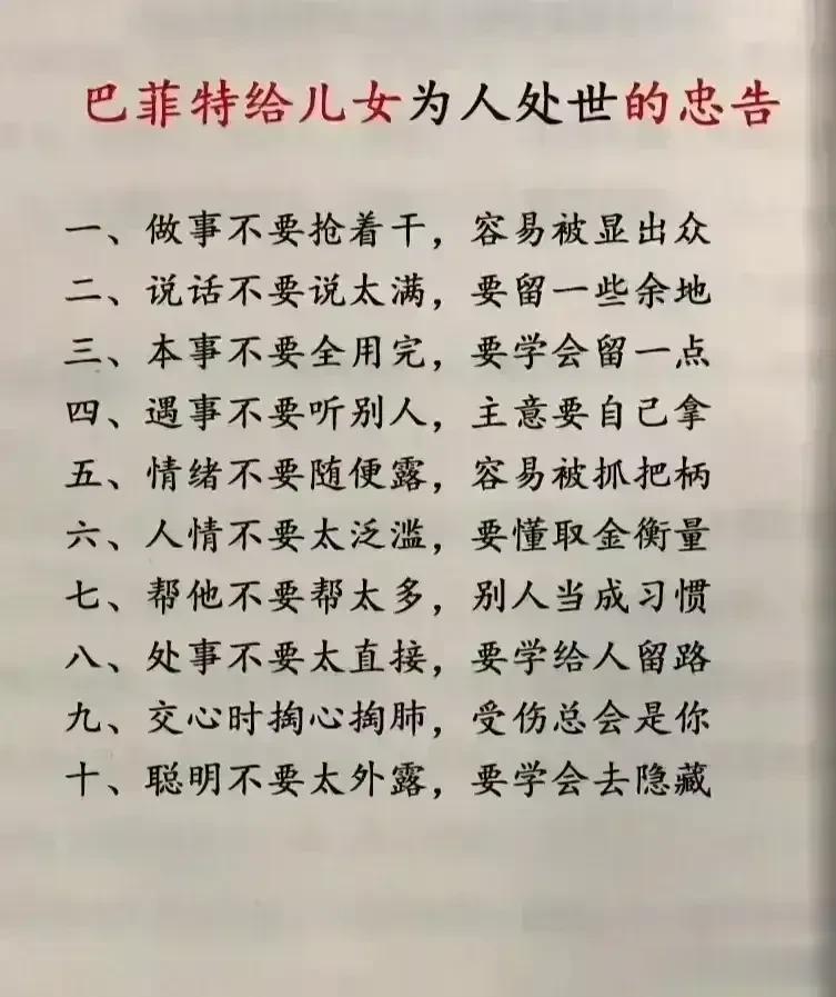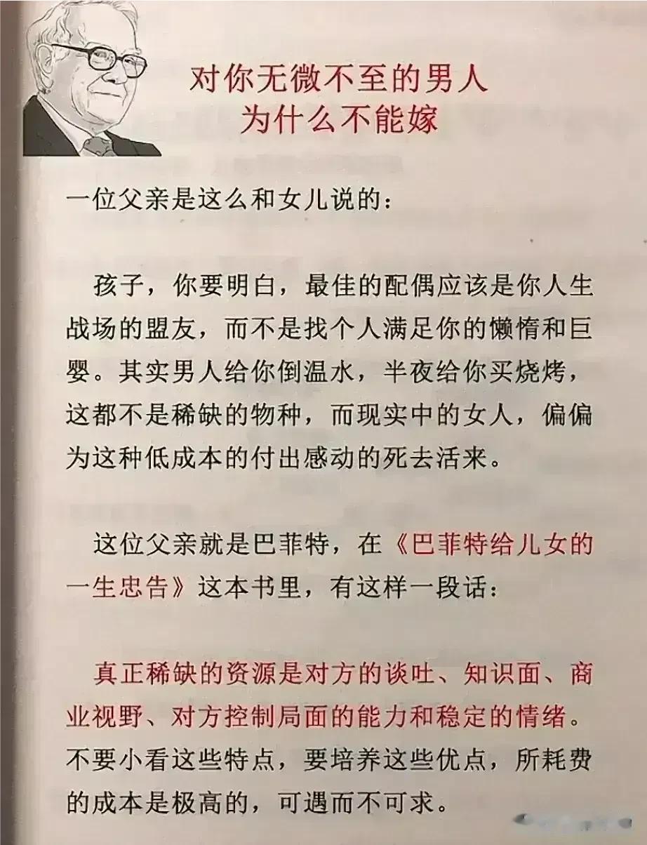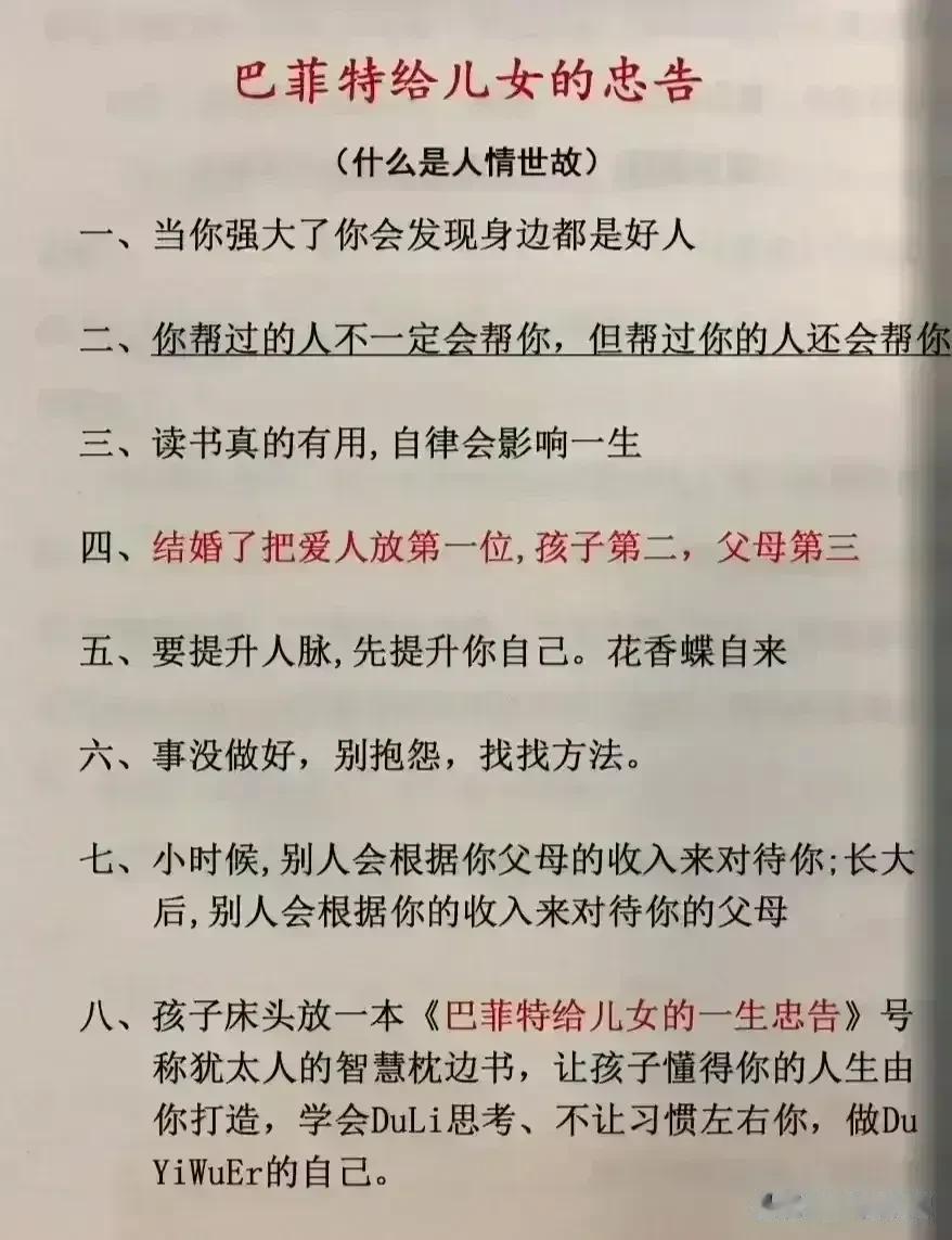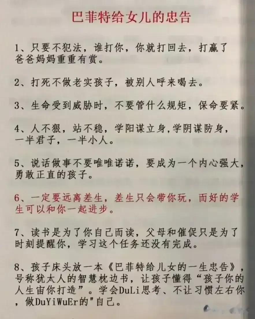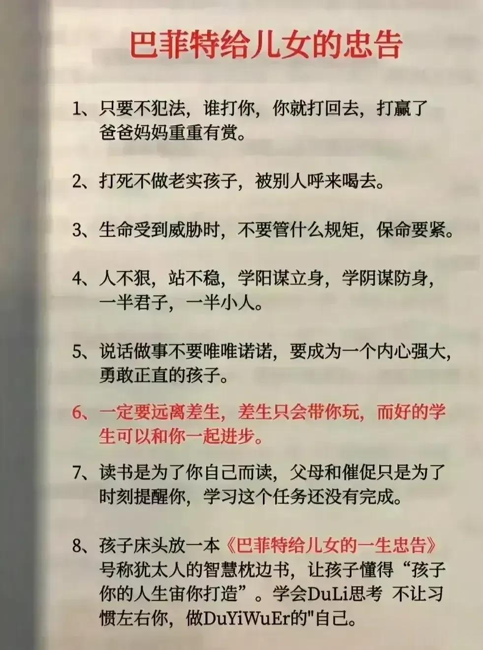 巴菲特一段让人醍醐灌顶的话,12岁之前一定要告诉孩子,长大少吃亏,每一条都发自肺腑,经典又现实,比如付出惨痛代价的五件事、给儿女的金钱观、对你无微不至的男人为什么不能嫁、给儿女为人处世的忠告等等,不愧是伟大的投资家,没想到教育孩子方面都这么优秀!赶紧学一学! 《巴菲特给儿女的一生忠告》号称犹太人的智慧枕边书,让你站在巨人的肩上更好的教育下一代。 巴菲特的忠告家庭教育