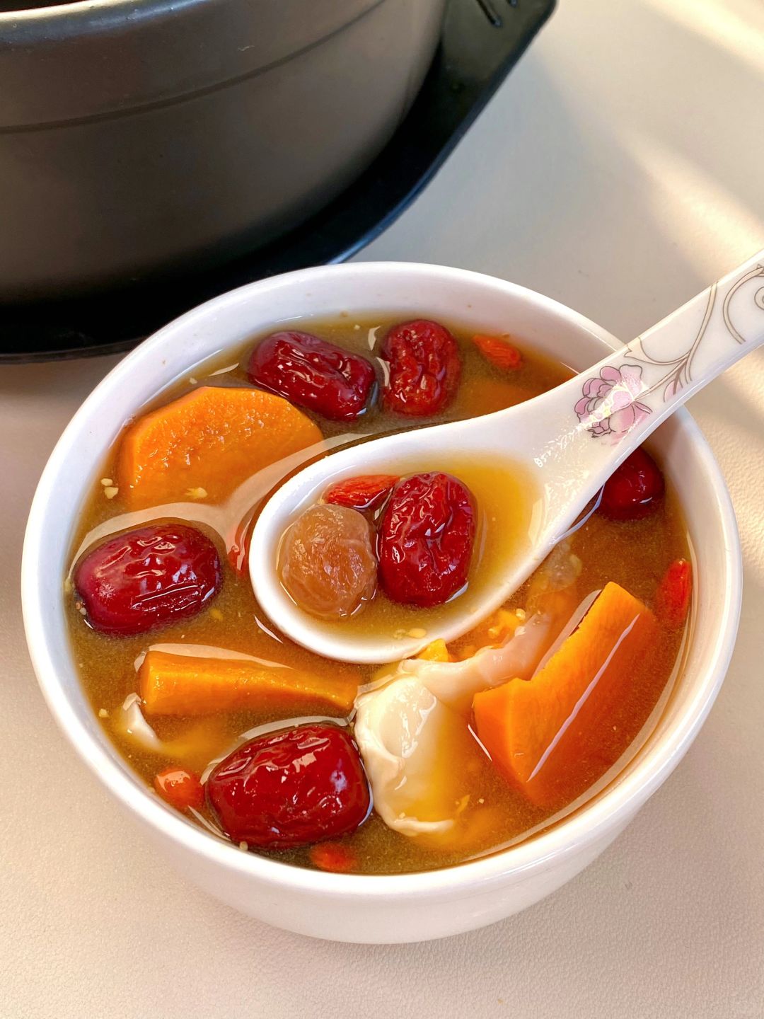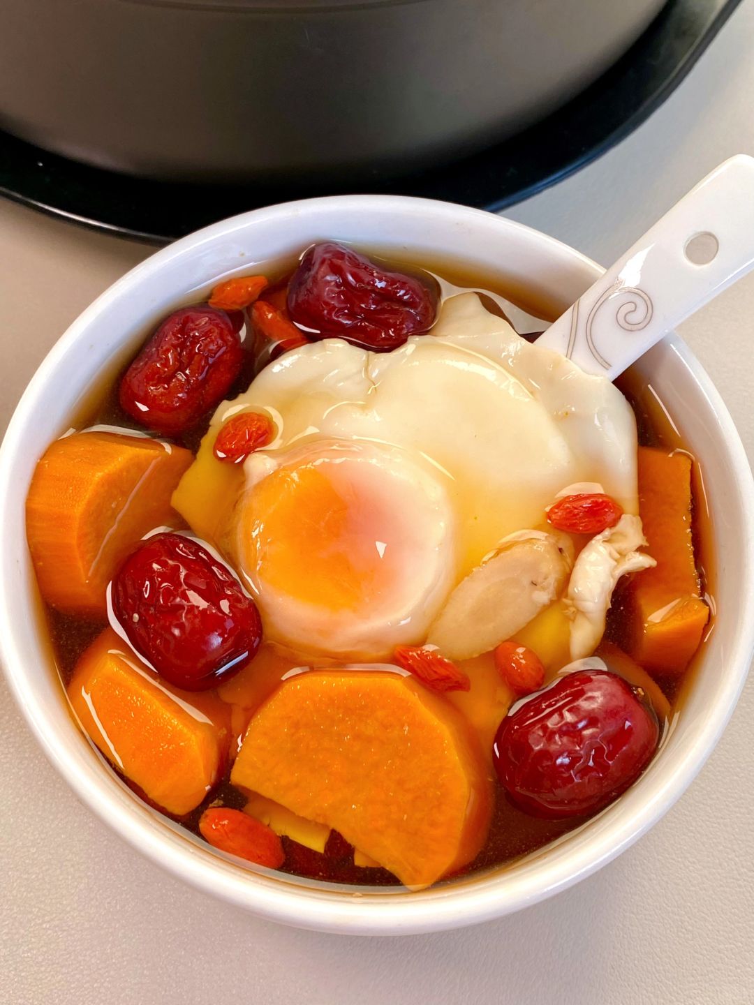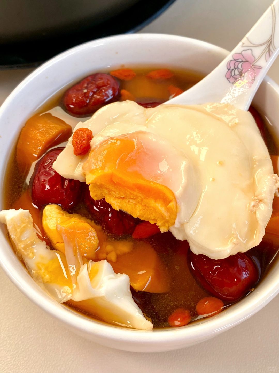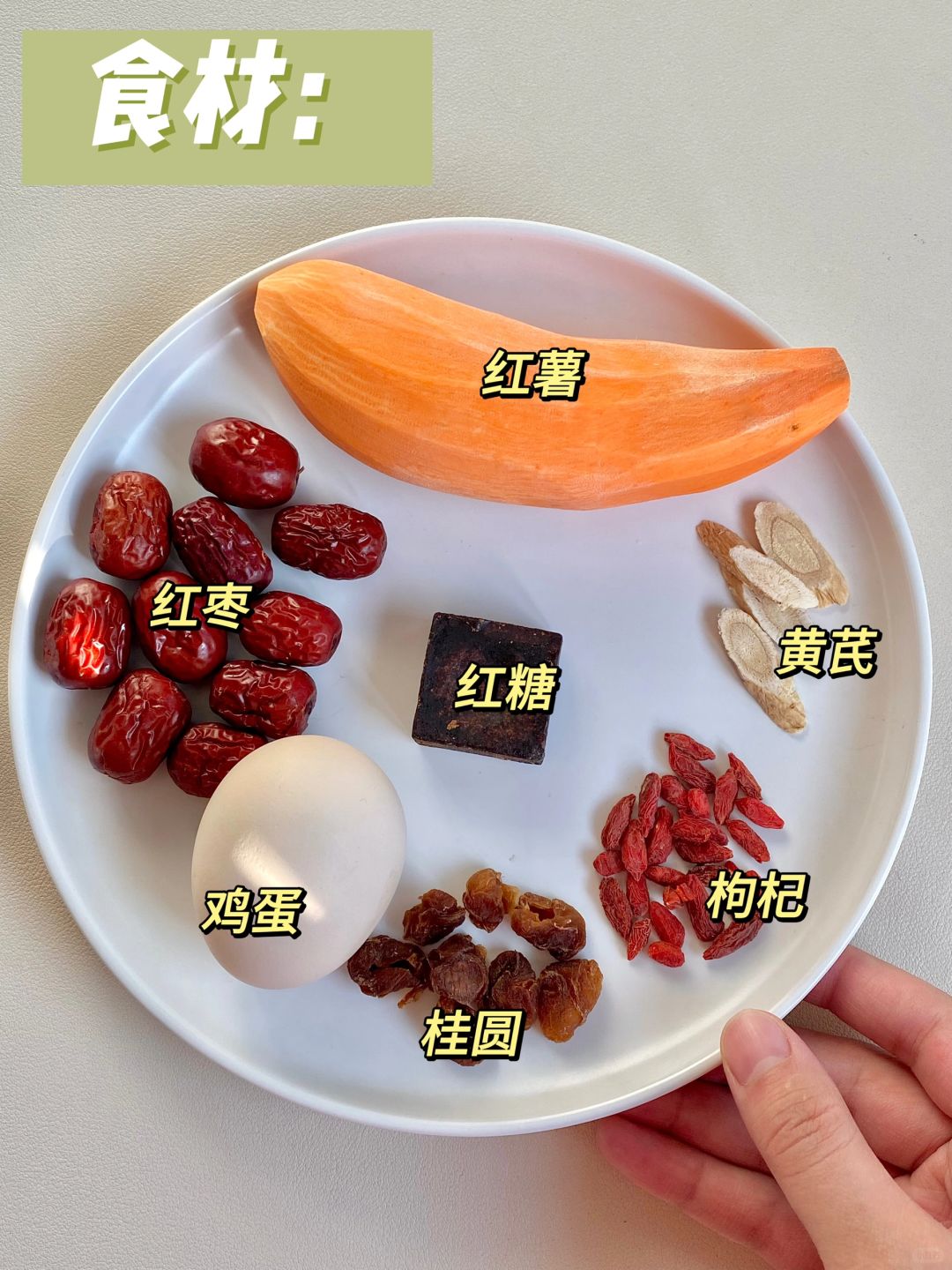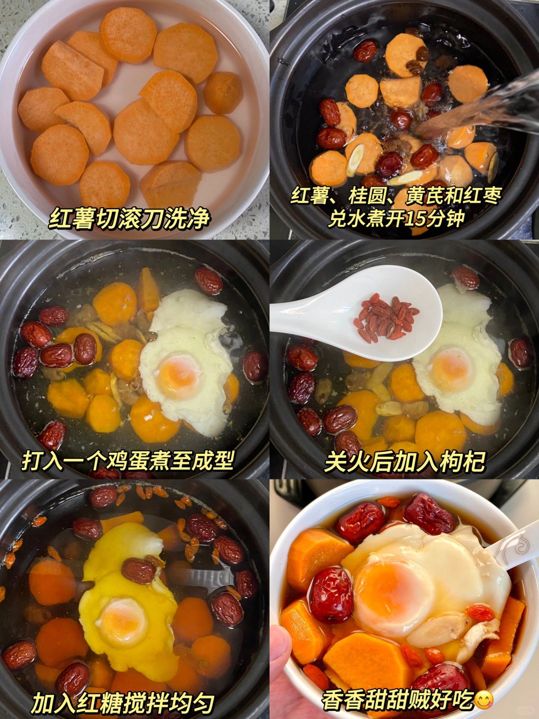 红糖鸡蛋红薯糖水!我妈喝了十几年的配方!! 香甜软糯!!女孩子多喝贼友好!! 因为我经常熬夜😭、冬天就手🦶冰冷!我妈就给我煮这个!喝一碗暖乎乎的,软糯的红薯搭配鸡蛋和红糖! 口感真的赞爆了!姨妈期就喜欢吃这个!! 📝食材:红薯、红枣、红糖、枸杞、鸡蛋、黄芪、桂圆 ✔️做法: ❶红薯切滚刀洗净 ❷红枣、红薯、黄芪、桂圆兑水煮开15分钟 ❸打入一个鸡蛋煮至定型 ❹关火加入枸杞和红糖搅拌均匀即可 香香甜甜的红枣和粉糯的红枣,真的好好吃! 坚持喝小脸🧏🏻♀️红润润哒~