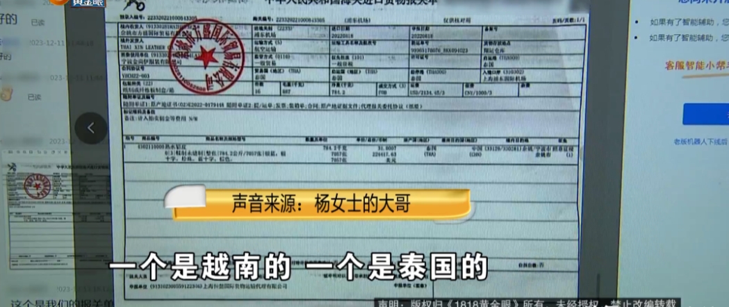 杨女士先是质疑衣服不是用的真水貂皮,接着又质疑不是进口的,但朱先生提交了厂家的报关单,通知让杨女士去质检。