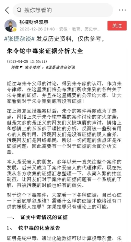 我觉得无单宏还是不要参与朱令案的好,因为劳荣枝案给人"想火一把"的映像还没消除,难于让人产生"又想来火一把"的感觉,还是沉淀一下吧。