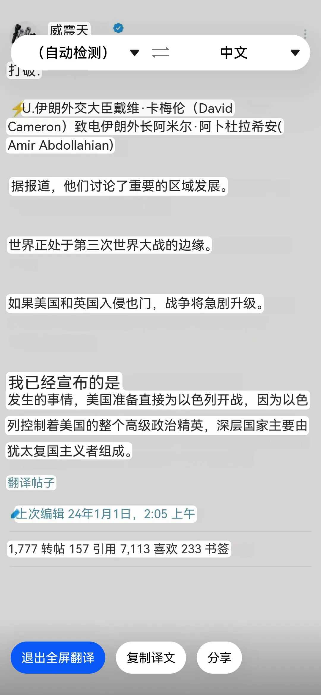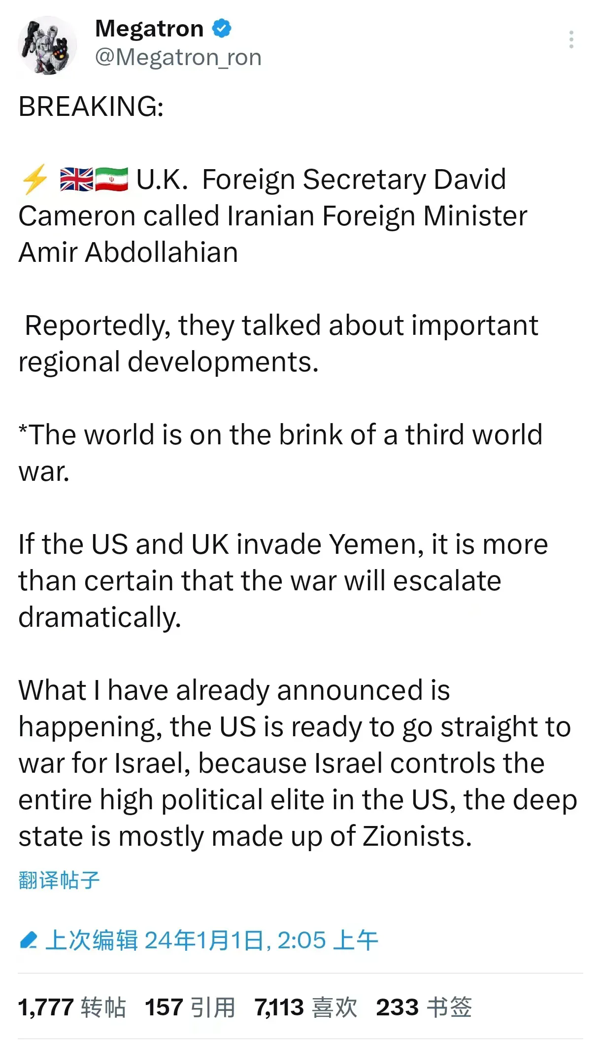 当地时间1月1日,英国外交大臣卡梅伦致电伊朗外长阿卜杜拉希安:世界正处在第三次世界大战的边缘。如果美国、英国入侵也门,战争会急剧升级。我要说的是,美国准备直接为以色列开战,因为以色列控制着美国的整个高级政治精英阶层,政府高层大部分主要由犹太复国主义者组成。