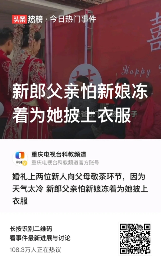 “这个公公火出圈了!”河南,室外婚礼现场,两位新人给父母敬茶时,公公看到天气太冷,害怕把新娘冻着,主动脱下外套赶紧给她披上,刚要坐下时,看到衣服没披好,再次起身帮忙整理好。网友:这位爸爸知道心疼女儿!