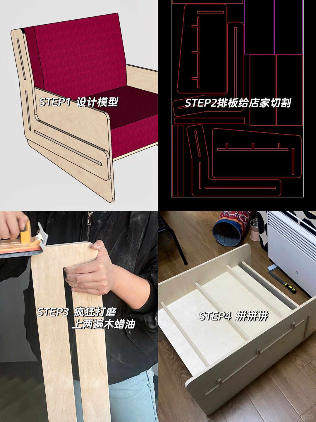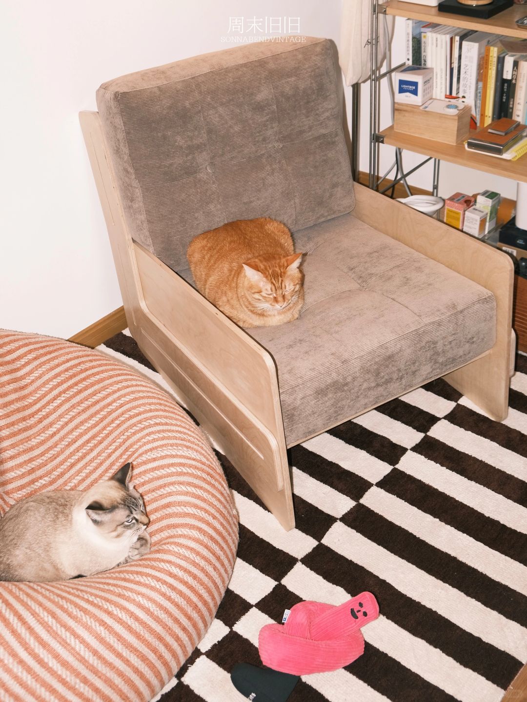 🪚周末手工 | 这下谁还分得清我和鲁班 我宣布海洋板才是成年人的乐高! 书架旁边之前只有一张懒人沙发,常年被猫咪恶霸强占,那就自制一张单人沙发椅吧海洋板+沙发垫定制合计500左右就完成了中古style单人椅!然后,又一次迅速被霸占