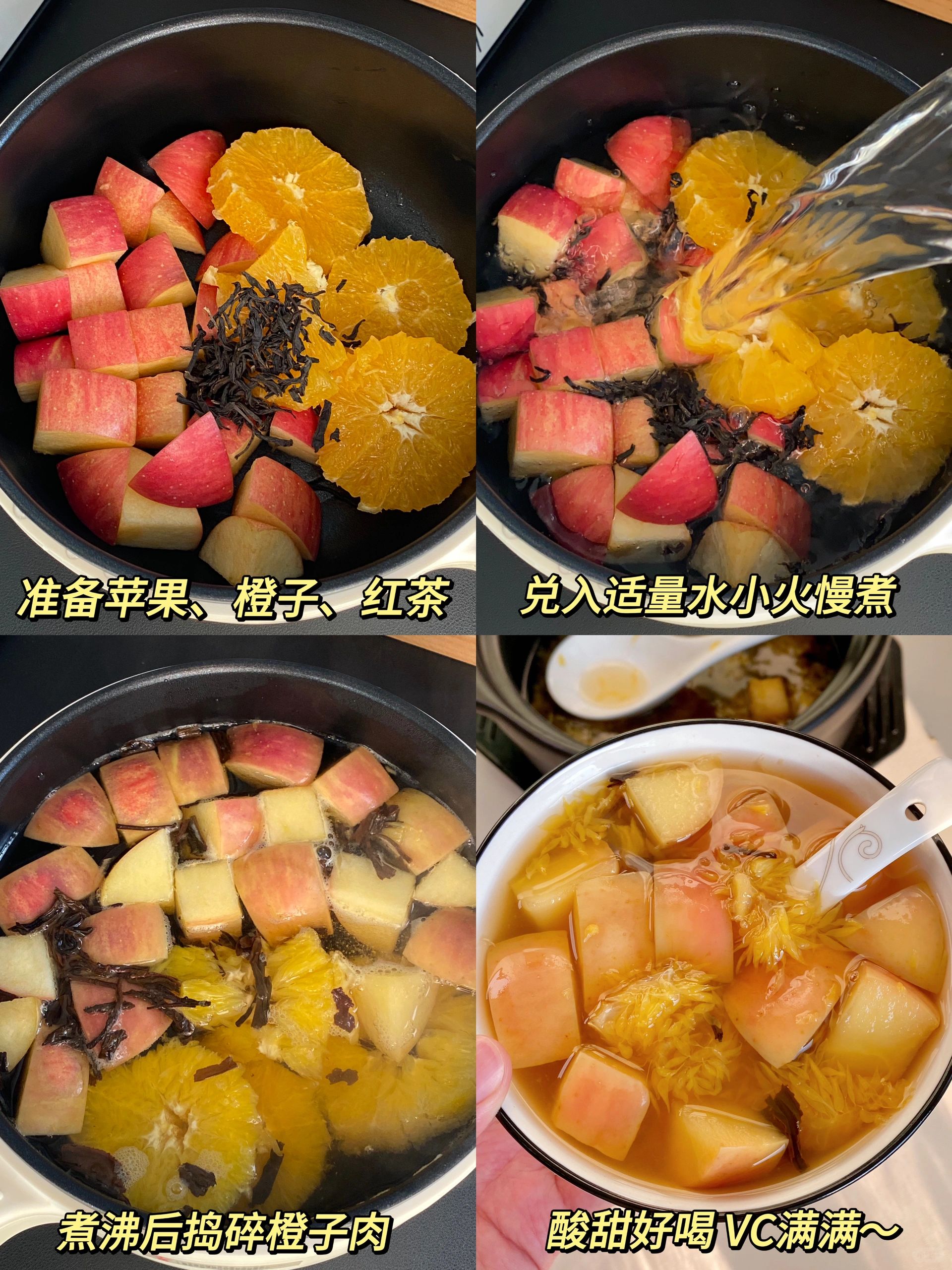苹果热橙茶!!熬夜人的回🩸水!! 我连着喝了三天…比面膜还绝了😭 满满的VC!酸酸甜甜的!消食解腻!还滋养气色! 煮熟的橙子和苹果营养价值高,很适合女孩子!! 📝食材:苹果、橙子、红茶 ✔️做法:苹果切块,橙子切片去皮,加一把红茶兑入适量水,小火慢煮,煮沸后捣碎橙子肉即可 冬天真的很适合这样热腾腾的热饮!! 大餐后来一杯清爽解腻!一家人都爱喝!快试试吧~