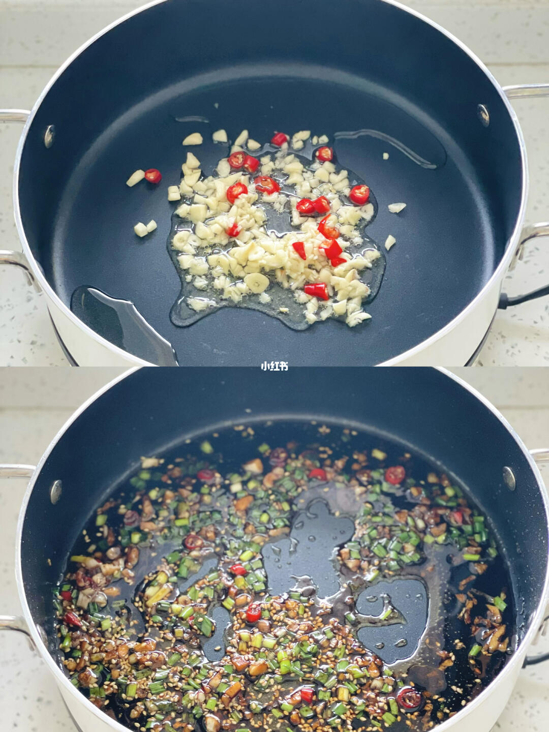 1️⃣小米辣、蒜末一起下入锅中用油炒香