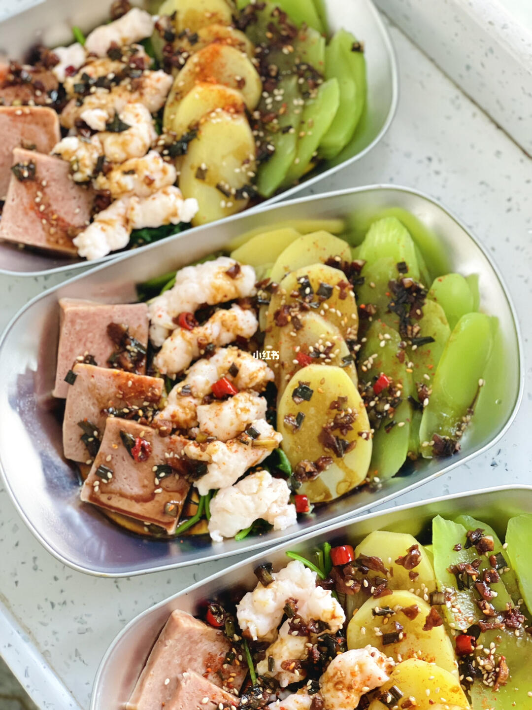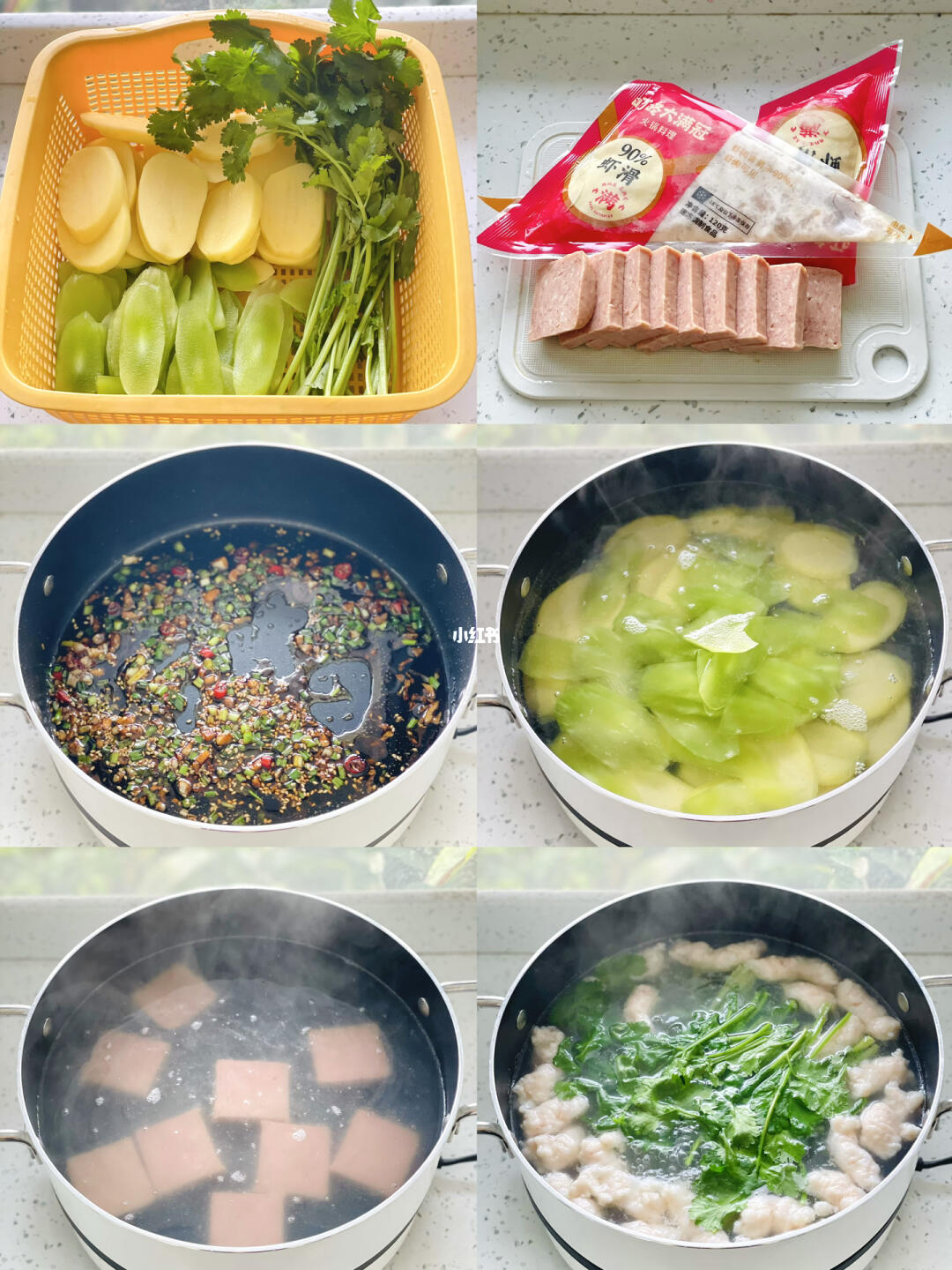 4️⃣土豆片、莴笋片、午餐肉、虾滑、香菜分别烫熟