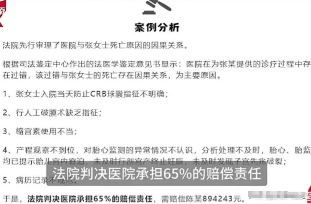 在与医院的医疗损害责任纠纷一案中,因经鉴定,医院存在产程观察不到位、未及时行剖宫产终止妊娠,未及时发现子宫先兆破裂、病历记录不规范等错过,法院最终判决医院承担65%的赔偿责任,判决医院赔偿张女士丈夫陈某、子女等共计89万余元。